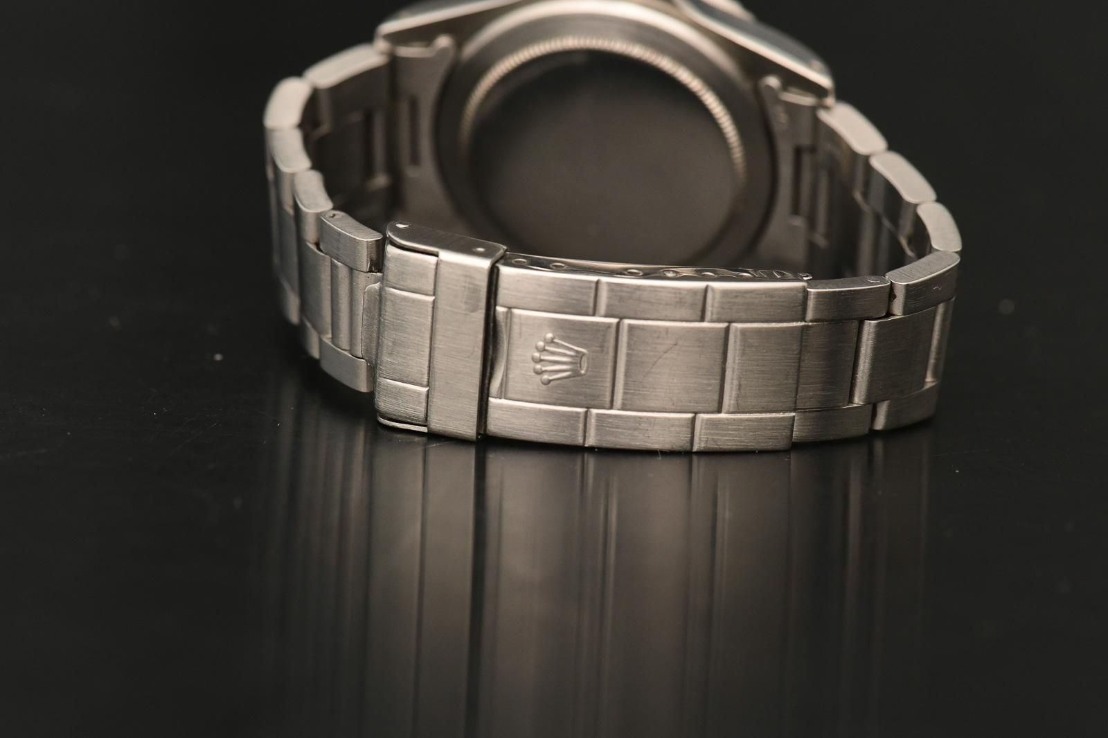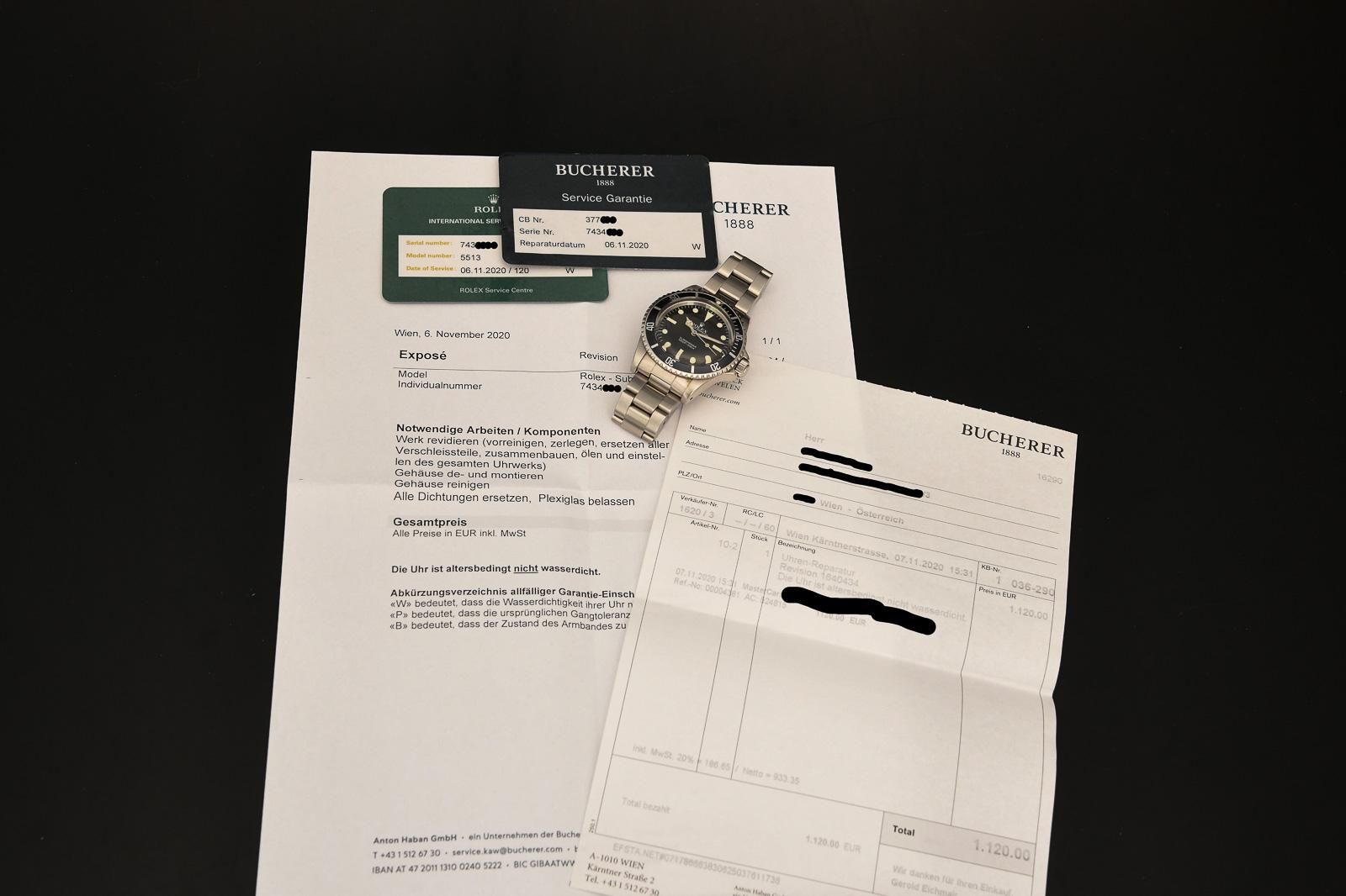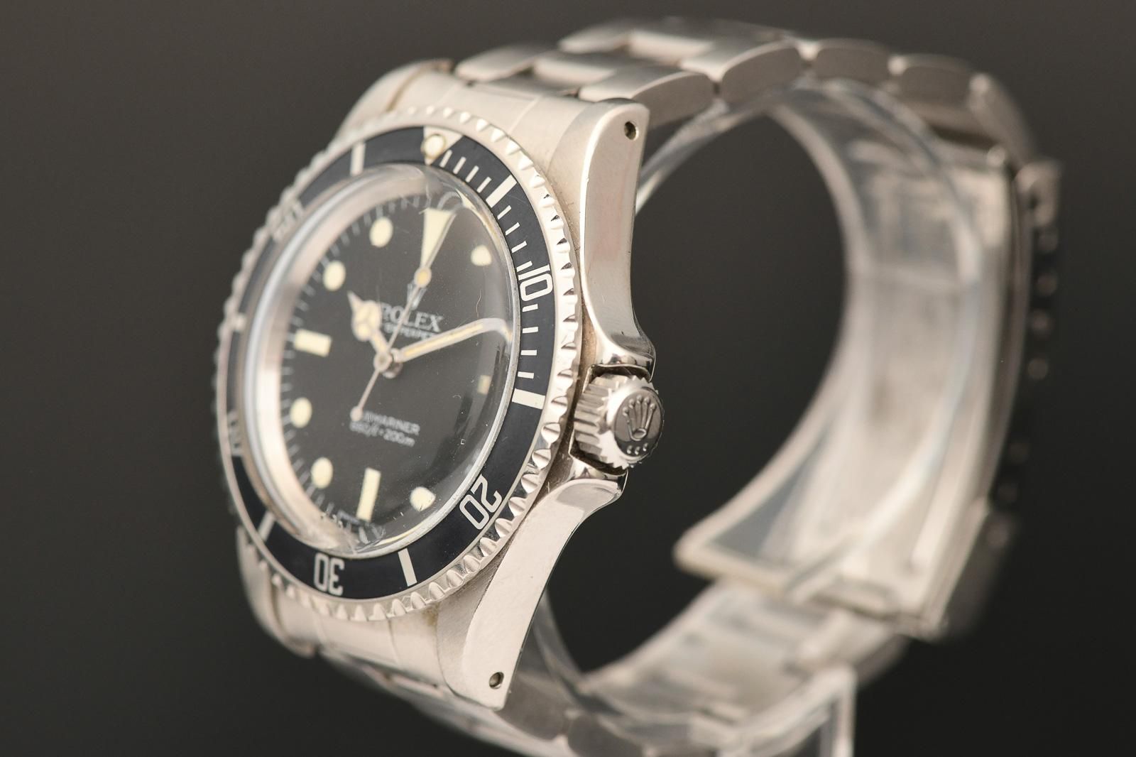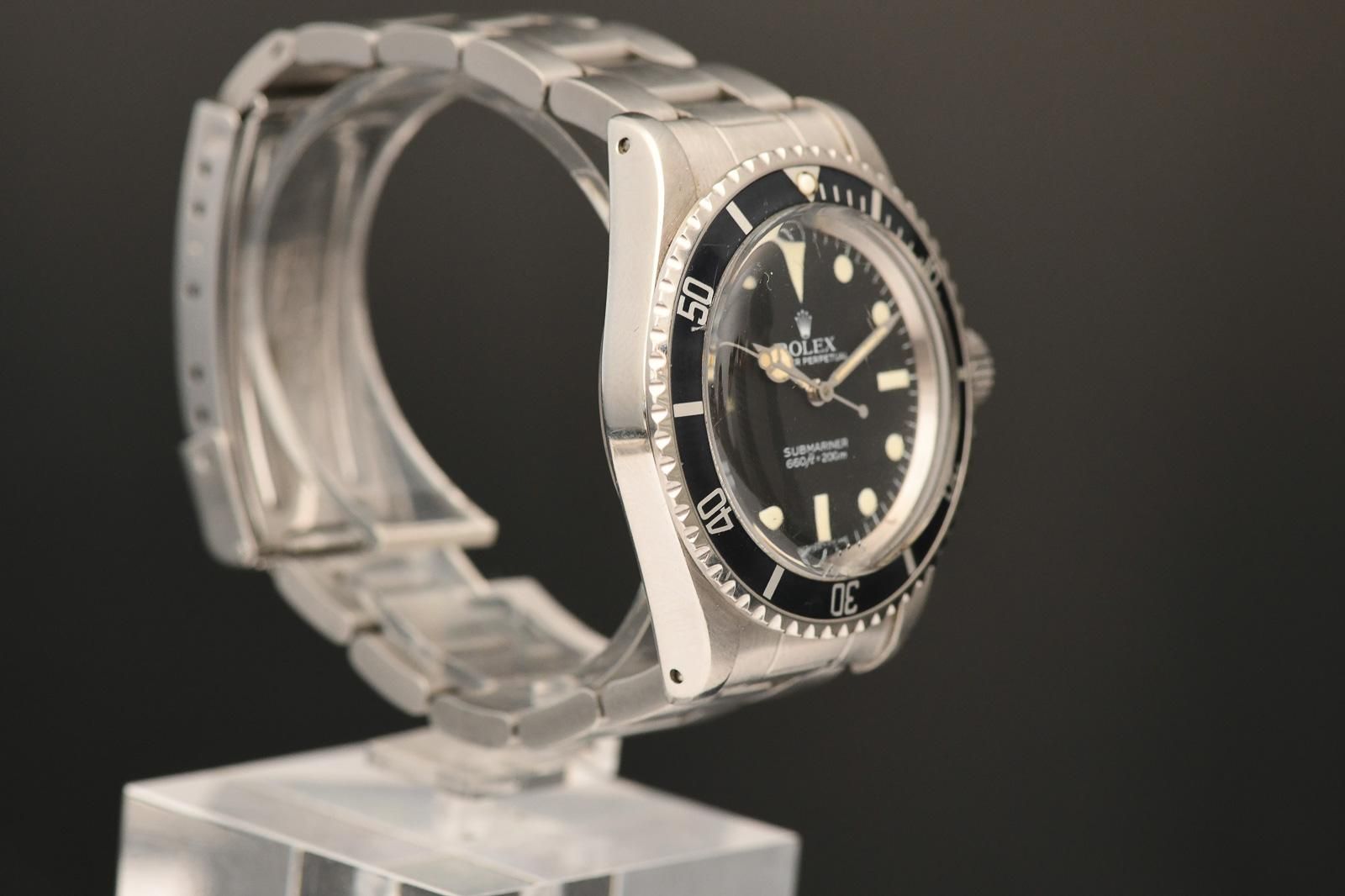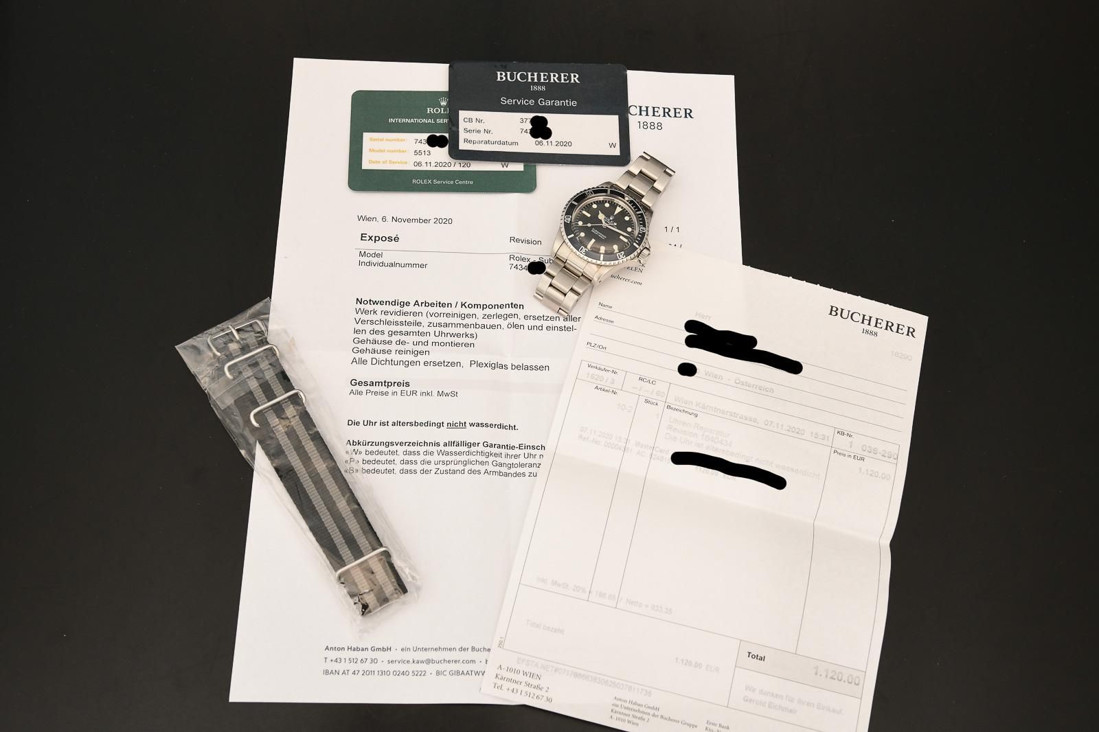 ROLEX 5513 1982 Rolex Submariner with Rolexservicepapers. Very nice Rolex Submariner without date, reference 5513, this is an MK5 Maxi Dial version from 1982. The watch had a Rolex service at Bucherer in Vienna in November 2020. The invoice and service cards accompany the watch. In addition to the original 93150 bracelet with clasp code G (1982), a new NATO strap is also included. The dial and hands are original and still have the original tritium luminous material. The pearl on the bezel is SL filled but color-matched. The Mk3 bezel has a beautiful color and fades slightly into blue. The glass has small scratches at 6 o’clock but can be replaced with a new one at no extra charge. The watch has excellent amplitude and will not require servicing in the near future.