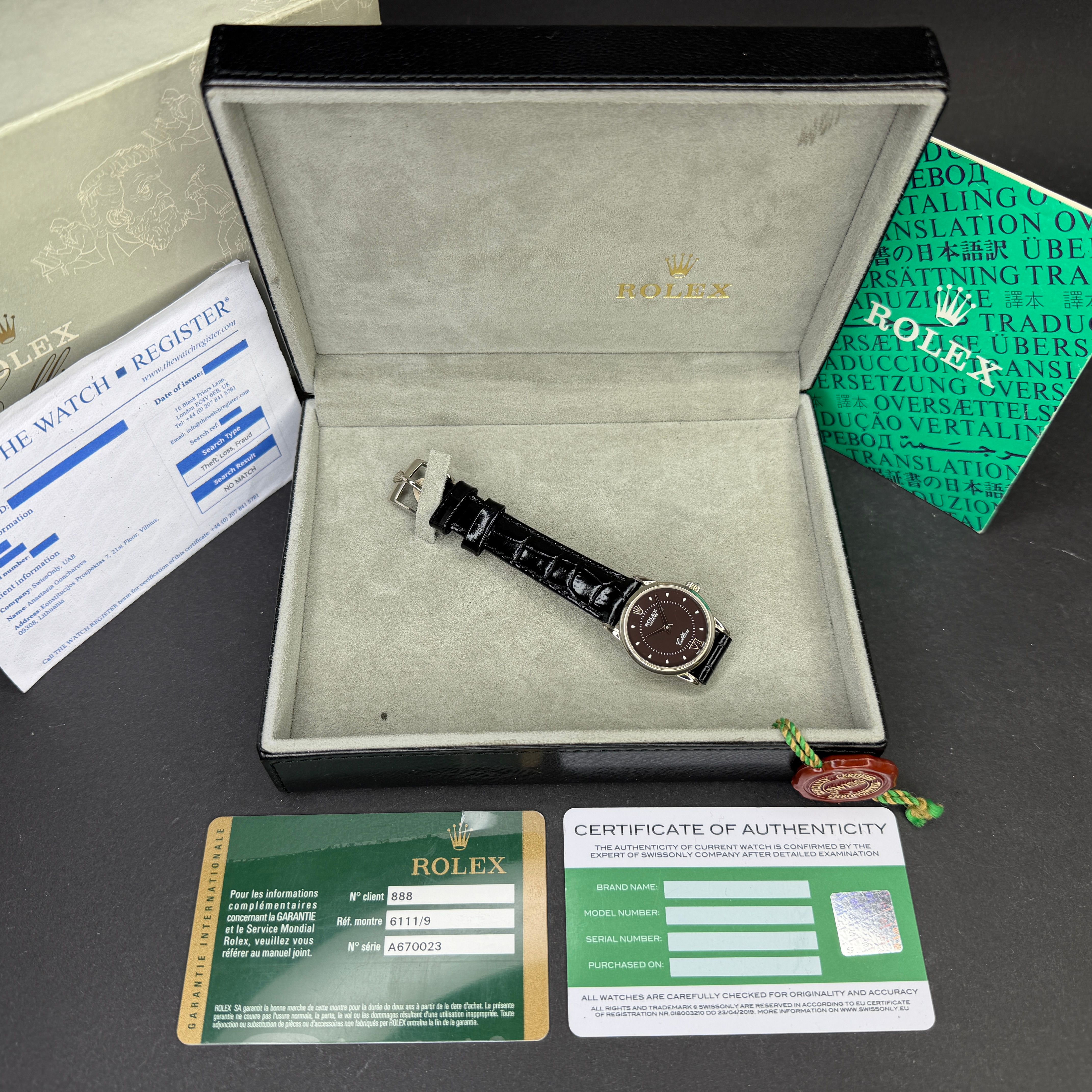 Rolex Cellini Rolex Cellini, 6111/9, 25mm, 2011, White gold, Black Roman dial, Fullset, 1y warranty