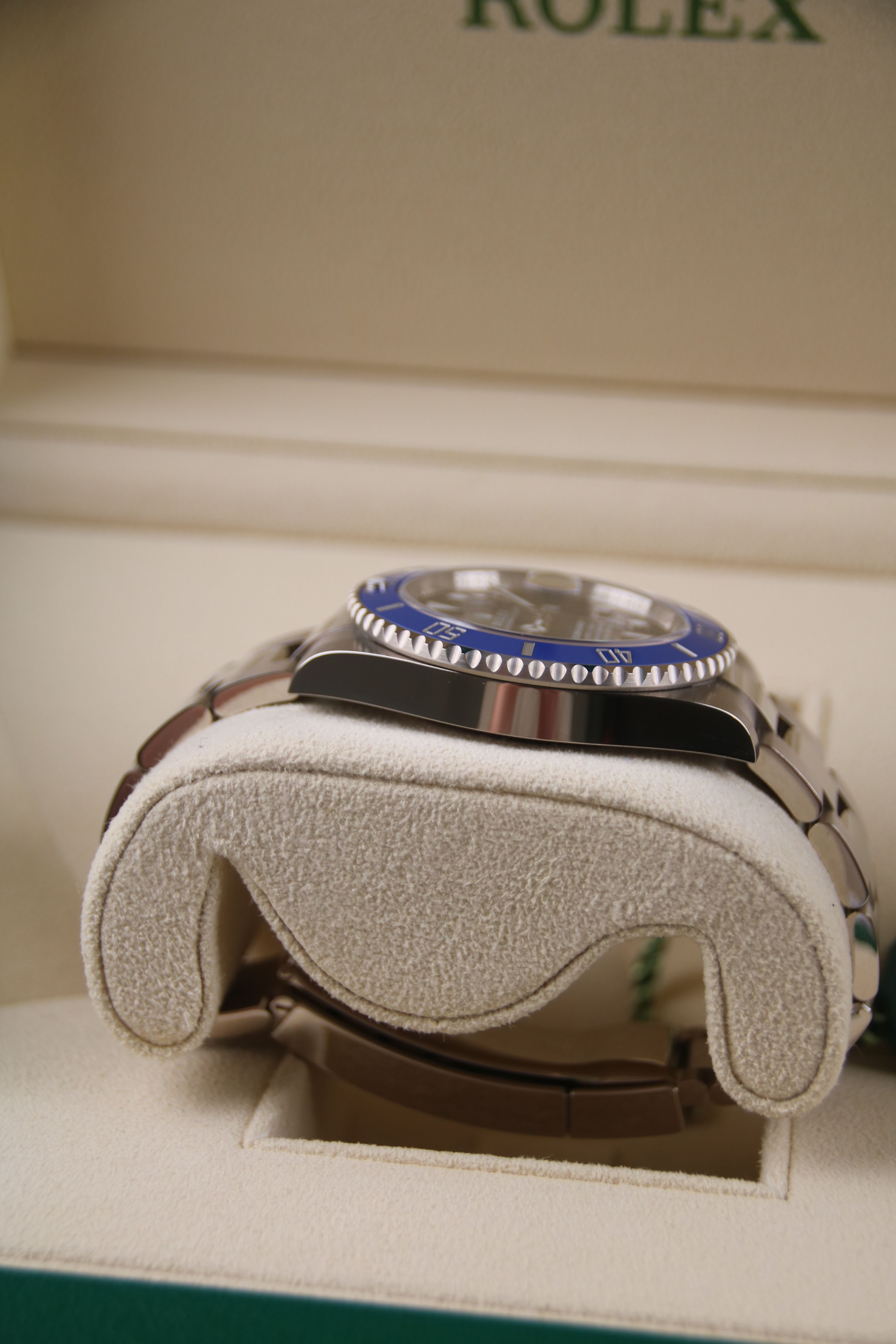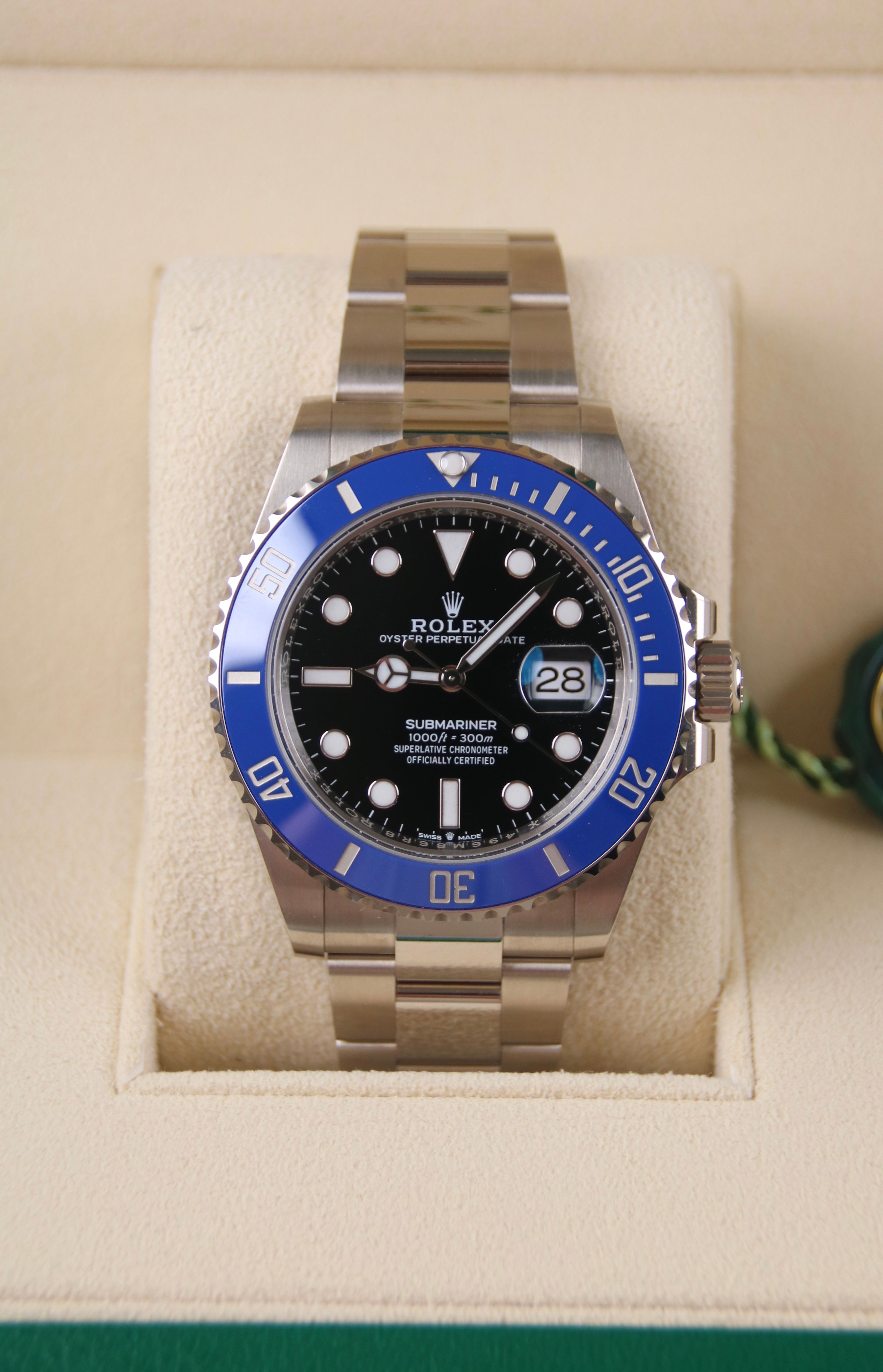 Te koop is een gloednieuwe en ongedragen Rolex Submariner Date in witgoud met opvallende blauwe bezel. Het horloge wordt geleverd als een volledige set inclusief doos, papieren en hangtags etc. Dit horloge is in december 2023 gekocht bij de erkende winkelier. Rolex garantie tot december 2028.