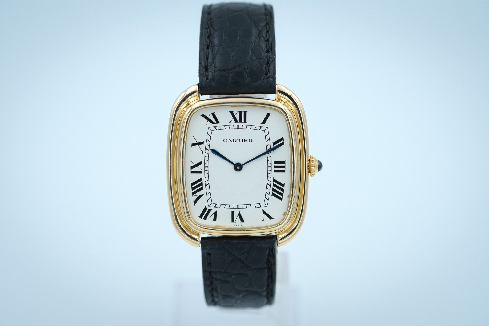 The original 18K Cartier folding clasp is attached to the watch. The old leather strap from the Cartier concessionaire is also still present. A new strap will be supplied with the order.