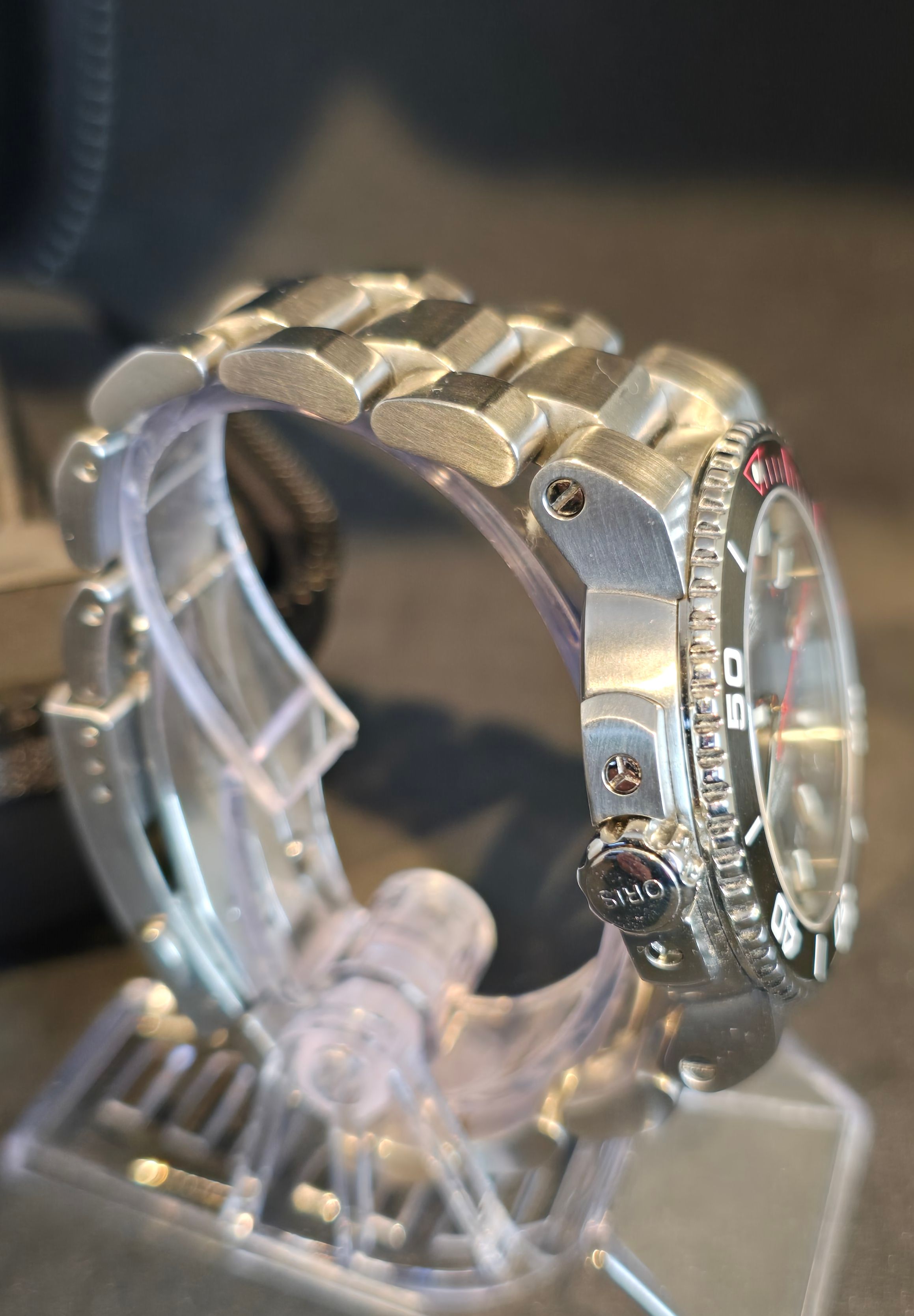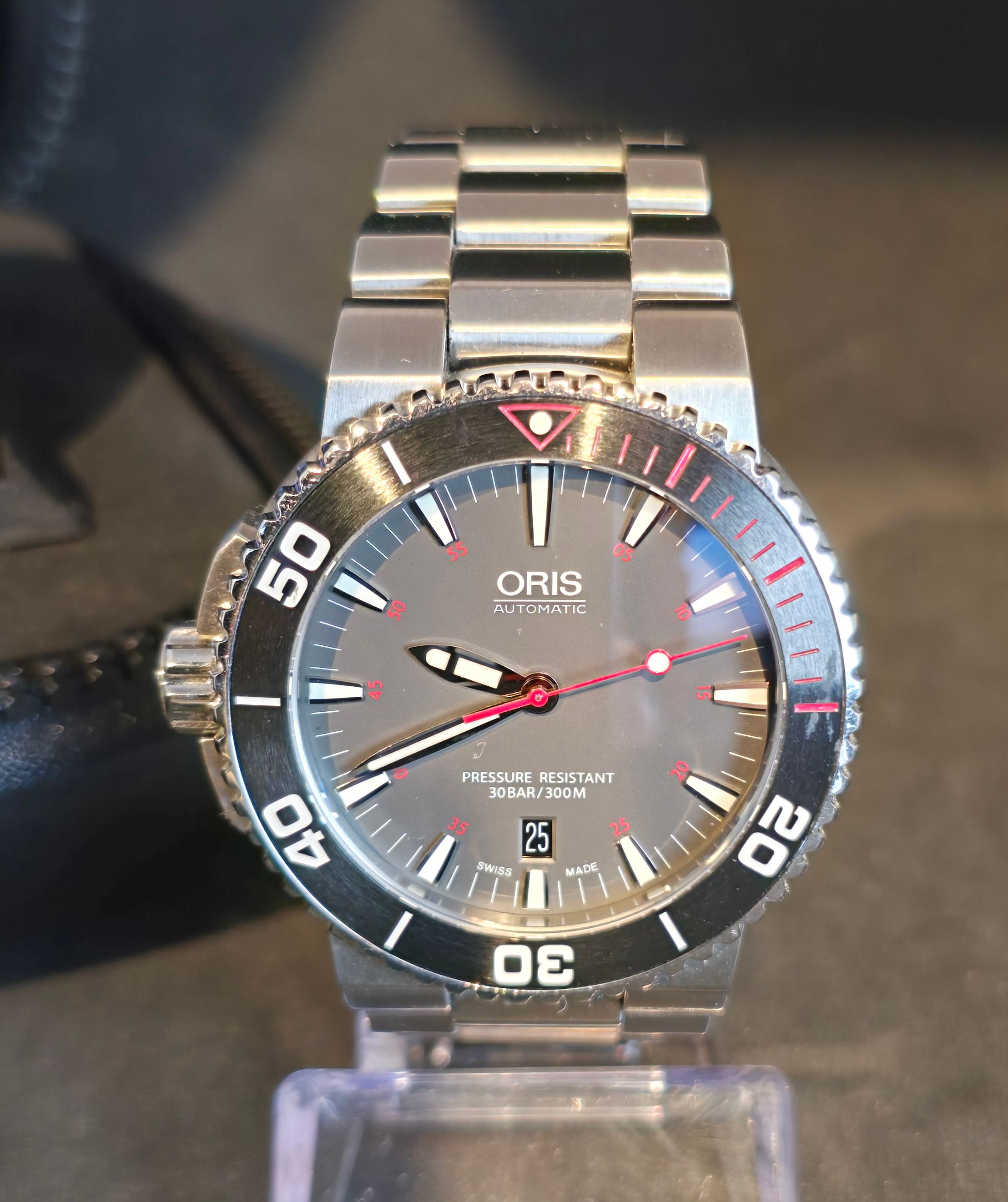 Hij zit in een grote roestvrijstalen kast van 43 mm en heeft een rood-zwarte wijzerplaat met een diep kleurverloop, geïnspireerd op het levendige koraal van de Rode Zee. De unidirectionele draaibare lunette, schroefkroon en 300-meter waterdichtheid maken het een professionele duiker. Het wordt aangedreven door het Oris Calibre 733 automatische uurwerk, heeft een gangreserve van 38 uur en een datumfunctie op 6 uur.