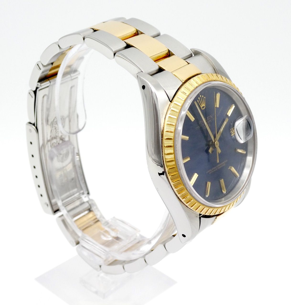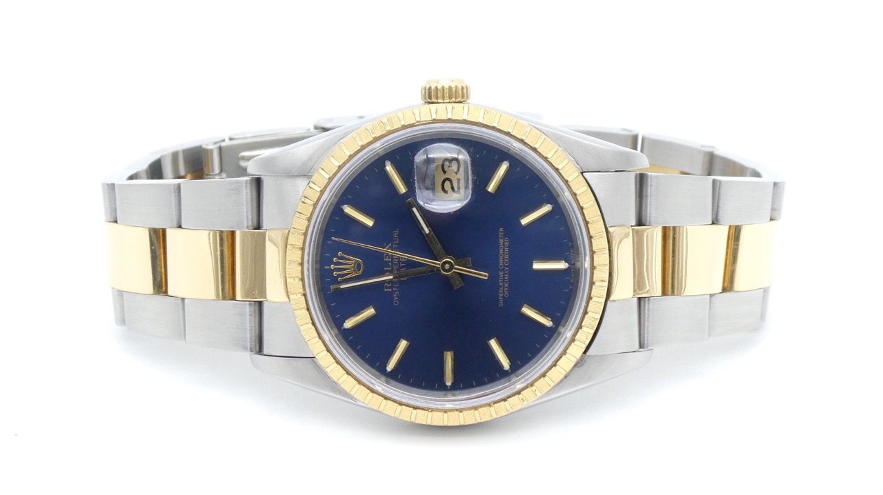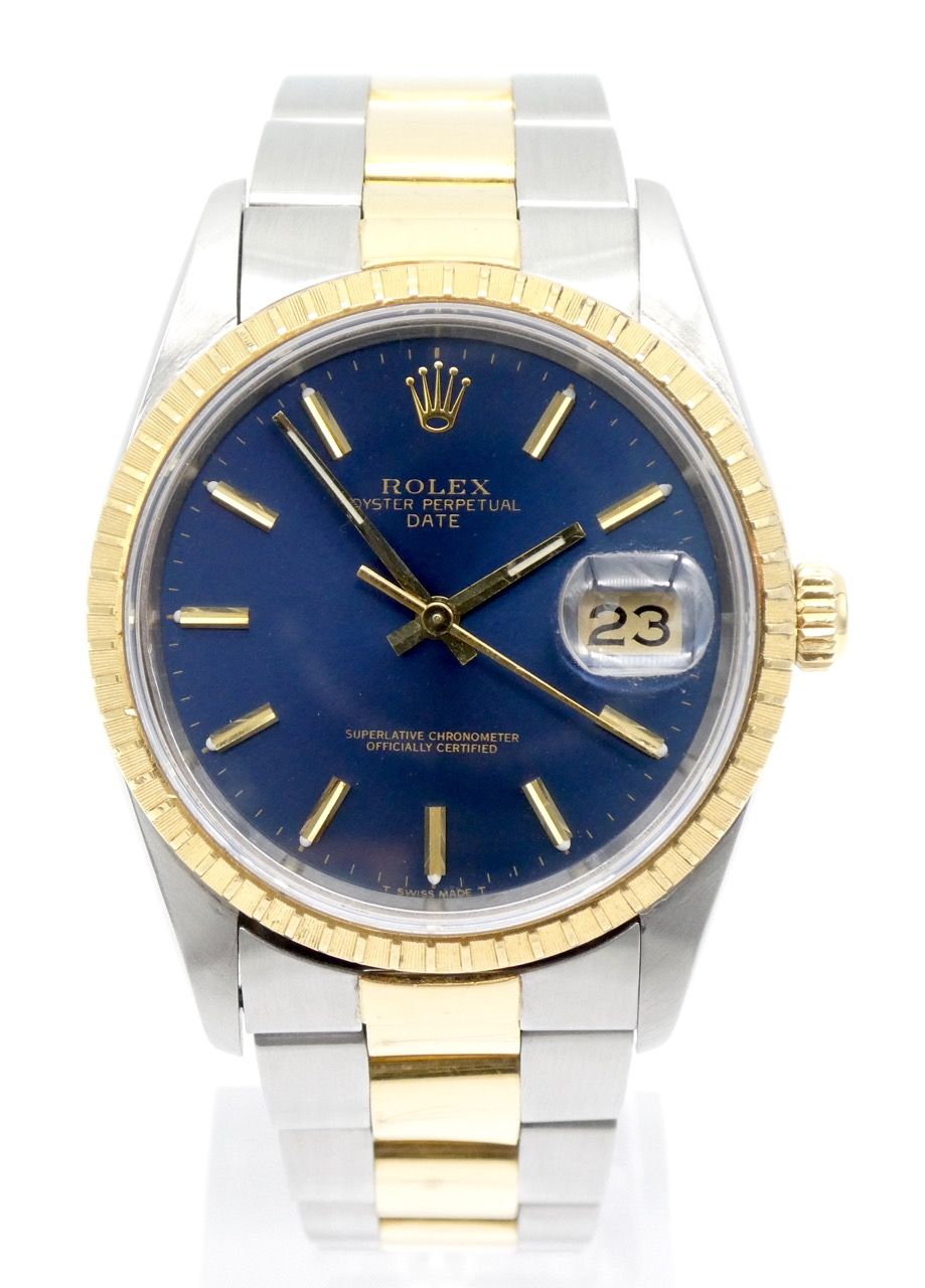 Rolex Oyster Perpetual Date Rolex Oyster Perpetual Date 15223 in a very good condition. Beautiful blue dial in a gold/steel case with yellow gold bezel.