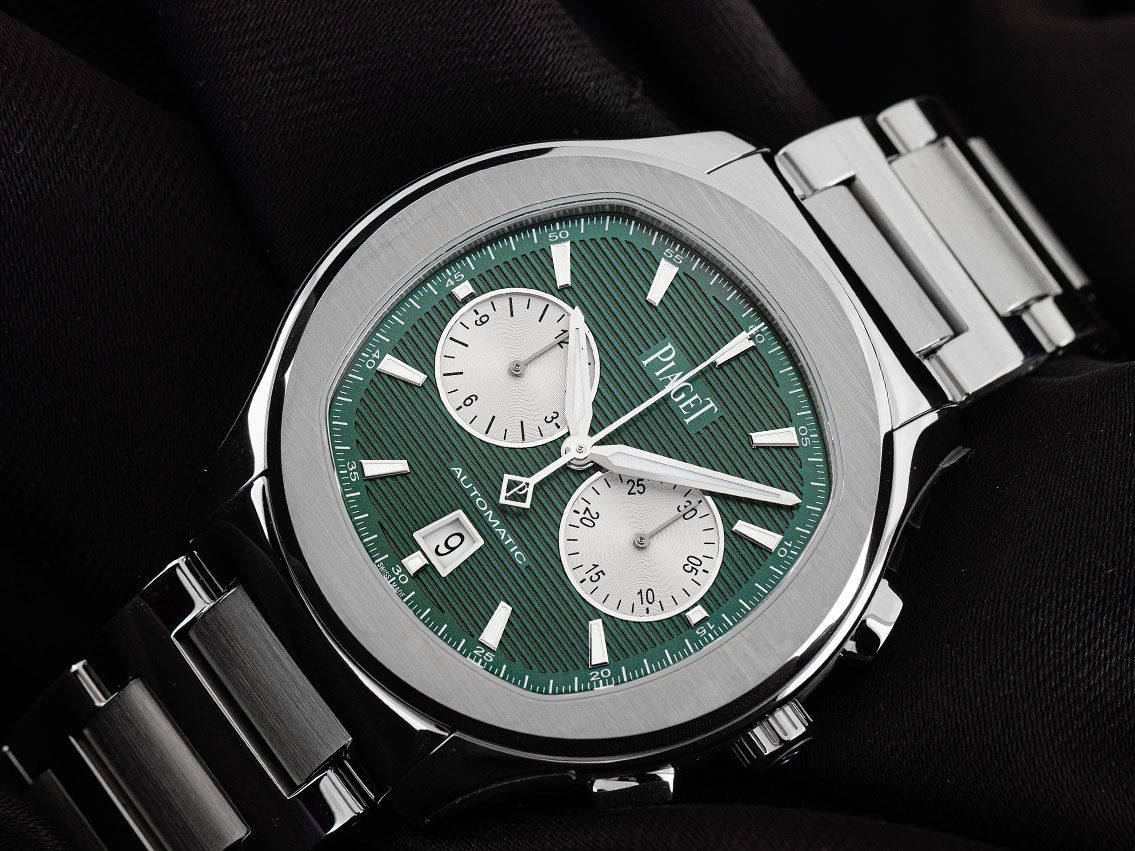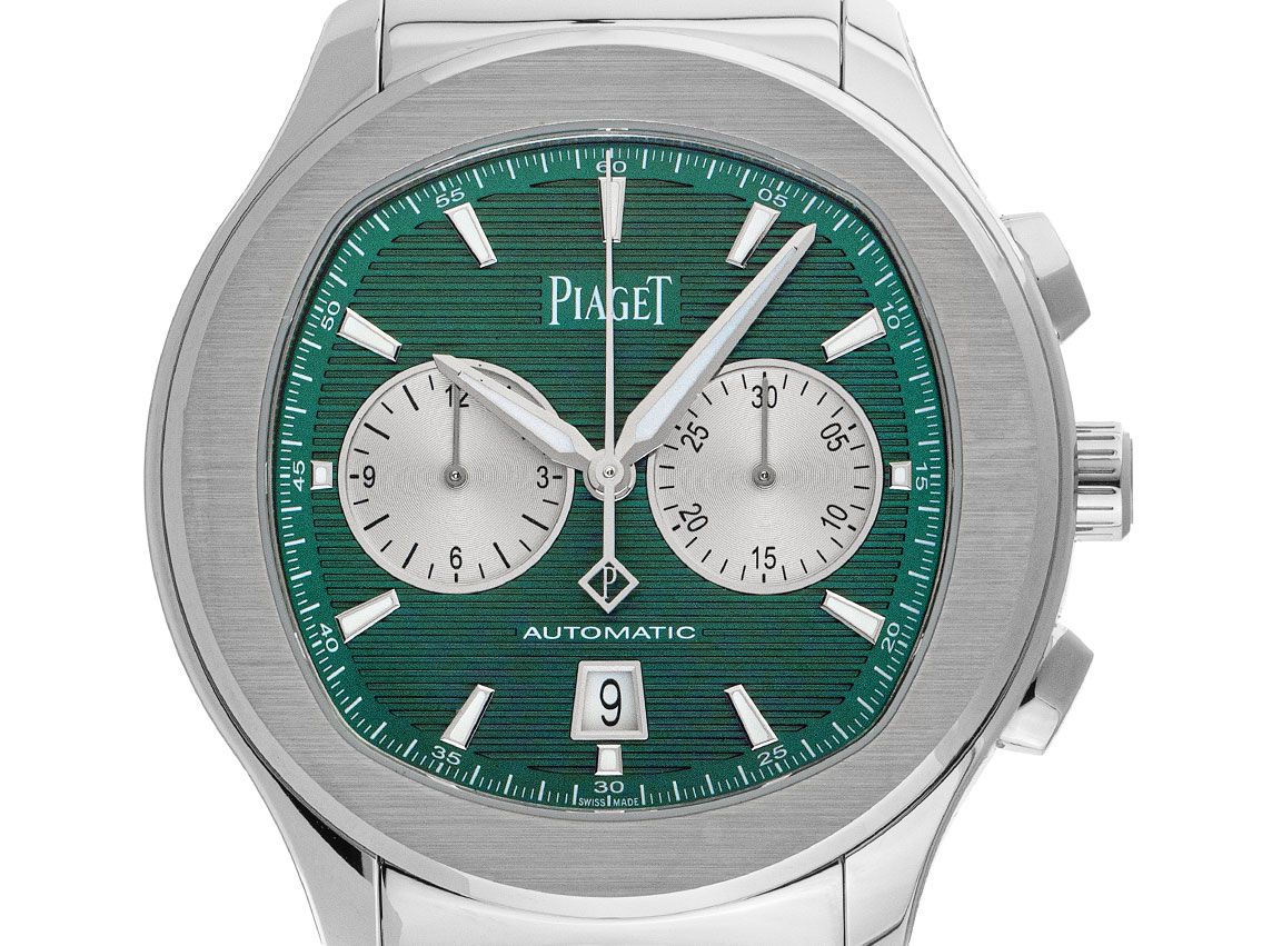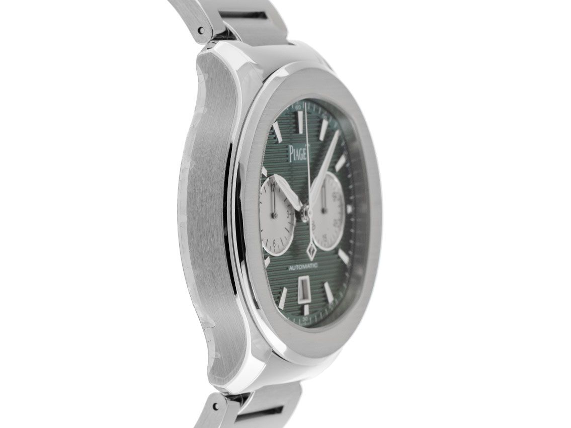 Piaget Polo Stahl Automatik Chronograph Armband StahlGehäuse Edelstahl poliert und satiniert, Gehäusedurchmesser ohne Krone 42mm, Gehäusehöhe 11,2mm. Lünette Edelstahl poliert und satiniert. Armband Edelstahl poliert und satiniert, Doppelsicherheitsfaltschließe Edelstahl mit Hersteller-Logo. Zifferblatt grün guillochiert mit aufgesetzten Leuchtindexen und Leuchtzeigern. Uhrwerk Automatik, Chronograph, Kaliber Piaget 1160P mit 35 Edelsteinen, Gangreserve ca. 50 Stunden. Anzeige von Stunde und Minute über Zeiger aus der Mitte, Datumsanzeige mit Schnellverstellung bei 6 Uhr. Saphirglas kratzfest. Krone mit Hersteller-Logo. Boden Edelstahl 6-fach verschraubt und graviert mit Saphirglas Sichtfenster. Gewicht der Uhr inklusive Armband 173g, Länge des Armbandes inkl. Gehäuse 205mm. Referenznummer: G0A49024, ID: ST1160301981224H-21000, Artikelnummer: 10000077705. Original Piaget Box mit Umkarton und Garantie Papiere von Dezember 2024, Full Set. Ungetragen. Lieferzeit sofort.