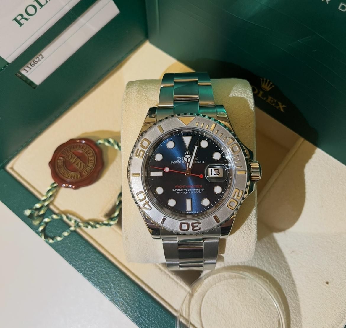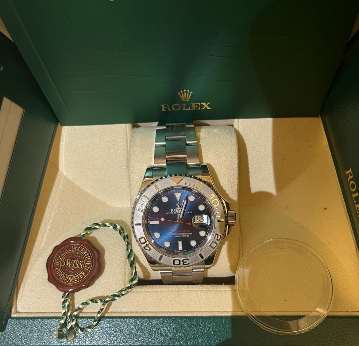 Beautiful Rolex Yacht-Master 40 with the popular blue dial.This luxurious and sporty model features a platinum bezel and an Oyster bracelet, giving it a bold and stylish appearance. The watch is in excellent condition and comes as a complete set, just as originally delivered by Rolex.
