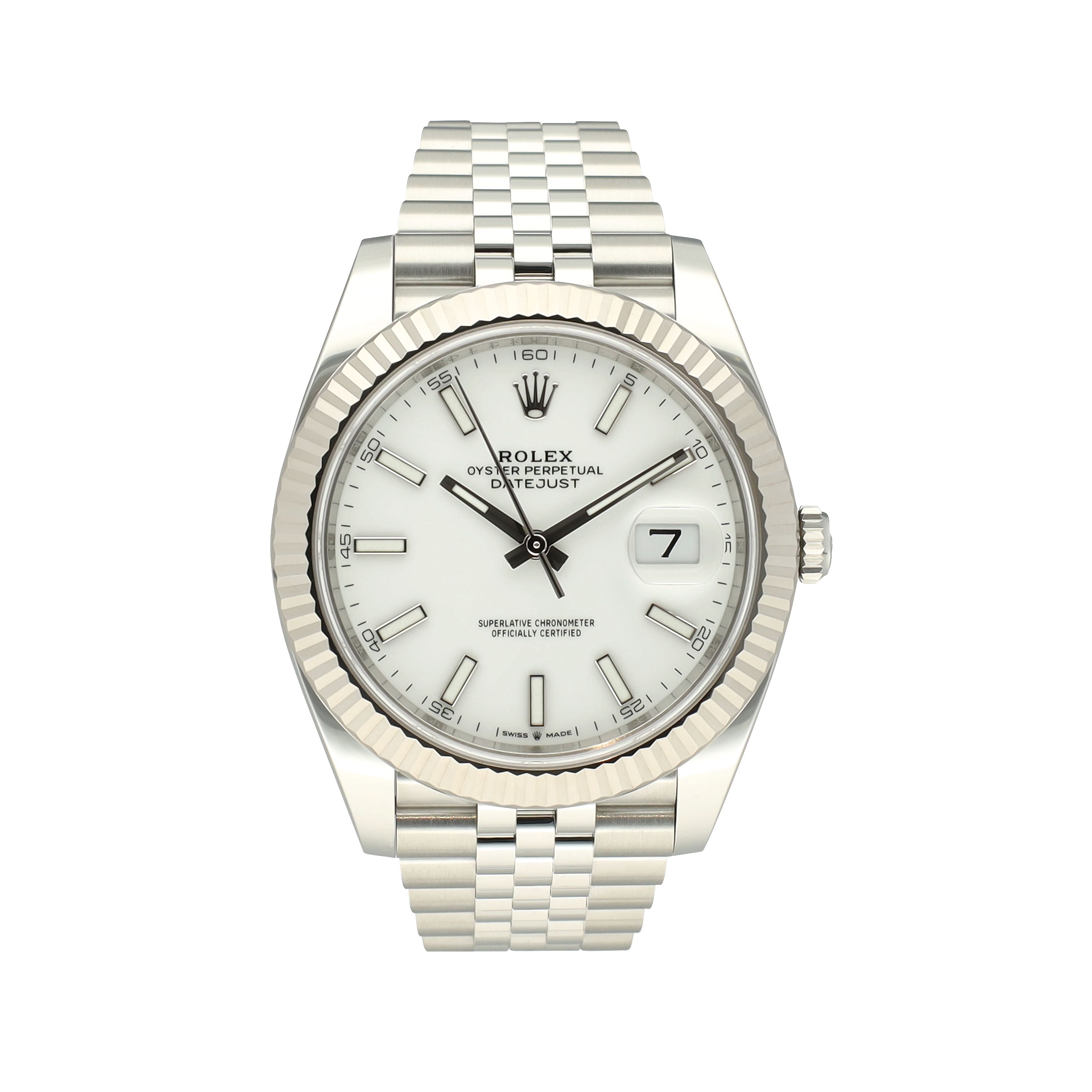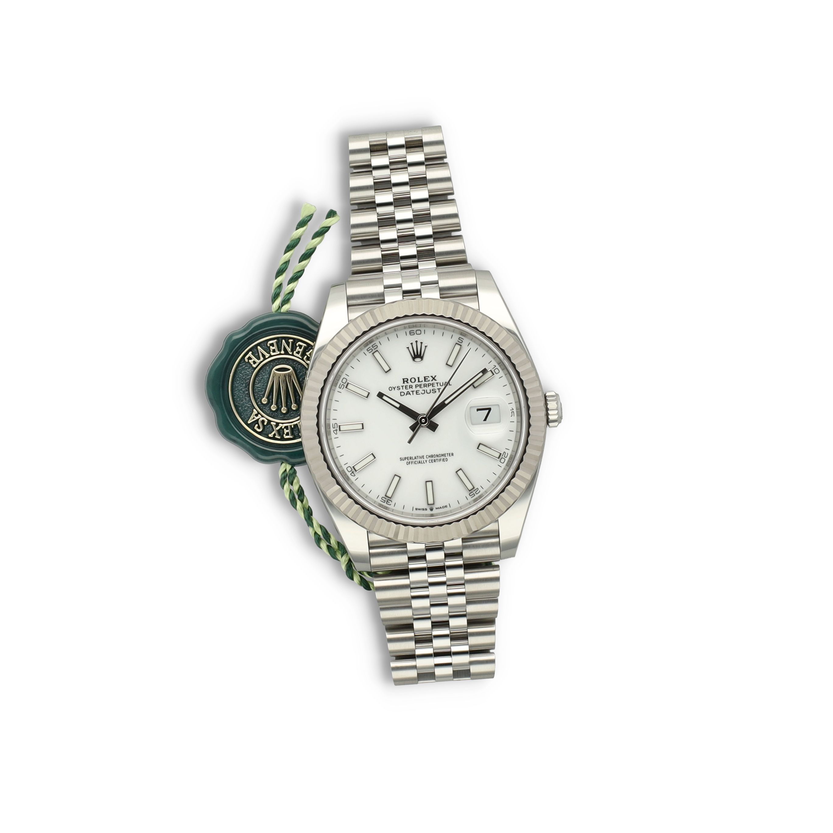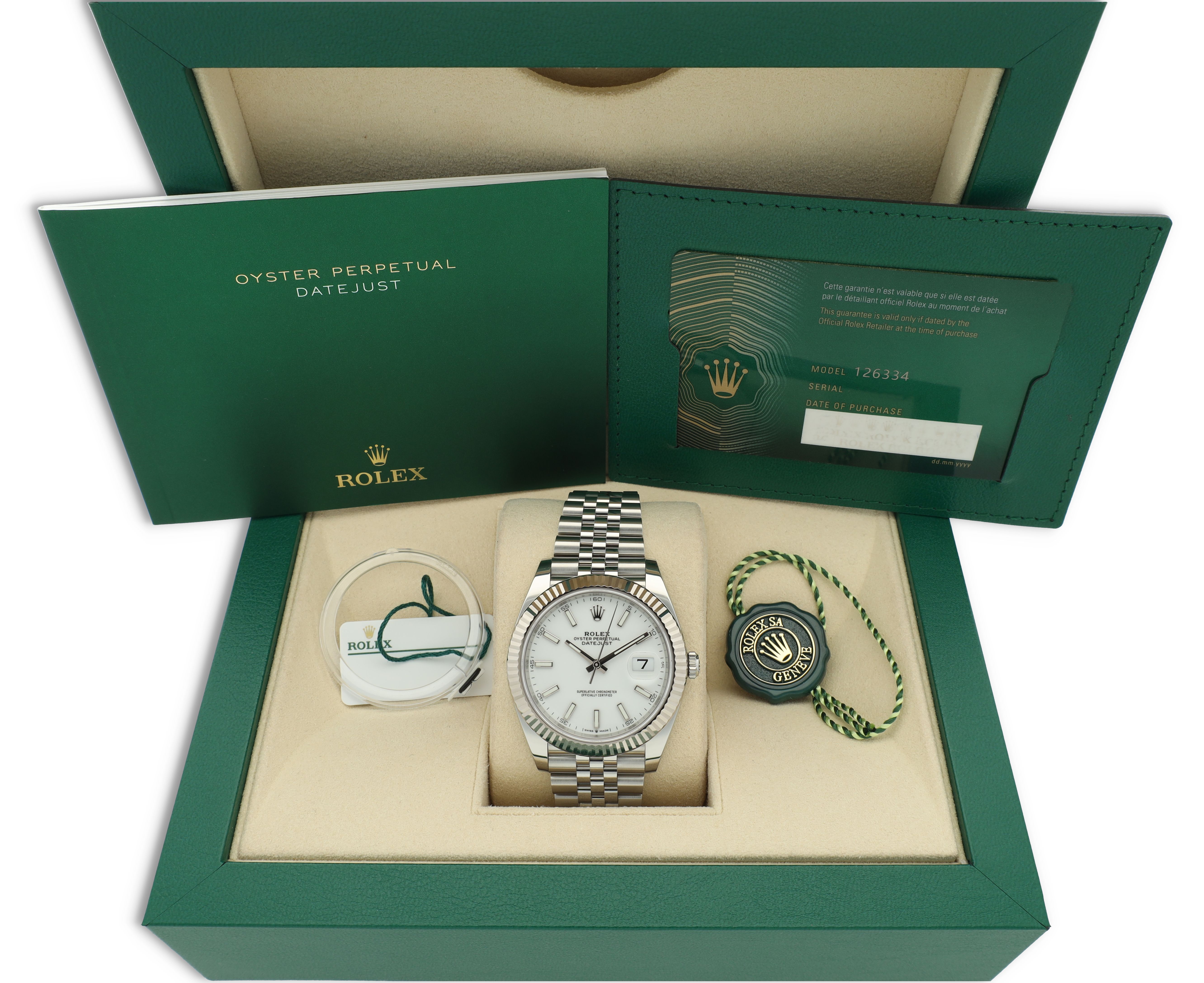 The Rolex Datejust with reference 126334 from Q4 2023 comes as a full set, including the original box, papers, booklets, hang tag, and Rolex warranty card. This classic configuration features a crisp white dial, offering timeless elegance with a clean, minimalist look that never goes out of style.The watch features a 41 mm case crafted from Oystersteel, topped with an 18-carat white gold fluted bezel, and is paired with the refined Jubilee bracelet, combining comfort and sophistication in true Rolex fashion.