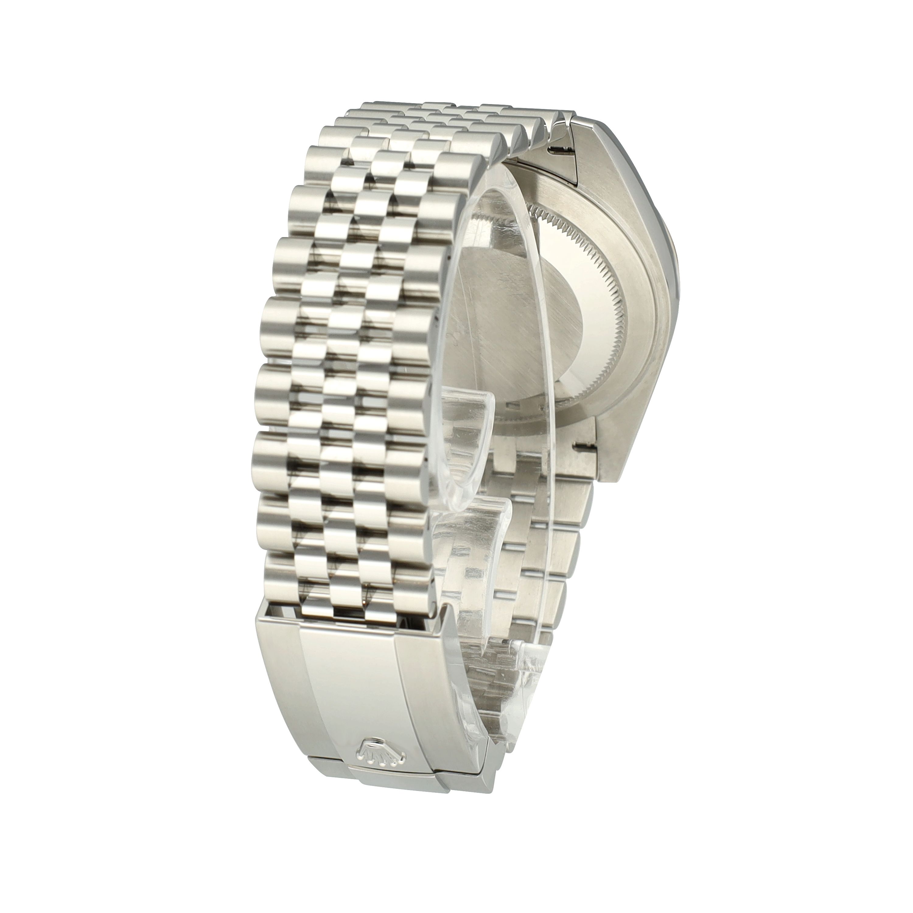 Het horloge heeft een 41 mm kast gemaakt van Oystersteel, bekroond met een 18-karaats witgouden geribbelde lunette en is gekoppeld aan de verfijnde Jubilee armband, een combinatie van comfort en verfijning in ware Rolex mode.