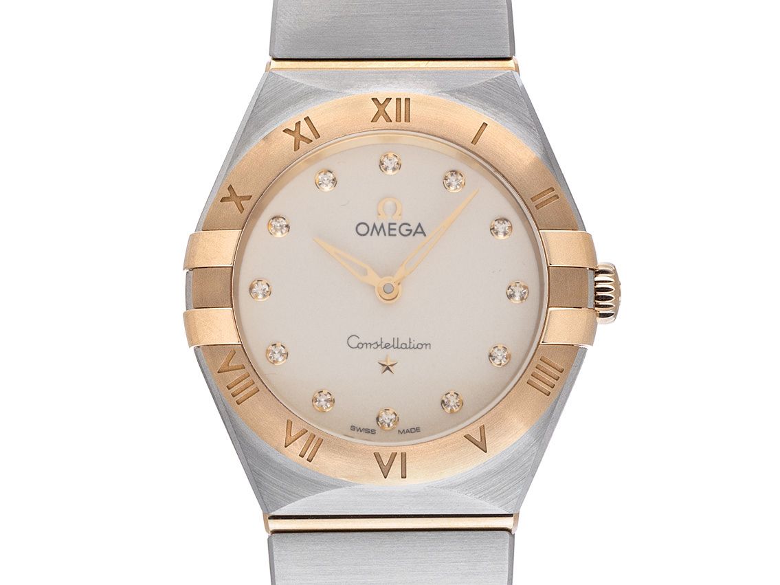 Omega Constellation Stahl 18kt Gelbgold Diamanten Quarz Armband Stahl 18kt GelbgoldGehäuse Edelstahl / 18kt Gelbgold poliert und satiniert, Gehäusedurchmesser ohne Krone 28mm, Gehäusehöhe 8,8mm. Lünette 18kt Gelbgold poliert und satiniert, gravierte römische 12-Stunden Skala. Armband Edelstahl / 18kt Gelbgold poliert und satiniert, Doppelsicherheitsfaltschließe Edelstahl mit Hersteller-Logo. Zifferblatt silberfarben mit 12 aufgesetzten in Gelbgold gefassten Diamantindexen, zusammen ca. 0,07ct TW/ IF-VVS (feines Weiß lupenrein bis sehr sehr kleine Einschlüsse) und gelbgoldenen Zeigern. Uhrwerk quarzgesteuert, Omega Manufakturkaliber 4061. Anzeige von Stunde und Minute über Zeiger aus der Mitte. Saphirglas kratzfest, gewölbt und entspiegelt. Krone mit Flankenschutz und Hersteller-Logo. Boden Edelstahl graviert. Gewicht der Uhr inklusive Armband 88g, Länge des Armbandes inklusive Gehäuse 160mm. Wasserdicht bis 3 ATM. Referenznummer: 131.20.28.60.52.001, Gehäusenummer: 93118XXX, ID: KBST123185920724H-6800, Artikelnummer: 10000075403. Original Omega Box mit Umkarton und Garantie Papiere von 2024 sowie Diamant Zertifikat und Beschreibung, Full Set. Ungetragen. Lieferzeit sofort.