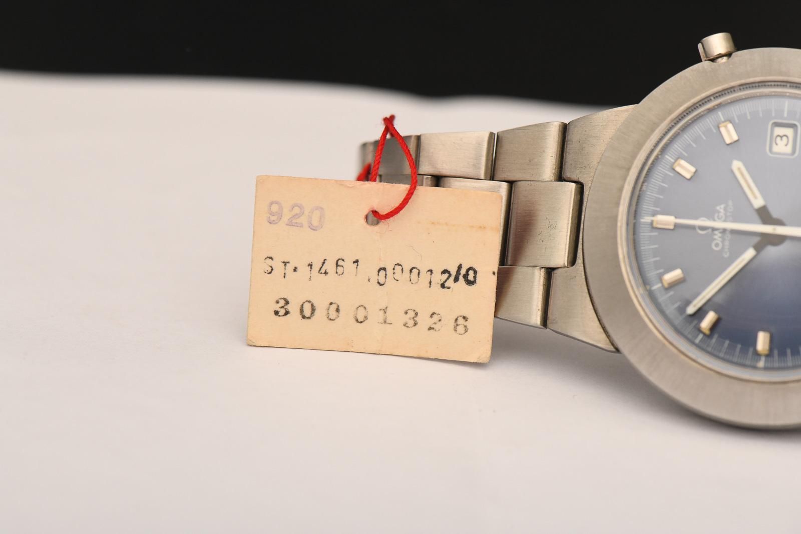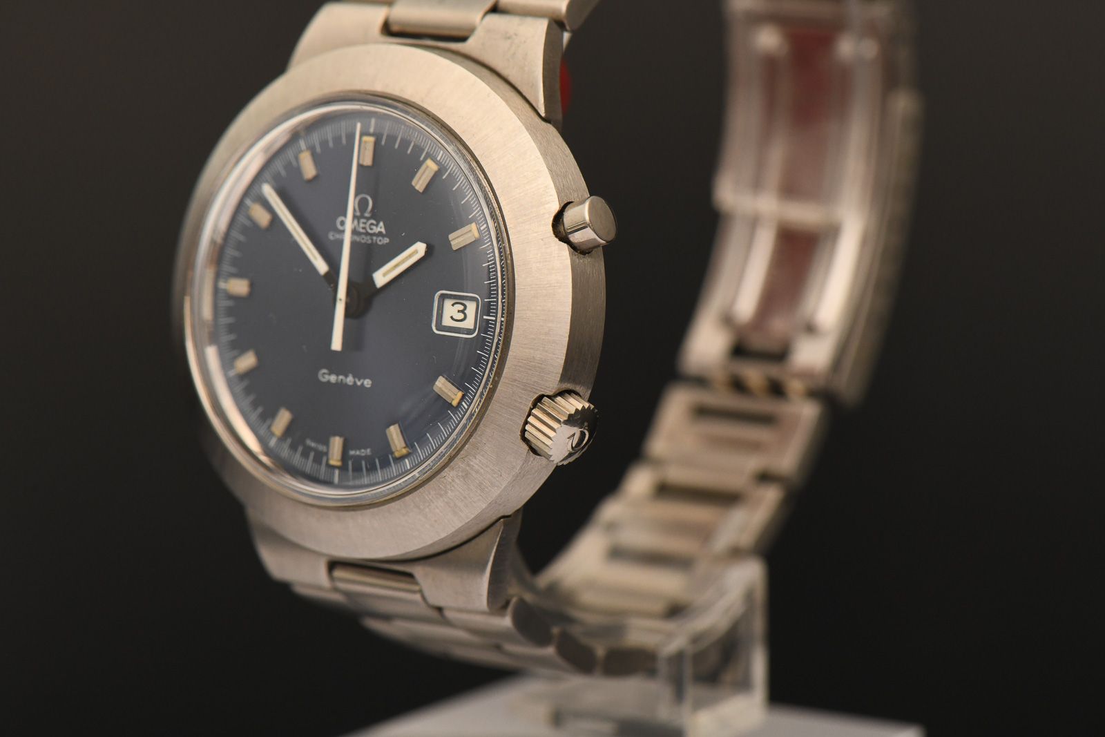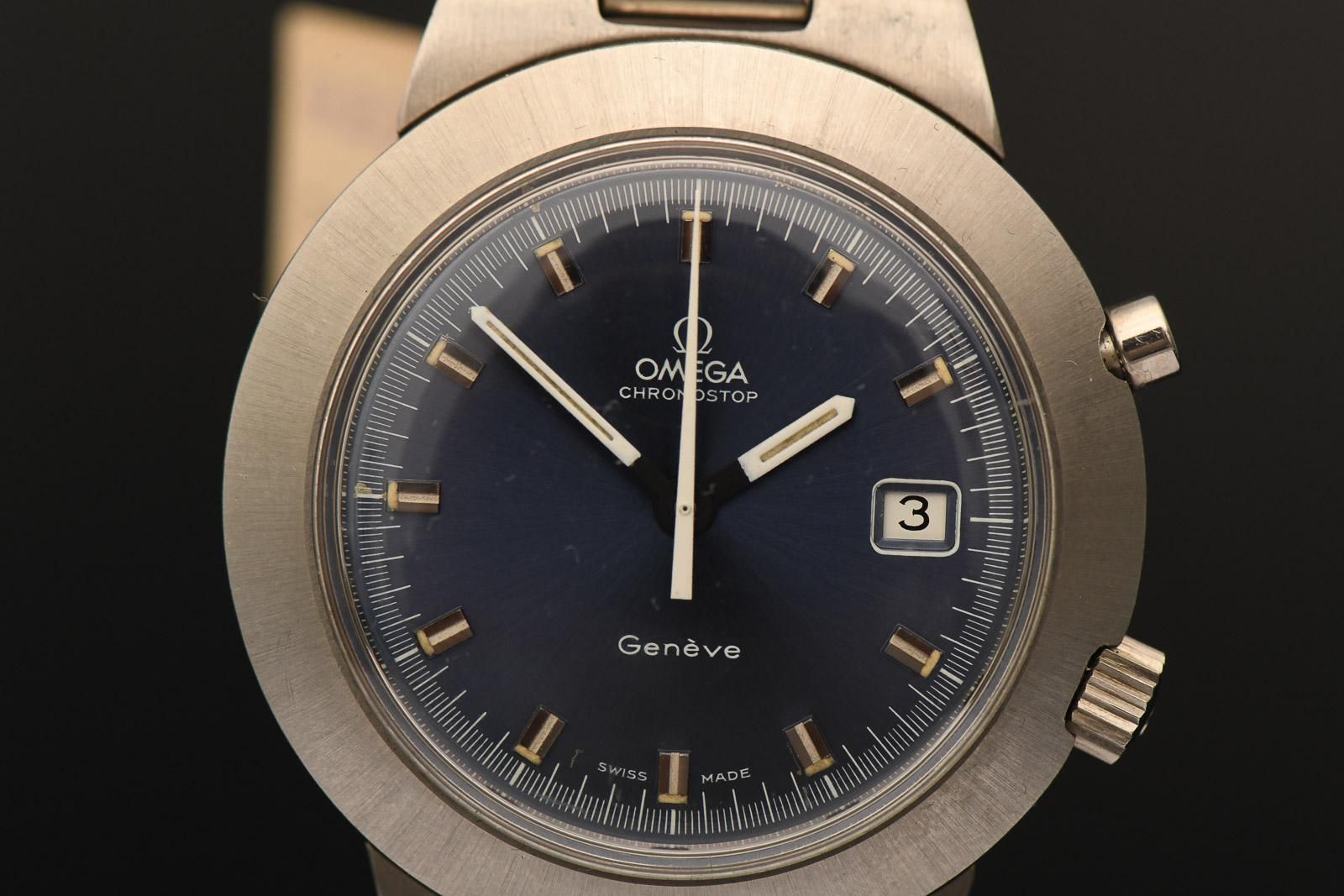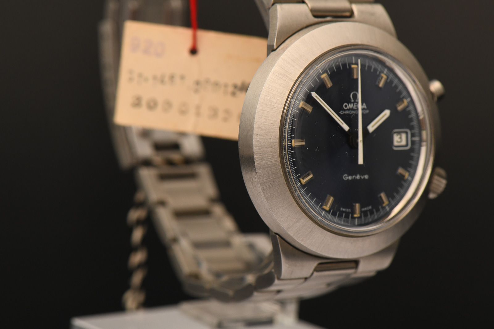 OMEGA NEW OLD STOCK 1969 Omega Chronostop „The Italien“. Very beautiful NEW OLD STOCK Omega Chronostop with blue dial. This version is very rare and is also known as “The Italian.” Here is some information about its history: The Geneve Chronostop models for the Italian market differ greatly from the original design. They combine a simple, minimalist, almost Germanic dial design with an integrated bracelet and a case taken from the Geneve Dynamic. While the Geneve Dynamic is a watch that is not particularly popular with collectors, these Chronostop models take the case and turn it into something completely different and special. That may not sound like the most compelling recipe, but this watch is far more than the sum of its parts, resulting in a sporty yet remarkably elegant overall look. The name “Pentatlon” comes from a sticker on the case back of many of these watches, which features the Olympic cross and the words “Omega Chronostop Pentatlon.” Pentatlon is the Italian word for pentathlon, a sport consisting of five disciplines, all of which require short time measurements and are therefore ideal for the Chronostop design. A great watch for the passionate Omega collector.