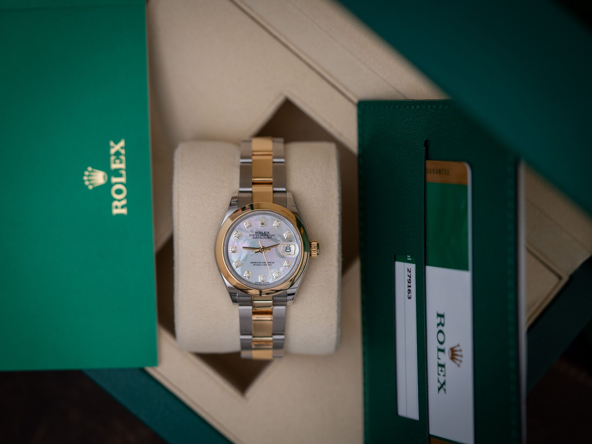 Available is this elegant and rather rare Rolex Lady-Datejust, reference 279163. The watch has a 28mm stainless steel and yellow gold case, a smooth bezel, and an Oyster bracelet. Its standout feature is the mother-of-pearl dial, beautifully complemented by diamond hour markers.This example is in very good condition and comes as a full set, including box and papers. The watch has been carefully maintained.