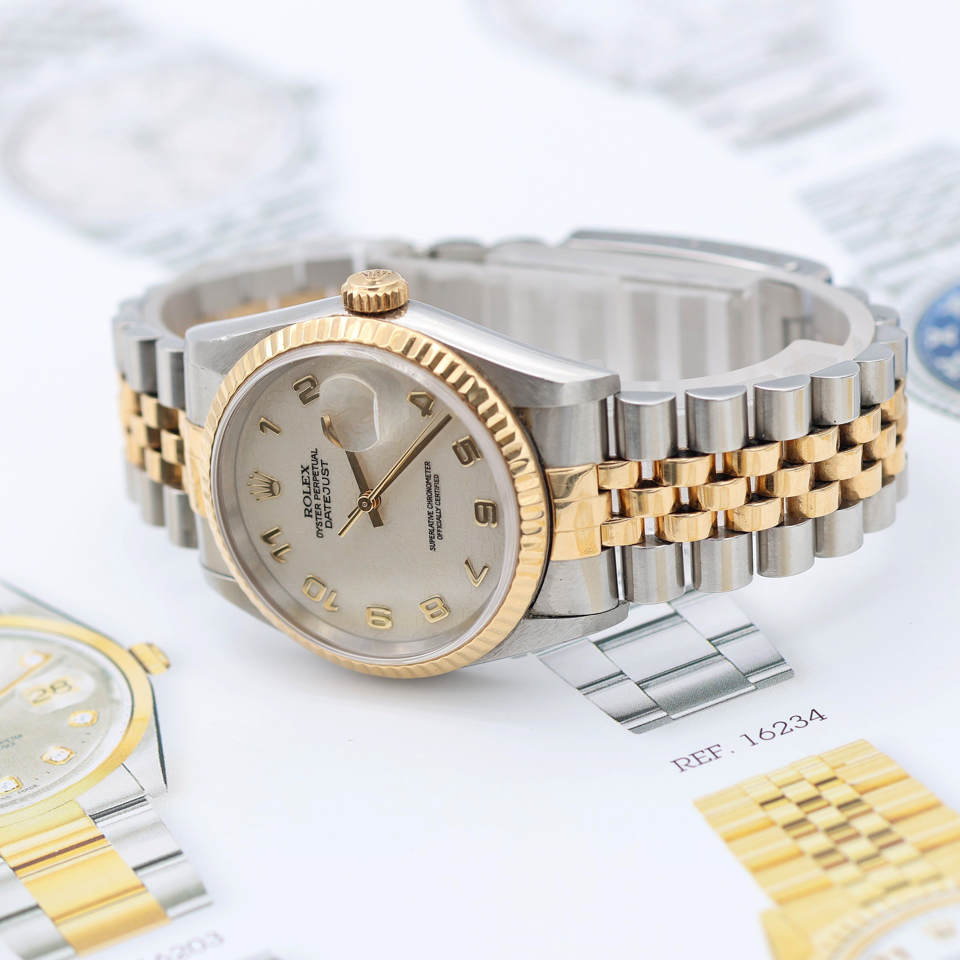 For sale at Debonar Watches: pre-owned Rolex Datejust 16233 in steel and 18k yellow gold.Fluted yellow gold bezel on a Jubilee bracelet, with an elegant millennary (also called "Jubilee") dial with arabic numbers.The Rolex Datejust reference 16233 first made its appearance in 1988, boasting notable upgrades over its predecessor.The ref. 16233 was the direct replacement for the ref. 16013, which is sometimes known as the American Psycho Rolex.This reference maintained the classic 36mm case diameter from years past, which while a bit on the modest side by today’s standards still wears very well on a range of wrist sizes.Even though the series came to an end in the mid 2000’s, the Datejust ref. 16233 is a thoroughly modern version of the watch, and one with the classic two-tone Rolex look. BRAND ROLEX MODEL DATEJUST REFERENCE 16233 CASE MATERIAL 18K GOLD AND STEEL MOVEMENT AUTOMATIC DIMENSION 36 MM DIAL MILLENNARY BEZEL 18K GOLD CRYSTAL SAPPHIRE BRACELET TYPE JUBILEE BRACELET MATERIAL 18K GOLD AND STEEL BRACELET LENGHT 16,5 CM ORIGINAL BOX NO ORIGINAL PAPERS NO YEAR APPROX. THE '90s CONDITION VERY GOOD