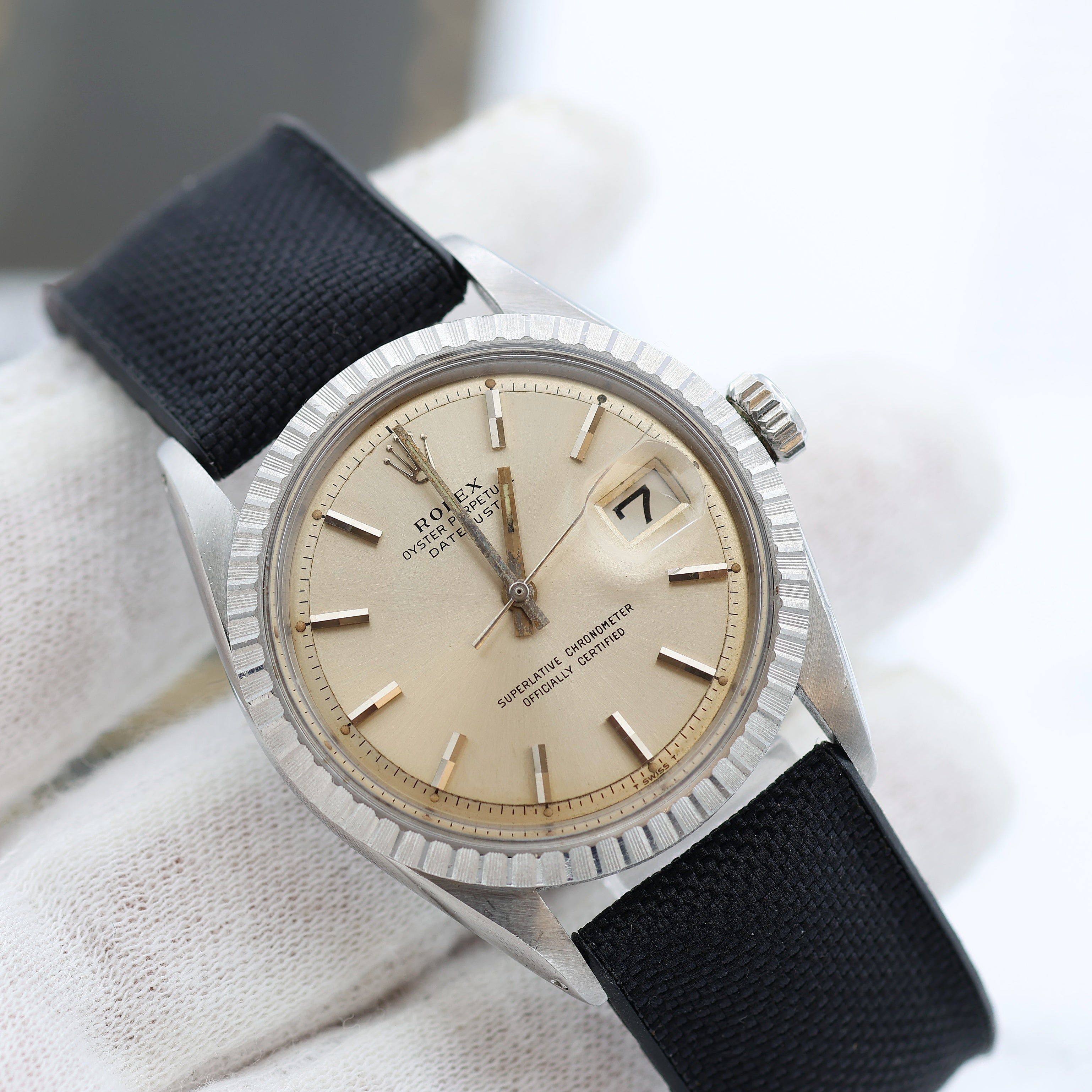 For sale at Debonar Watches: pre-owned Rolex Datejust ref. 1603 in steel with a modern silver dial on top of a textile generic strap.The Rolex Datejust is considered the definitive “watch”: its design has barely changed in 60 years and is a familiar sight even to non-enthusiasts. This Rolex has an engine-turned bezel, baton hour markers, and the Cyclops magnifying bubble over the date window. BRAND ROLEX MODEL DATEJUST REFERENCE 1603 CASE MATERIAL STEEL MOVEMENT AUTOMATIC DIMENSION 36 MM DIAL SILVER BEZEL STEEL CRYSTAL PLEXIGLASS BRACELET TYPE STRAP (GENERIC) BRACELET MATERIAL TEXTILE BRACELET LENGHT 17 CM ORIGINAL BOX NO ORIGINAL PAPERS NO YEAR APPROX. THE '70s CONDITION VERY GOOD
