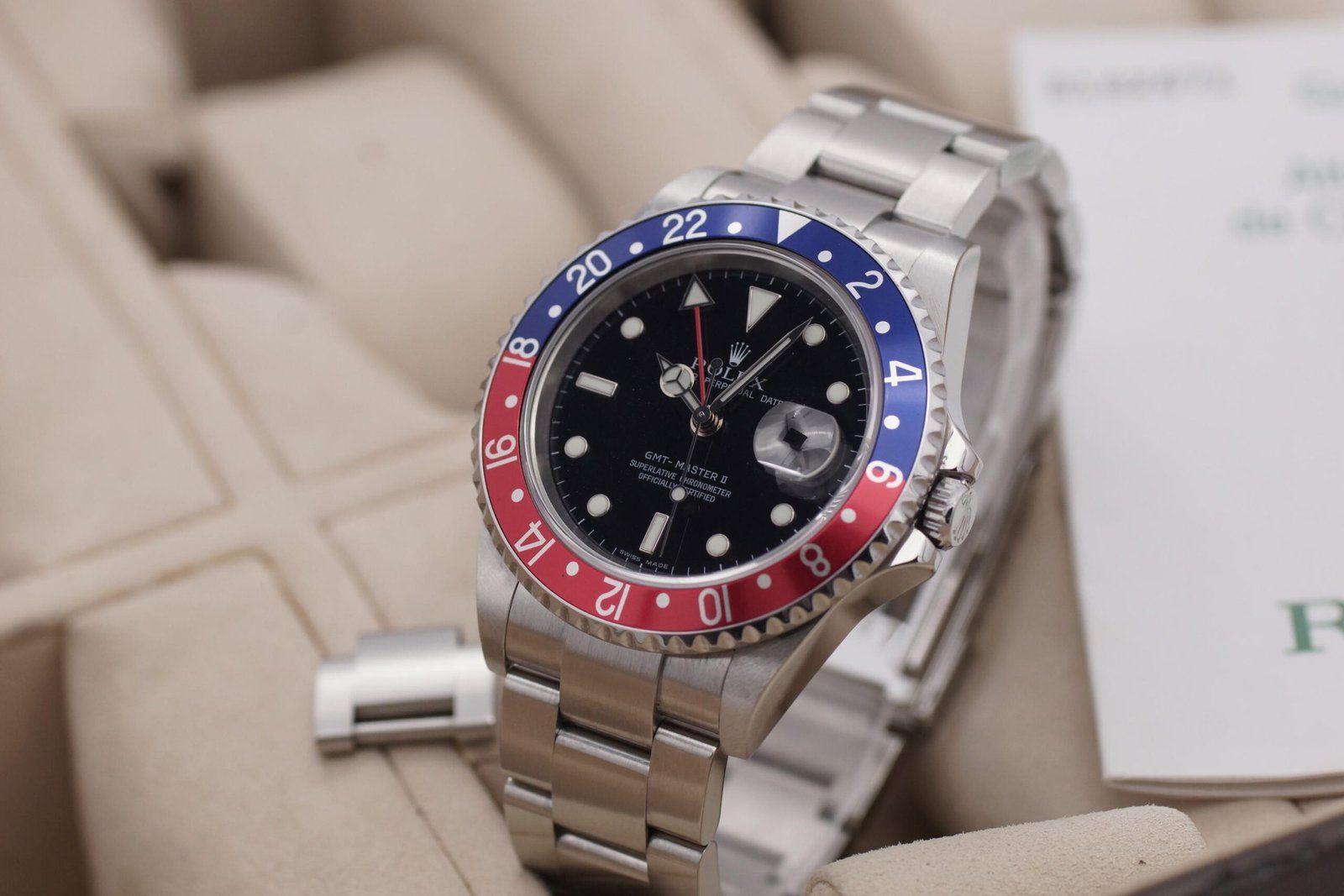 Rolex GMT Master II Pepsi rechthoekige wijzerplaat 16710 Papers 04-2007 LC CH