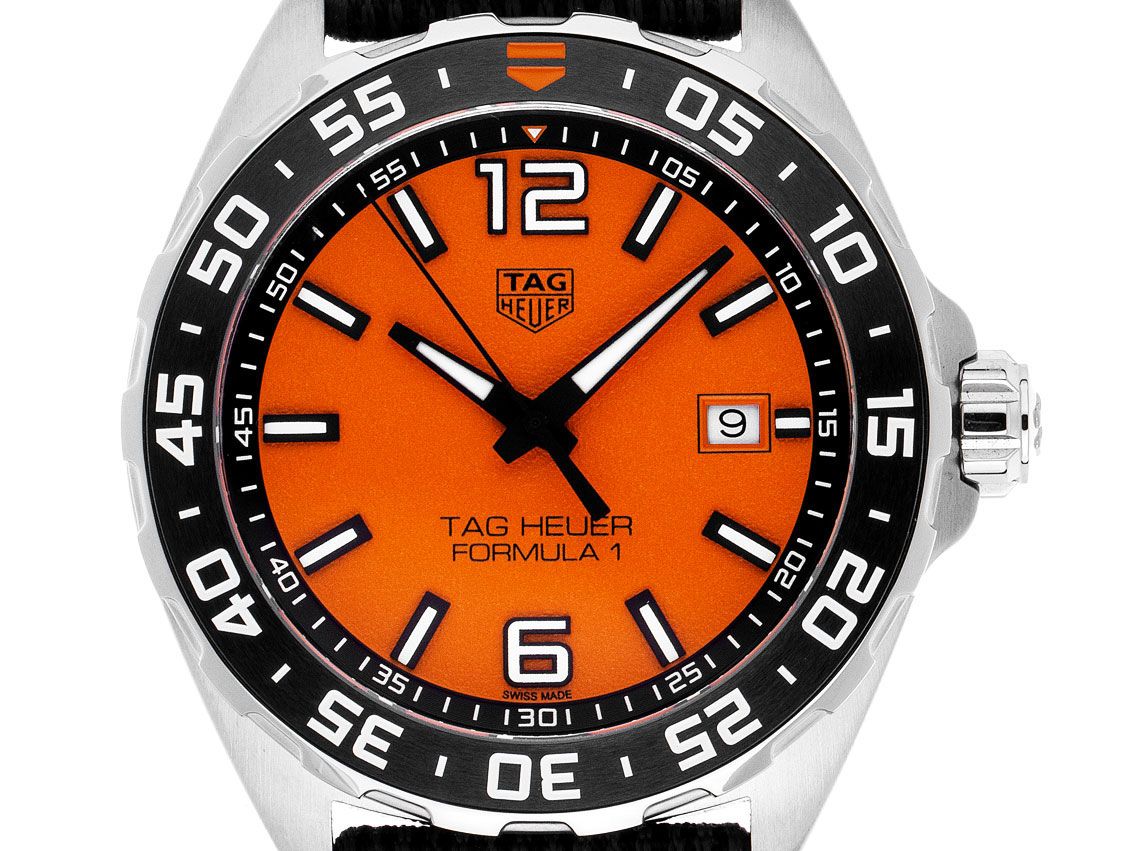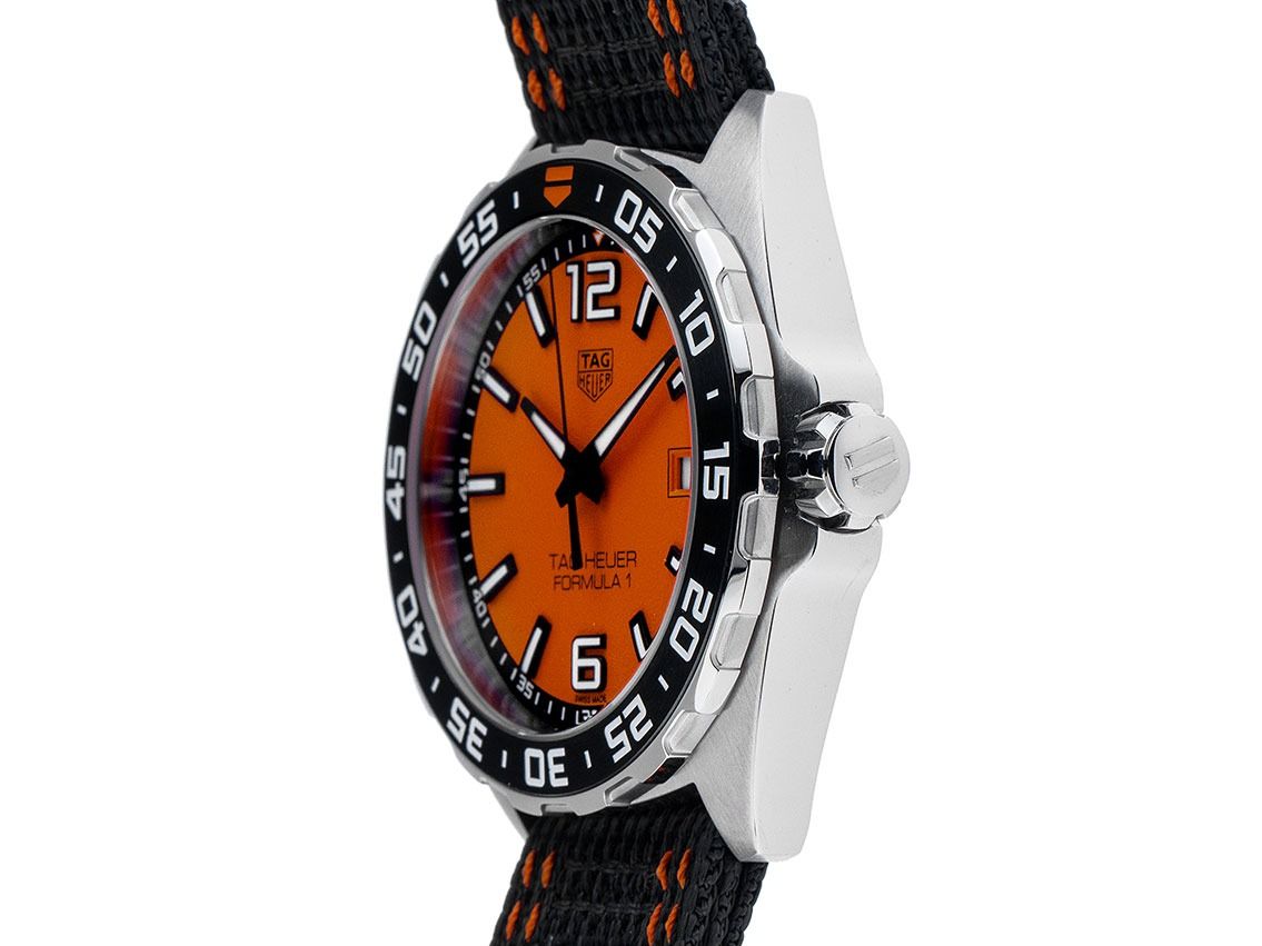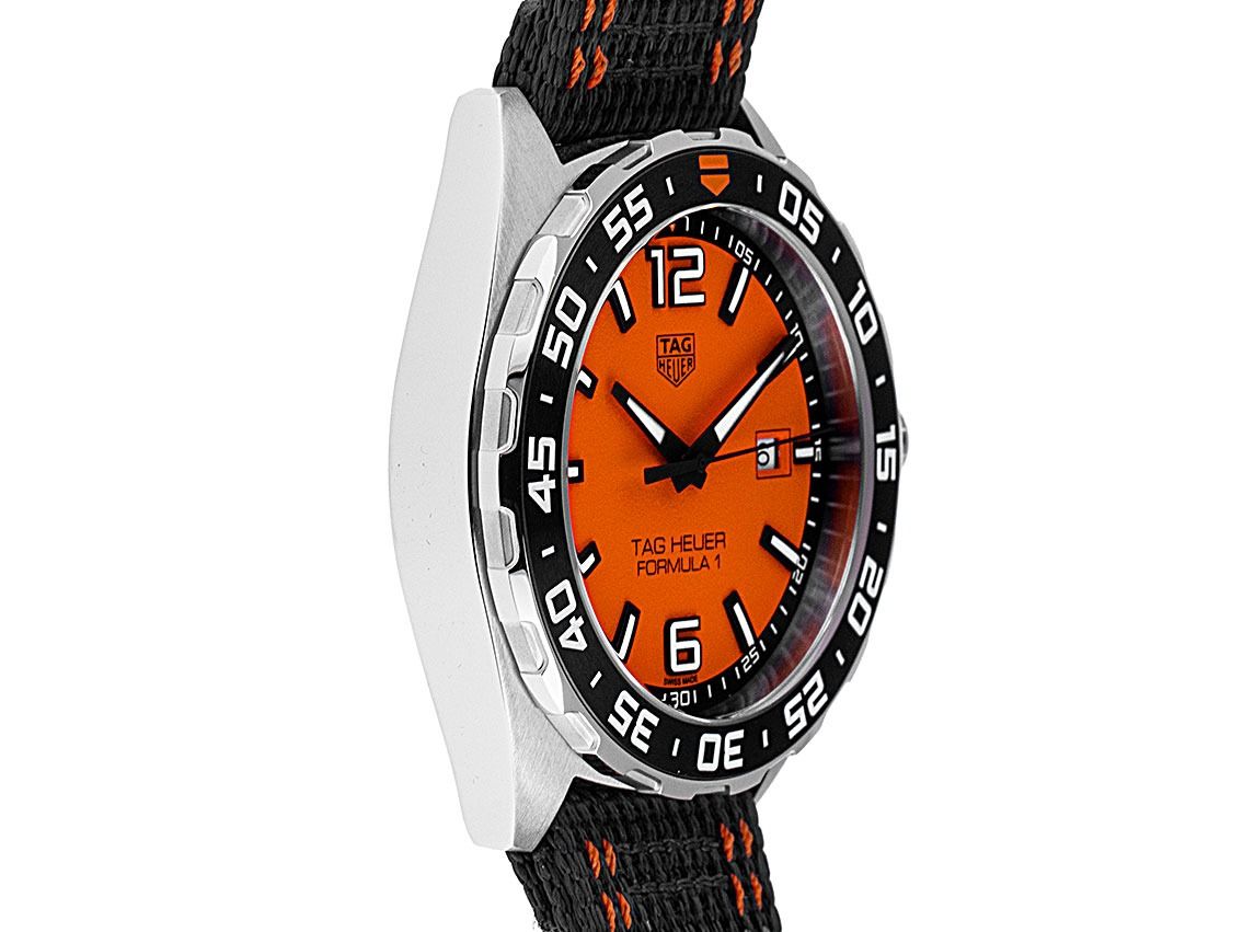 Tag Heuer Formula 1 Stahl Keramik Quarz Armband TextilGehäuse Edelstahl poliert und satiniert, Gehäusedurchmesser ohne Krone 43mm, Gehäusehöhe 11,8mm. Lünette Edelstahl mit schwarzem Keramik Inlay und 60 Minuten-Skala, einseitig drehbar. Armband Textil schwarz mit Ziernaht, Anstoßbreite 21mm, Stiftschließe Edelstahl mit Hersteller-Logo. Zifferblatt orangefarben mit aufgesetzten schwarzen Leuchtindexen, Ziffer 6 + 12 und schwarzen Leuchtzeigern. Uhrwerk quarzgesteuert, Kaliber Tag Heuer. Anzeige von Stunde, Minute und Sekunde über Zeiger aus der Mitte mit Sekundenstopp zur sekundengenauen Einstellung der Uhrzeit, Datumsanzeige mit Schnellverstellung bei 3 Uhr. Saphirglas kratzfest. Krone verschraubbar mit Hersteller-Logo. Boden Edelstahl verschraubt und graviert. Gewicht der Uhr inklusive Armband 97g. Wasserdicht bis 20 ATM. Referenznummer: WAZ101A.FC8305, ID: ST116024340825H-2000, Artikelnummer: 10000081841. Original Tag Heuer Box mit Umkarton und Garantie Papiere von August 2025, Full Set. Ungetragen. Lieferzeit sofort.