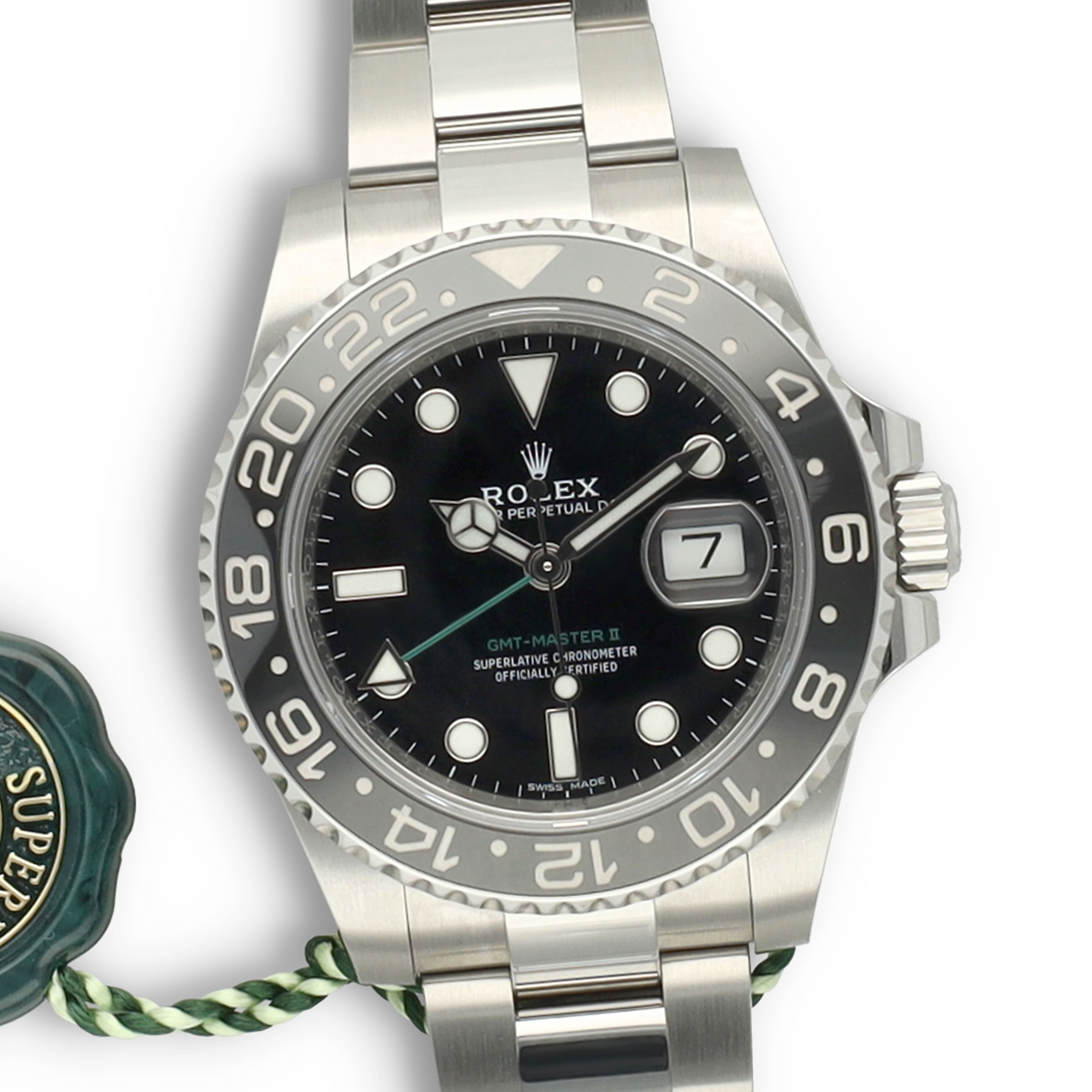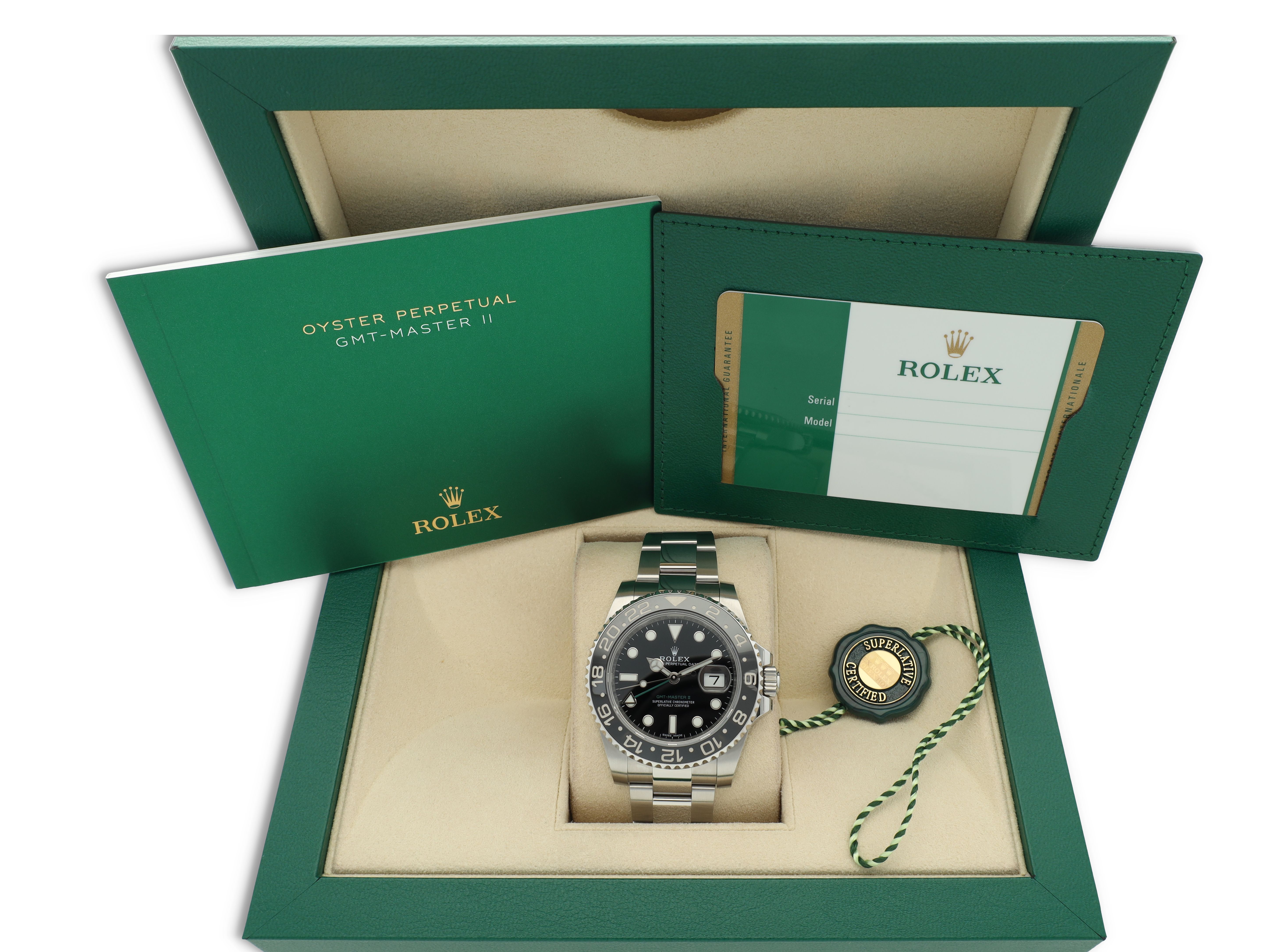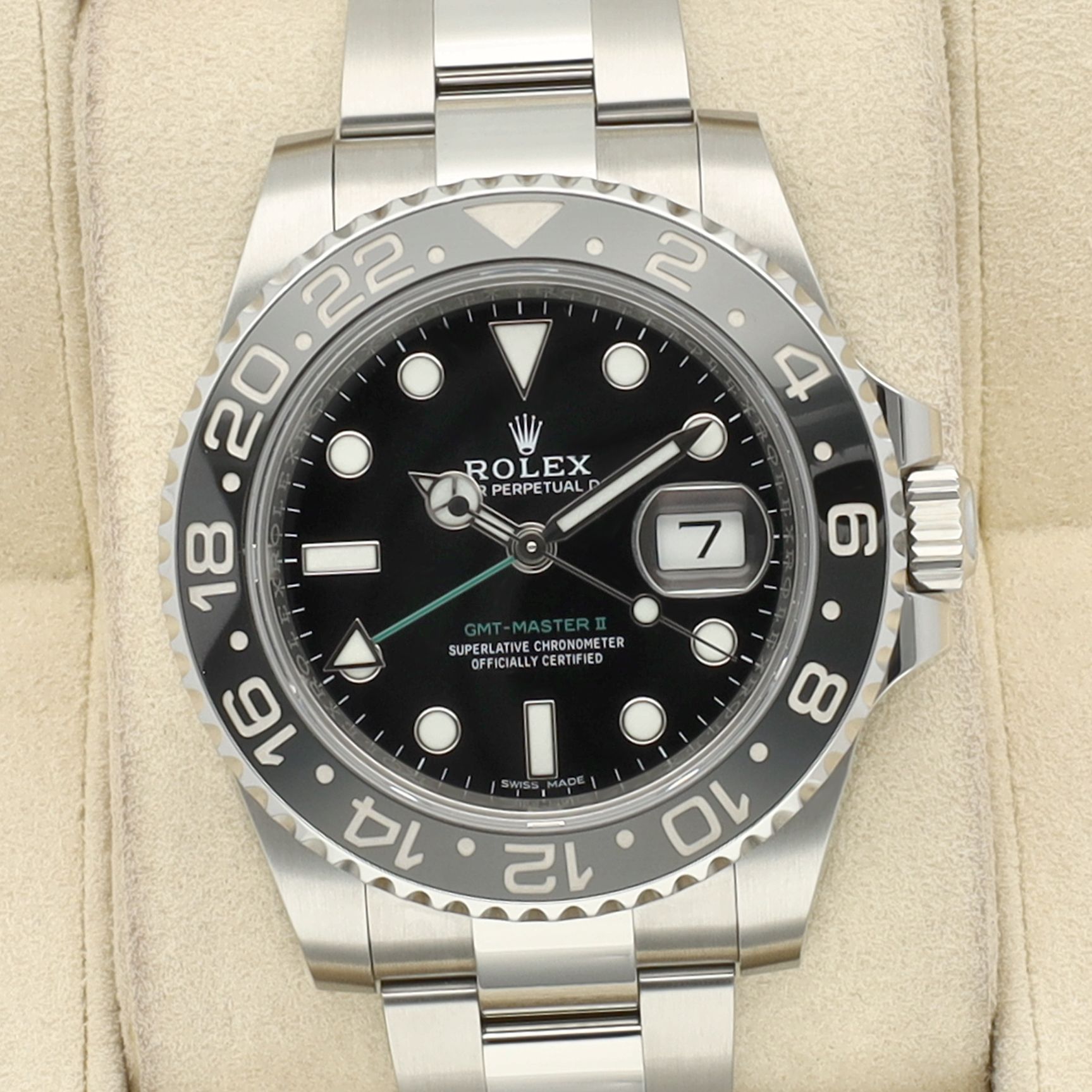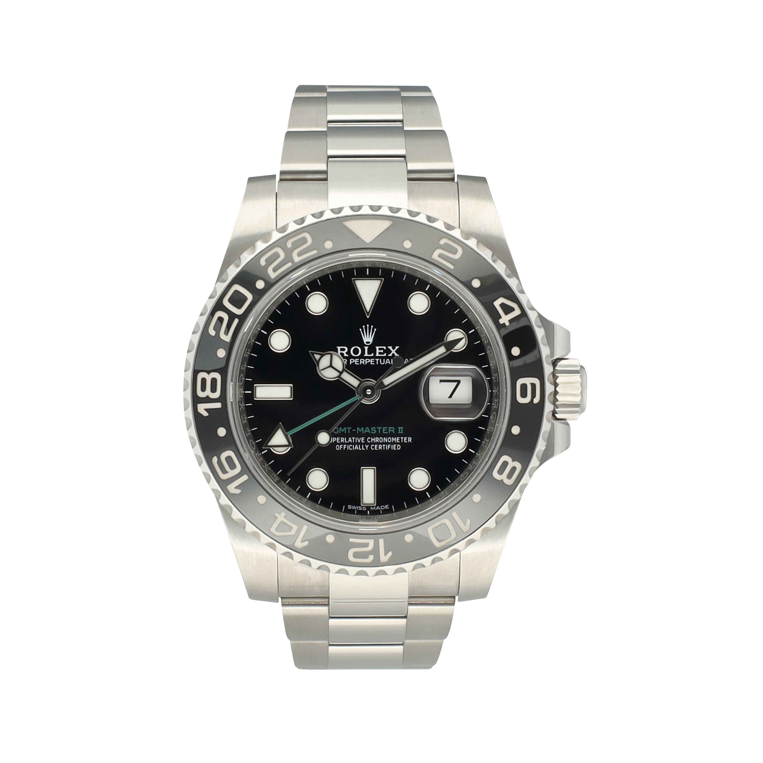 The Rolex GMT-Master II with reference 116710LN from 2020 comes as a full set, including the original box, papers, booklets, hang tag, and Rolex warranty card. This iconic model features the all-black dial paired with a matching black Cerachrom bezel insert in ceramic. The 40 mm case is crafted from corrosion-resistant Oystersteel and is matched with the classic Oyster bracelet.Originally designed for professional pilots, the GMT-Master II is equipped with a second time zone function via the independent 24-hour hand and rotatable bezel. It is powered by the automatic movement caliber 3186, offering a 48-hour power reserve and trusted precision.