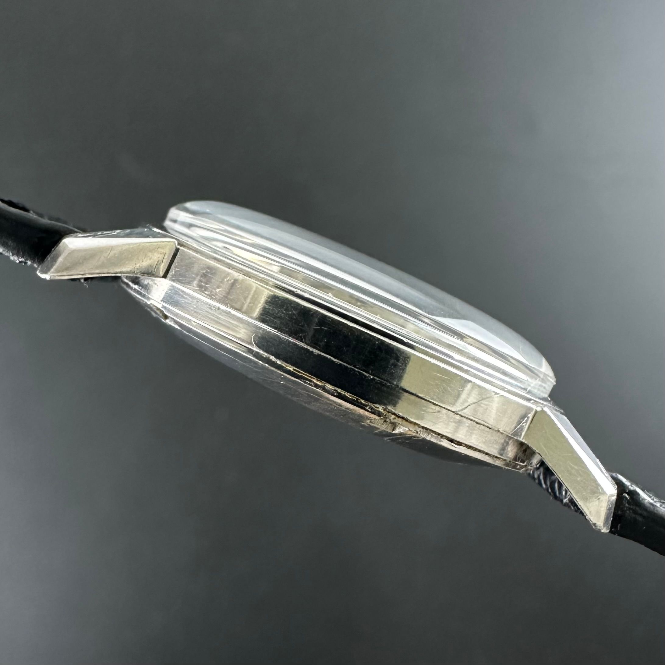 Vintage Omega Seamaster 30 uit 1963 met een wijzerplaat met wit dradenkruis en licht gespikkeld patina. Aangedreven door een recent onderhouden kaliber 286 handmatig uurwerk, loopt het uitstekend. De 35mm kast is in goede algehele staat, met enkele opvallende krassen op de achterkant van de kast, terwijl de rest zijn originele charme heeft behouden. Gepaard met een zwarte krokodilnerf band met een licht glanzende afwerking.