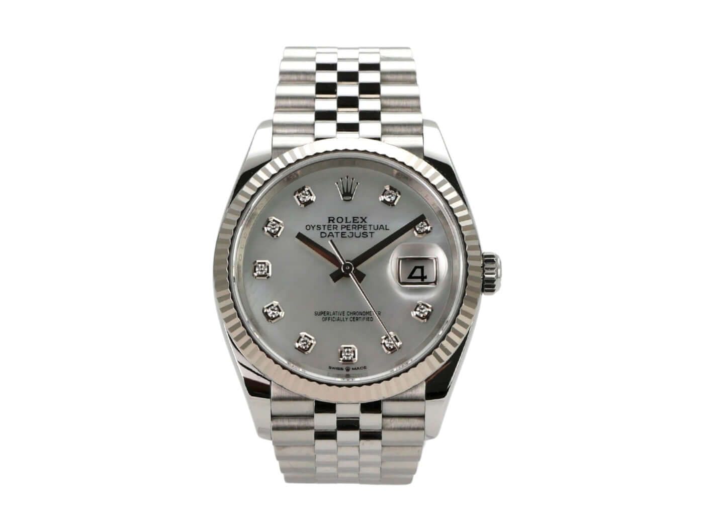 Kast van gepolijst en gesatineerd Oystersteel, kastdiameter 36 mm, bezel van 18 kt witgoud, parelmoer wijzerplaat met 10 toegepaste diamanten, Jubilee roestvrijstalen horlogeband met vouwsluiting, automatisch, Rolex manufacturekaliber 3235, gangreserve van 70 uur, datumweergave, chronometer, saffierglas, schroefkroon, geschroefde roestvrijstalen kastrug, waterdicht tot 10 bar.