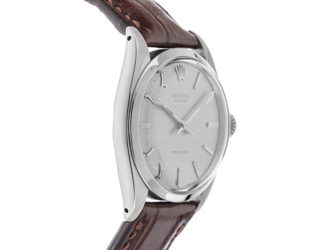 Rolex Oyster Precision Stahl Handaufzug Armband KrokolederGehäuse Edelstahl poliert und satiniert, Gehäusedurchmesser ohne Krone 34mm, Gehäusehöhe 10,2mm. Lünette Edelstahl glatt und poliert. Rolex Armband Krokoleder braun mit Ziernaht, Anstoßbreite 19mm, Rolex Stiftschließe Edelstahl mit Hersteller-Logo. Zifferblatt Silver Leinen Dial mit aufgesetzten Edelstahl Indexen und Edelstahl Zeigern. Uhrwerk Handaufzug, Rolex Manufakturkaliber 1225 mit 17 Edelsteinen. Anzeige von Stunde, Minute und Sekunde über Zeiger aus der Mitte. Plexiglas gewölbt. Krone verschraubbar mit Hersteller-Logo. Boden Edelstahl verschraubt. Gewicht der Uhr inklusive Armband 41g. Referenznummer: 6426, Gehäusenummer: 3389XXX, Baujahr: 1972, ID: P140842820825H-5800, Artikelnummer: 10000082038. Mit Gangkontrolle und kompletter äußerlicher Aufarbeitung von August 2025. Original Rolex Box und Beschreibung sowie Ledermäppchen, Übersetzungsheft, Tag und Watchregister Auszug von August 2025, The Watch Register Zertifikat / ohne Eintrag (Internationale Datenbank für verlorene oder gestohlene Uhren). Superschnäppchen. Kapitalanlage mit Wertsteigerungspotential, extrem seltenes Sammlerstück. Sehr guter Zustand. Lieferzeit sofort.