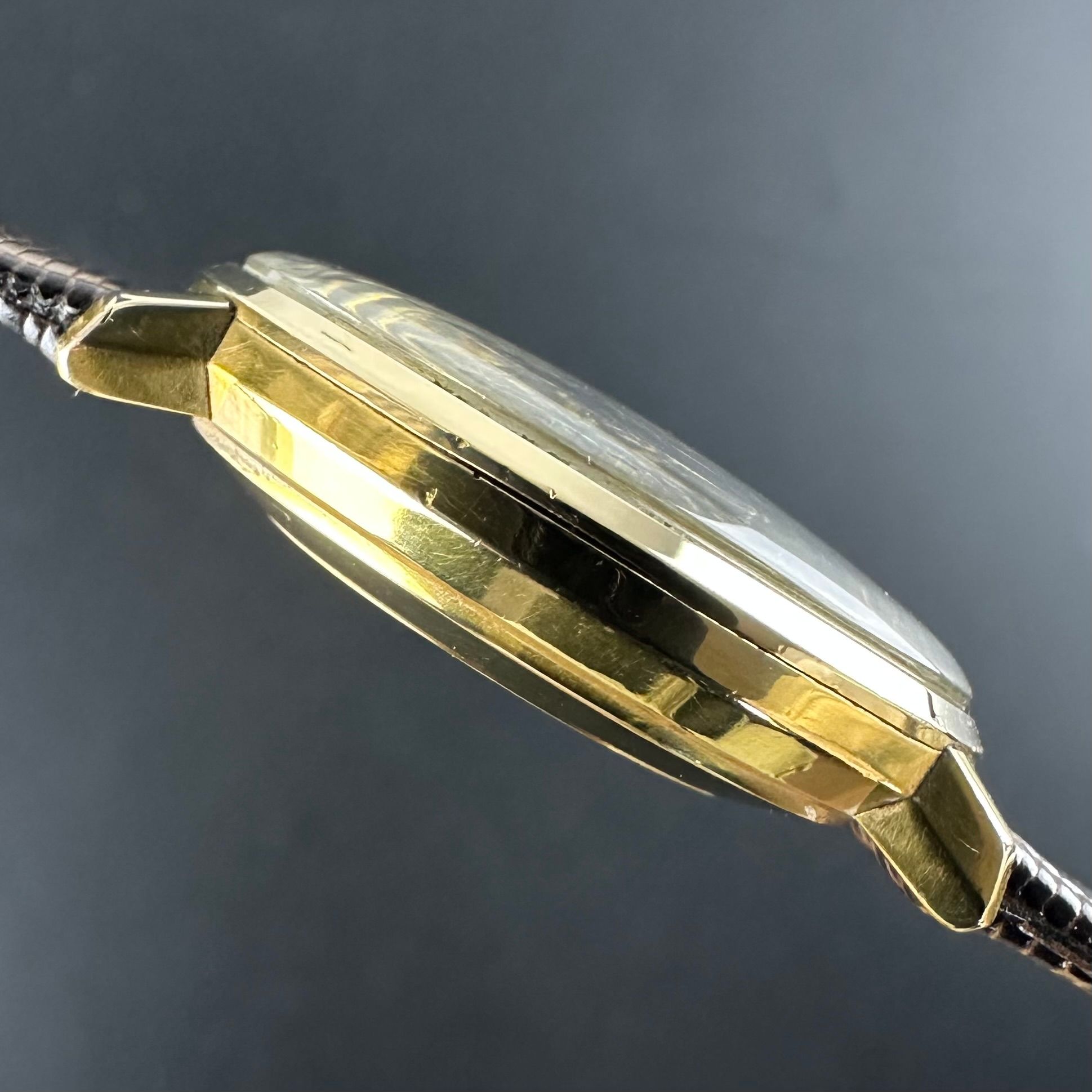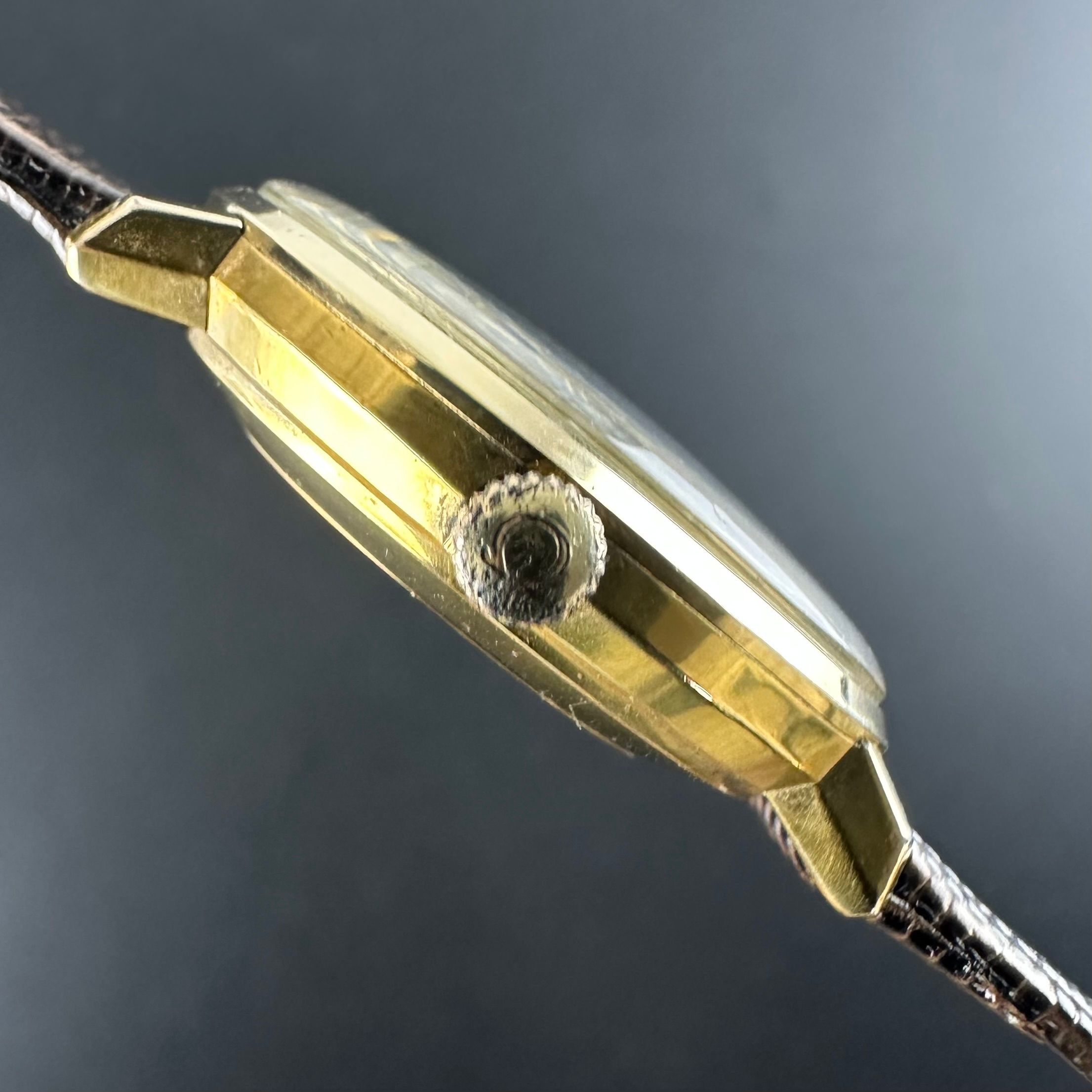 This vintage Omega De Ville, produced in 1970, features a 34,5mm gold-plated case with plating well preserved throughout. The champagne-colored dial has a vertical brushed linen finish and remains in excellent condition.The watch is fully original except for a freshly replaced brown calf leather strap with lizard grain and a light glossy finish. The original plexiglass is still present, though it shows minor stretch marks visible only under certain light.