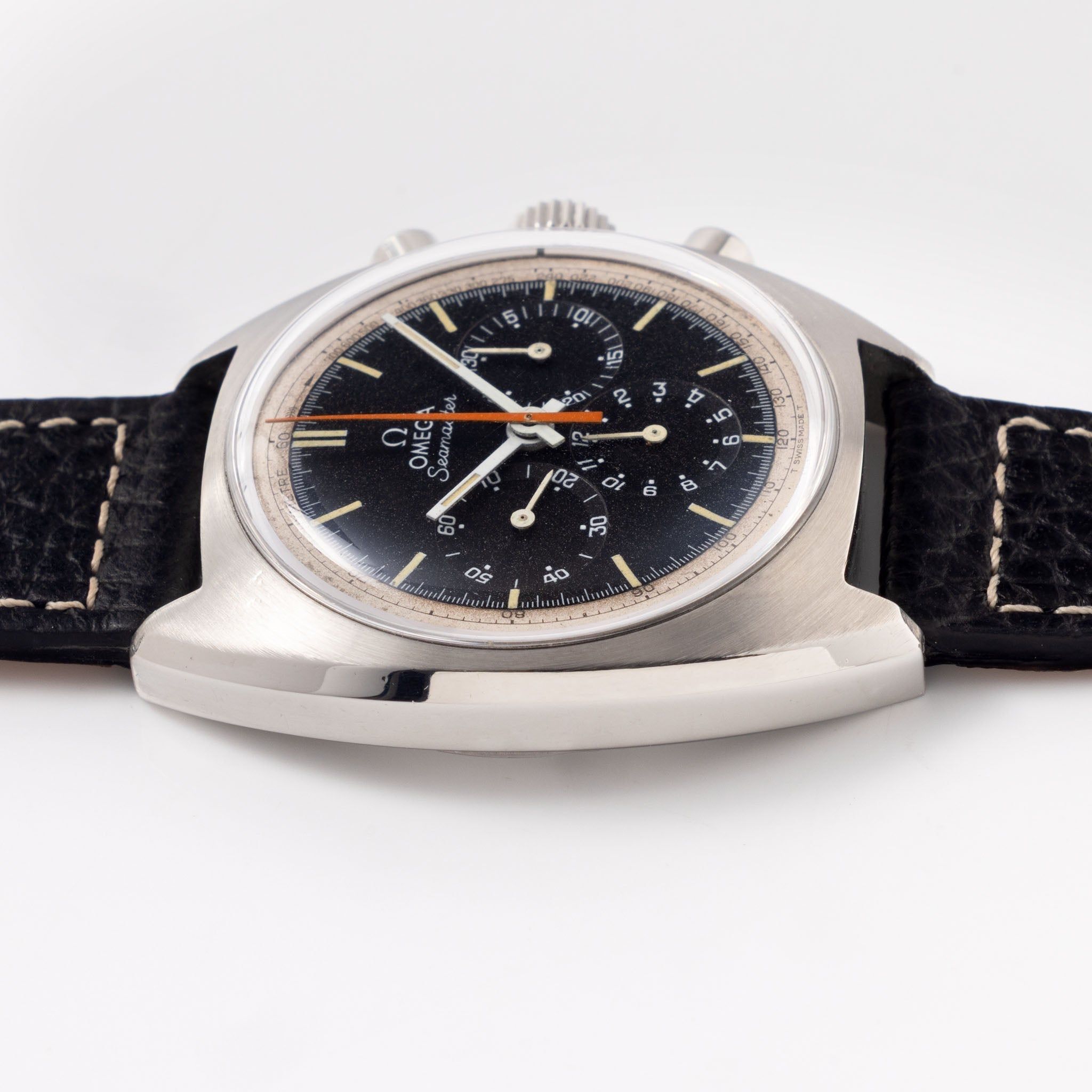 Omega first released the Seamaster in 1948, and over the years, the brand has produced many different variations of the model, including chronographs. Omega debuted the reference 145.006 in the mid-1960s, and it features a number of standout details. A cool example of Omega’s rich chronograph heritage, this Seamaster houses the legendary Caliber 321 within a robust 38mm C-shaped steel case. The deep black dial is in excellent condition, with a white inner tachymeter ring, a beautifully styled numeral font, a bright orange running chronograph hand, and attractive yellow-colored lume. This charming chronograph has been fitted with a high-quality Bulang and Sons leather strap, and the iconic manually wound Caliber 321 movement has been fully serviced by our watchmaker. This is a rare opportunity to own a classic Omega chronograph powered by one of the most iconic movements ever made. Reach out now to make it yours. Specifications: Seamaster Chronograph reference 145.006-66 38mm steel C-shaped case Black dial ,orange running chrono hand and white inner bezel Red gilded calibre 321 hand wound movement Movement Serial 2607xxxx dating to 1967 Bulang and Sons leather strap Fully serviced by our watchmaker One-year mechanical warranty Free worldwide Fedex Priority shipping