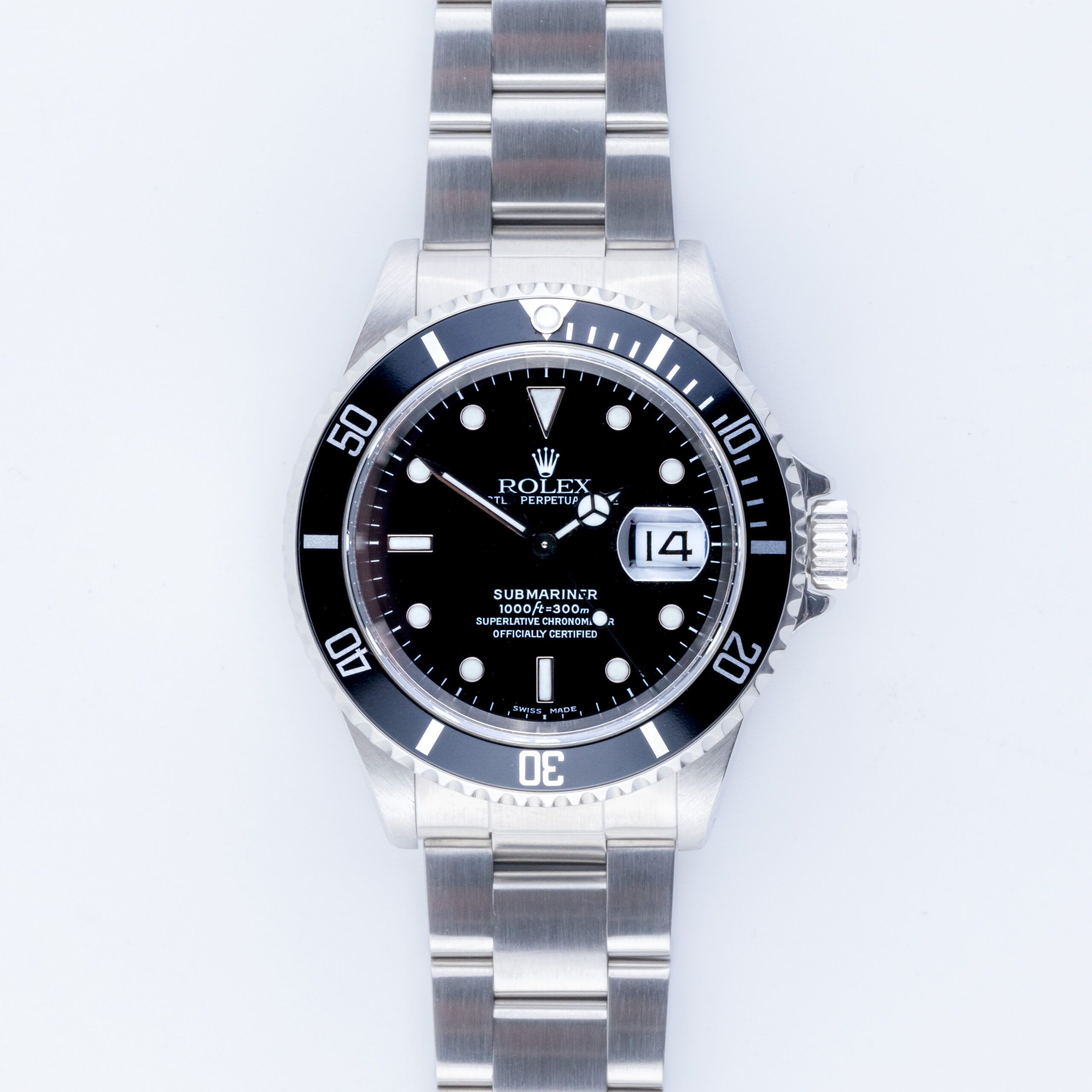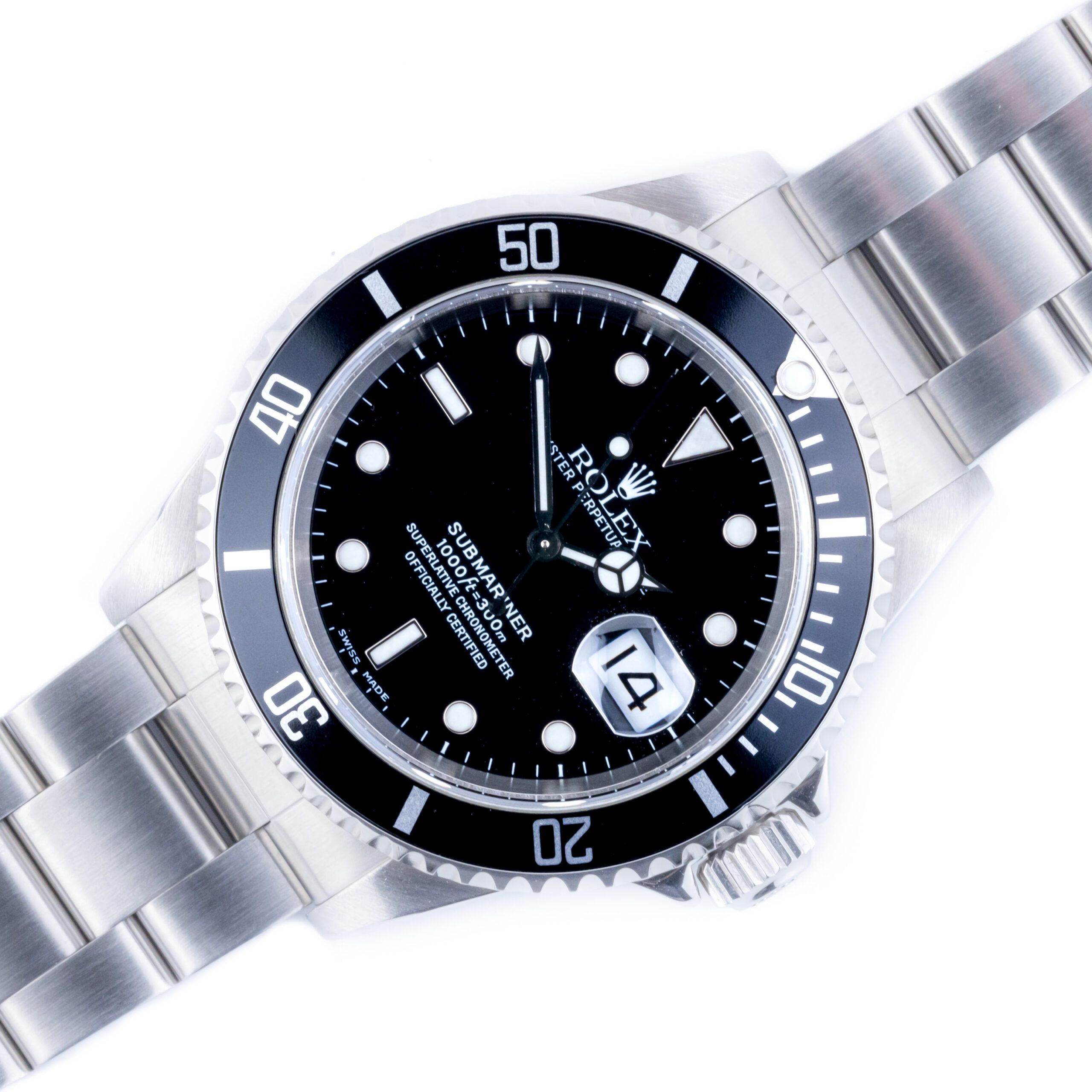 Rolex Oyster Perpetual Submariner Date Reference 16610 uit 1996 inclusief complete set. De Submariner 16610 heeft een 40mm roestvrijstalen kast, een roestvrijstalen Oyster armband met Fliplock sluiting en zwarte draaibare lunette. De Submariner 16610 heeft een automatisch kaliber 3135 met quickset datumfunctie, een krasbestendig saffierglas en een zwarte wijzerplaat met superluminova wijzers en markers.