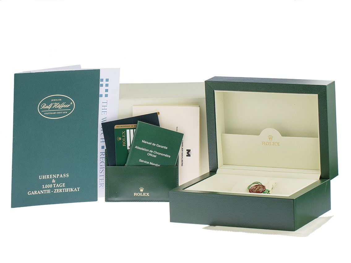 Inklusive certified pre owned Zertifikat / Uhrenpass mit einem Farbbild, der genauen Beschreibung sowie dem Wiederbeschaffungswert der Uhr über 14800,-€ und 1000 Tage Garantie ab Kaufdatum.