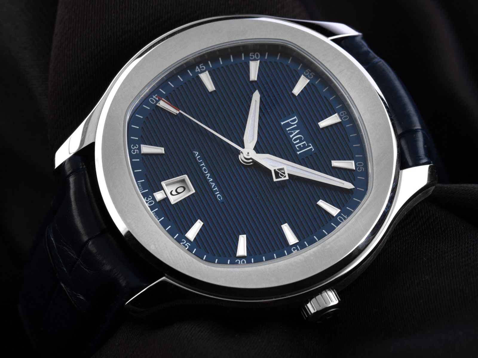 Gehäuse Edelstahl poliert und satiniert, Gehäusemaße ohne Krone 42mm, Gehäusehöhe 9,4mm. Lünette Edelstahl poliert und satiniert. Armband Krokoleder blau, Anstoßbreite 21mm, Sicherheitsfaltschließe Edelstahl mit Hersteller-Logo. Zifferblatt blau guillochiert mit aufgesetzten Leuchtindexen und Leuchtzeigern. Uhrwerk Automatik, Kaliber Piaget 111OP mit 25 Edelsteinen, Gangreserve ca. 50 minuten. Anzeige von Stunde, Minute und Sekunde über Zeiger aus der Mitte mit Sekundenstopp zur sekundengenauen Einstellung der Uhrzeit, Datumsanzeige mit Schnellverstellung bei 6 Uhr. Saphirglas kratzfest. Krone met Hersteller-Logo. Boden Edelstahl 6-fach verschraubt und graviert mit Saphirglas Sichtfenster. Gewicht der Uhr inclusief Armband 100g. Referentienummer: G0A43001, ID: ST5806178020925H-13300, Artikelnummer: 10000082337. Originele Piaget-doos met garantiekaart van 2025, volledige set. Ongetroffen. Lieferzeit sofort.