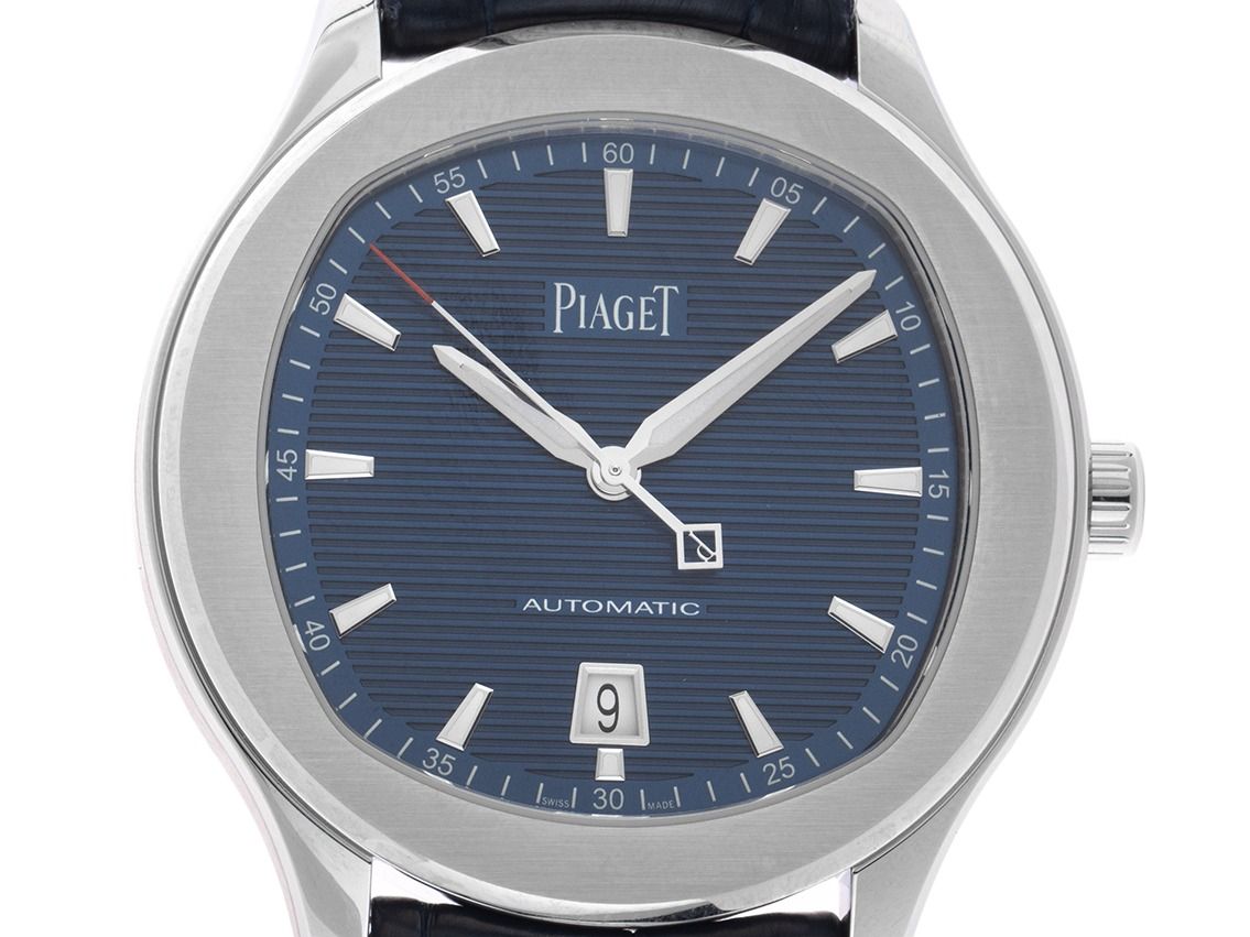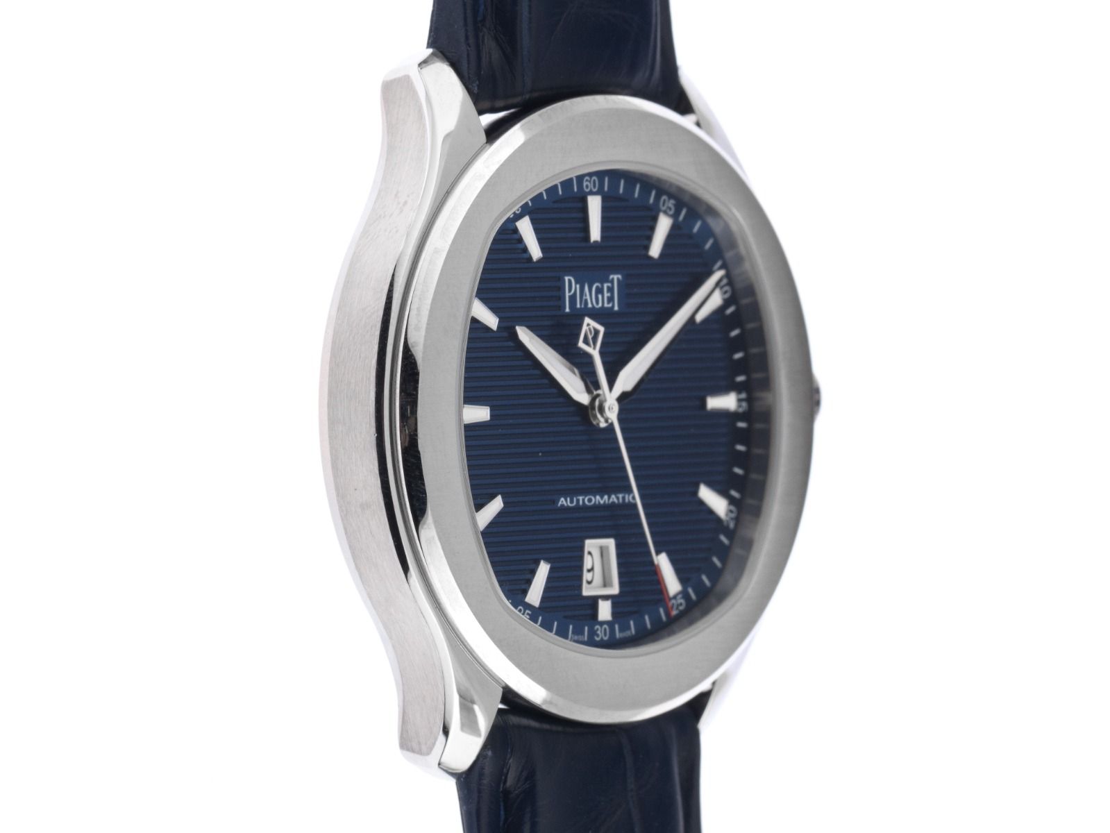 Piaget Polo Stahl Automatik Armband Krokoleder FaltschließeGehäuse Edelstahl poliert und satiniert, Gehäusemaße ohne Krone 42mm, Gehäusehöhe 9,4mm. Lünette Edelstahl poliert und satiniert. Armband Krokoleder blau, Anstoßbreite 21mm, Sicherheitsfaltschließe Edelstahl mit Hersteller-Logo. Zifferblatt blau guillochiert mit aufgesetzten Leuchtindexen und Leuchtzeigern. Uhrwerk Automatik, Kaliber Piaget 111OP mit 25 Edelsteinen, Gangreserve ca. 50 Stunden. Anzeige von Stunde, Minute und Sekunde über Zeiger aus der Mitte mit Sekundenstopp zur sekundengenauen Einstellung der Uhrzeit, Datumsanzeige mit Schnellverstellung bei 6 Uhr. Saphirglas kratzfest. Krone mit Hersteller-Logo. Boden Edelstahl 6-fach verschraubt und graviert mit Saphirglas Sichtfenster. Gewicht der Uhr inklusive Armband 100g. Referenznummer: G0A43001, ID: ST5806178020925H-13300, Artikelnummer: 10000082337. Original Piaget Box mit Umkarton und Garantie Papiere von 2025, Full Set. Ungetragen. Lieferzeit sofort.