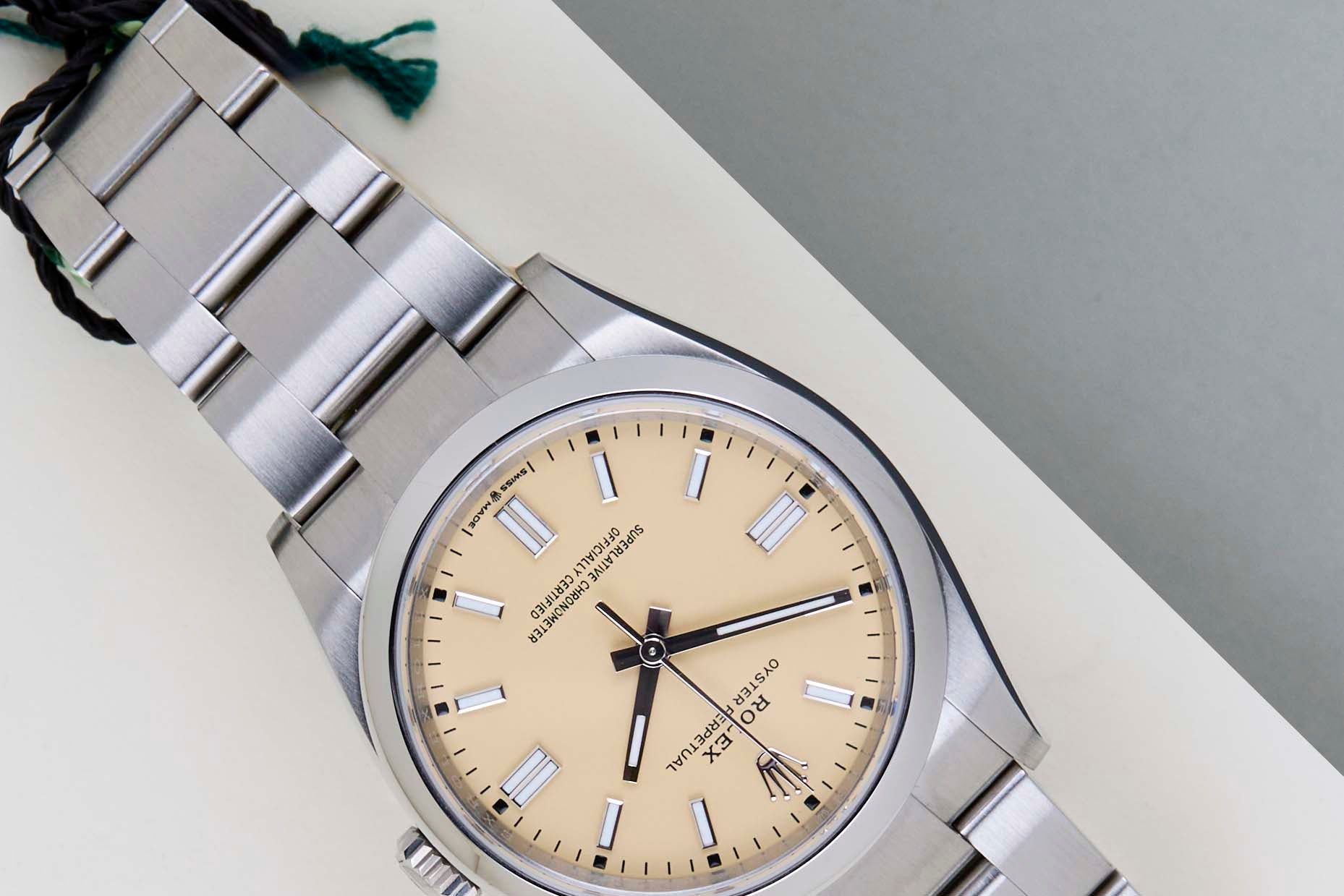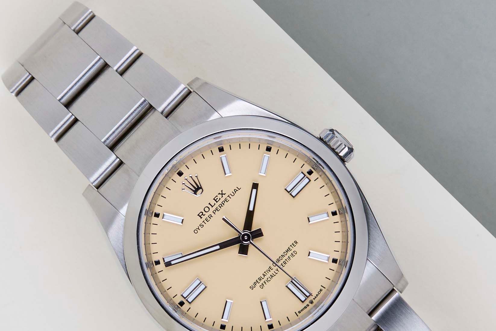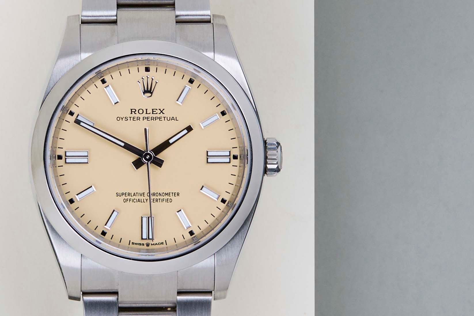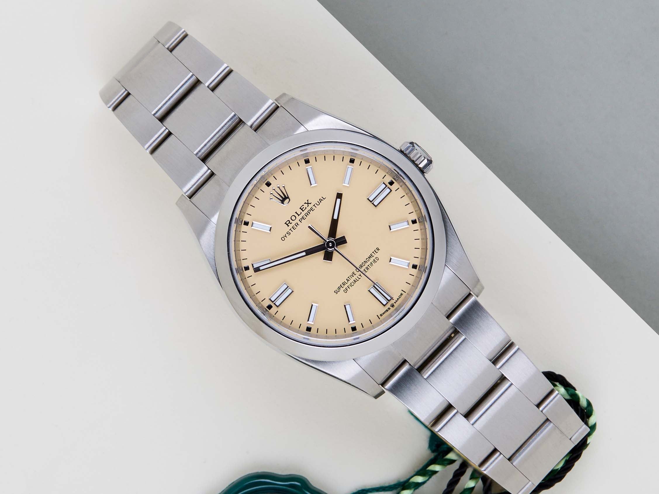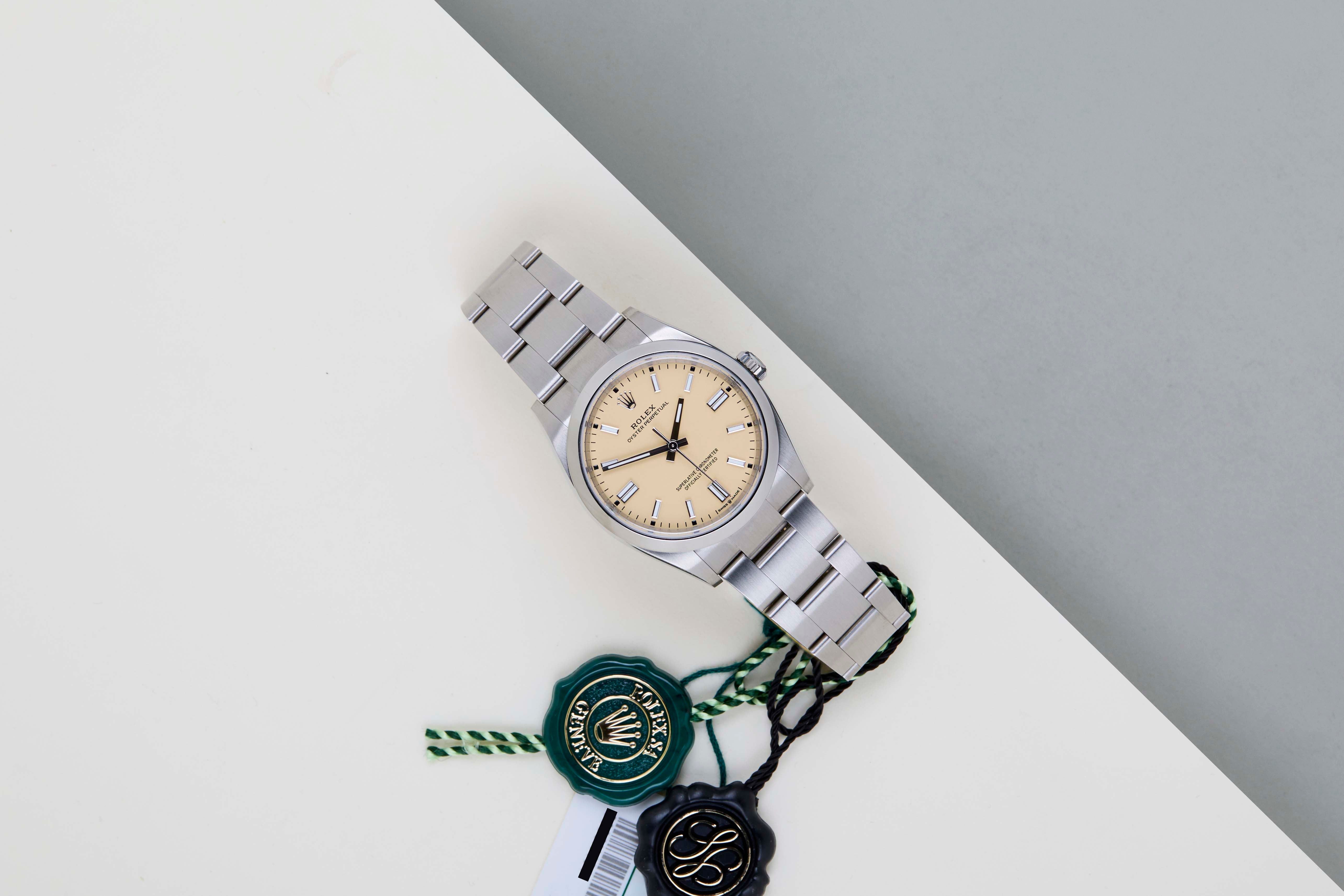 Full Set | International Rolex Warranty Until August 2030 | Including Rolex White TagThe Rolex Oyster Perpetual was first introduced by Rolex in the 1930s. It is characterized by its water-resistant Oyster case and self-winding Perpetual movement. The Rolex Oyster Perpetual a simple, yet elegant timepiece that is suitable for both casual and formal wear.This Rolex Oyster Perpetual 36 ‘Beige Dial’ was sold for the first time in August 2025.The watch is fully made out of stainless steel. Rolex uses 904L in it’s steel watches, which is an extremely resistant and highly polishable superalloy.This amazing Rolex Oyster Perpetual is in Mint Condition and comes with the original Rolex Warranty Card and Box. Furthermore, the watch still has Worldwide Rolex Warranty until August 2030.