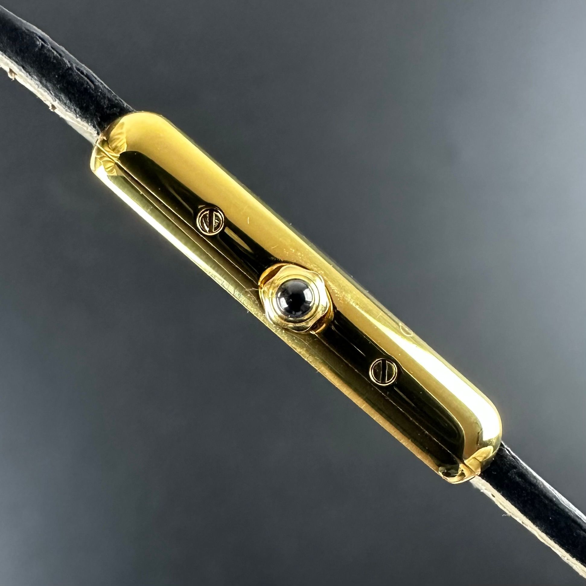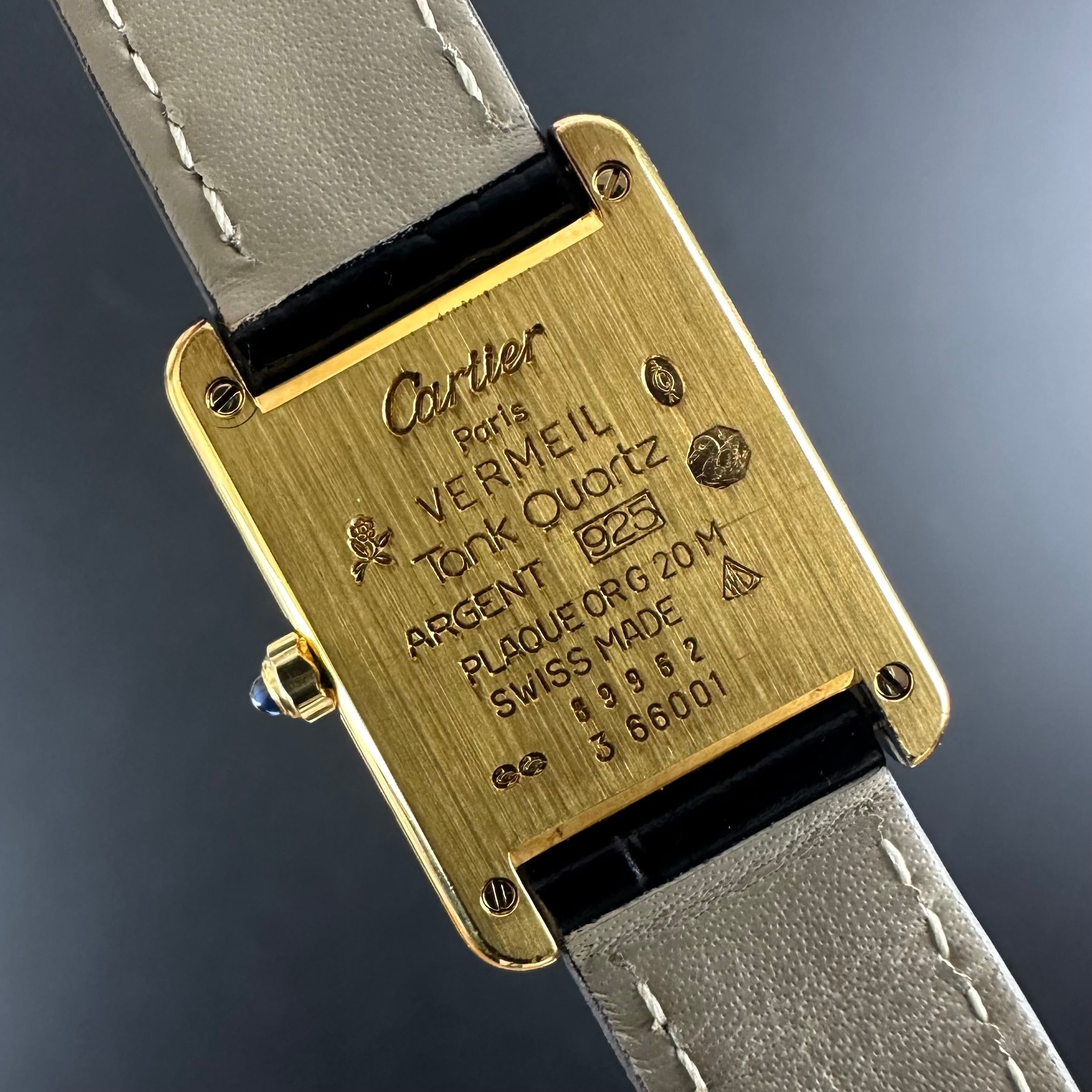This vintage Cartier Tank Vermeil, produced in the 1990s, features a beautiful bordeaux red dial in impeccable untouched condition, free from cracks / the spider dial effect. The gold plating on the case remains thick and even, with no fading, and the original mineral glass is scratch-free. Inside is a freshly serviced Cartier quartz movement. While designed for a lady’s wrist, it also suits a gentleman with a smaller wrist. The watch is paired with a black calf leather strap featuring an alligator grain motif. Overall condition is excellent.As we use a high-contrast lens. Any details and imperfections are highly visible. The dust particles on the pictures which are seen on the dial are barely visible with the naked eye.