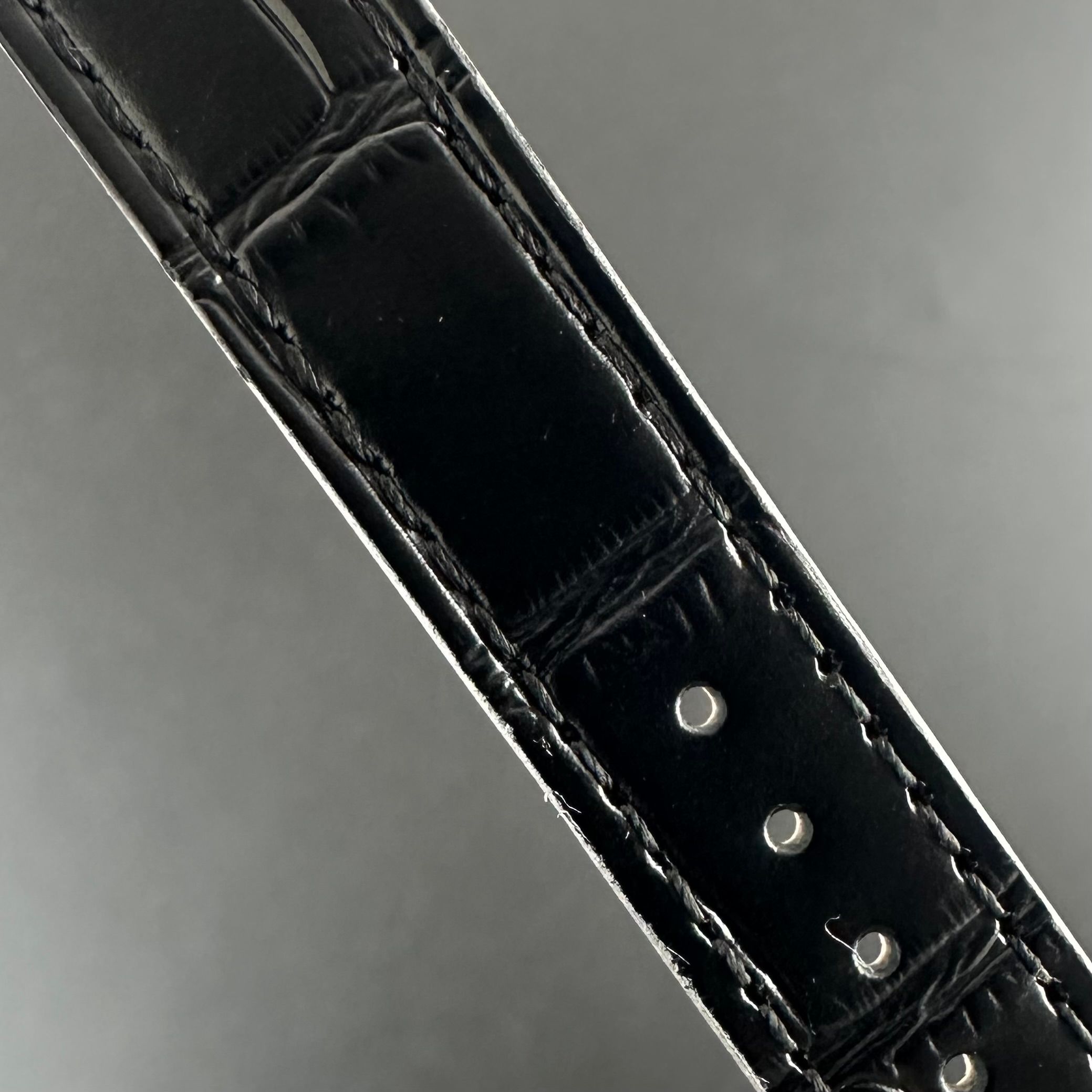 Bandje: Een zwarte kalfsleren band met alligatornerf. (Past voor een pols van 11 tot 19 cm)