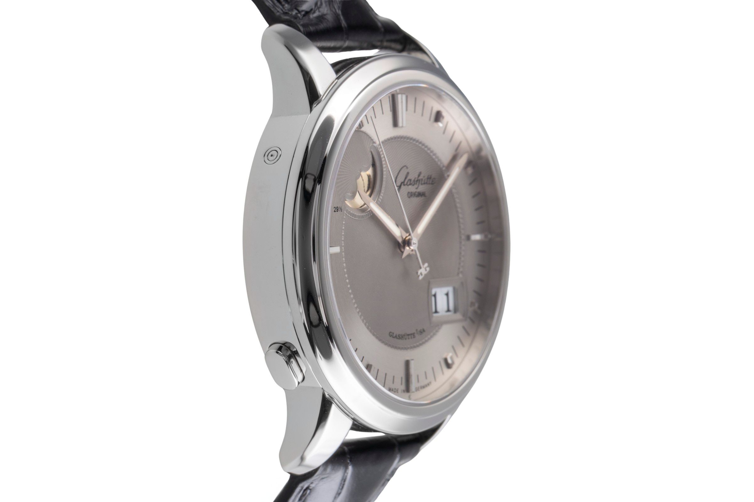 Alternative title: Glashütte Original 100-04-03-02-04 Senator PanoRama Date with Moon PhaseSteel on Strap with Grey Dial; Glashütte Original Senator Panoramadatum Mondphase Stahl Ref. 100-04-03-02-04 [2504331]