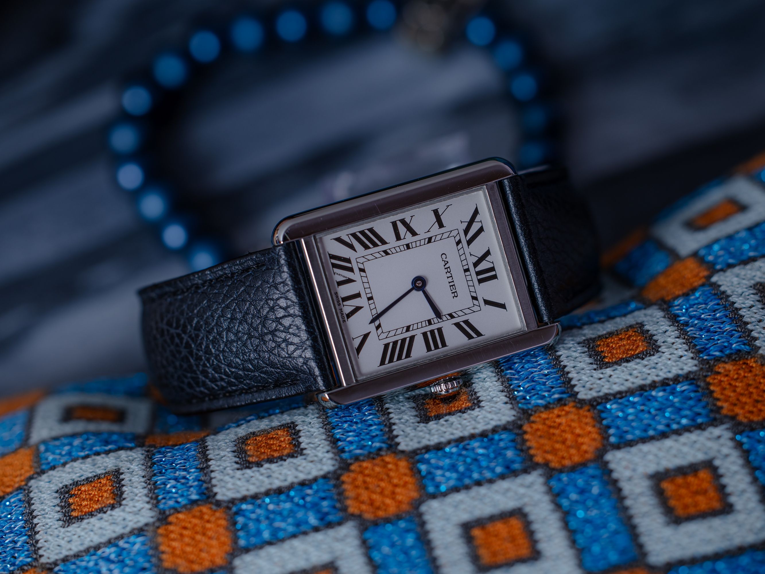 The watch captivates with its perfectly balanced proportions, making it an ideal choice for both men’s and women’s wrists. Its silvered dial with Roman numerals and thermally blued steel hands reflects Cartier’s unmistakable elegance and charm.