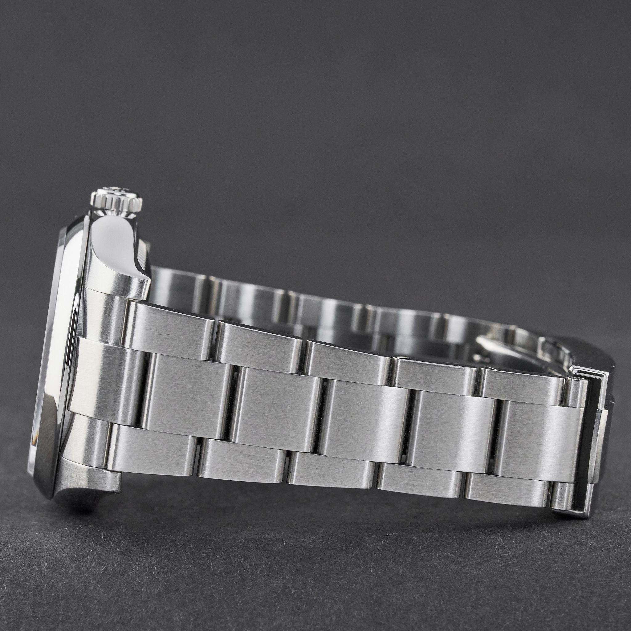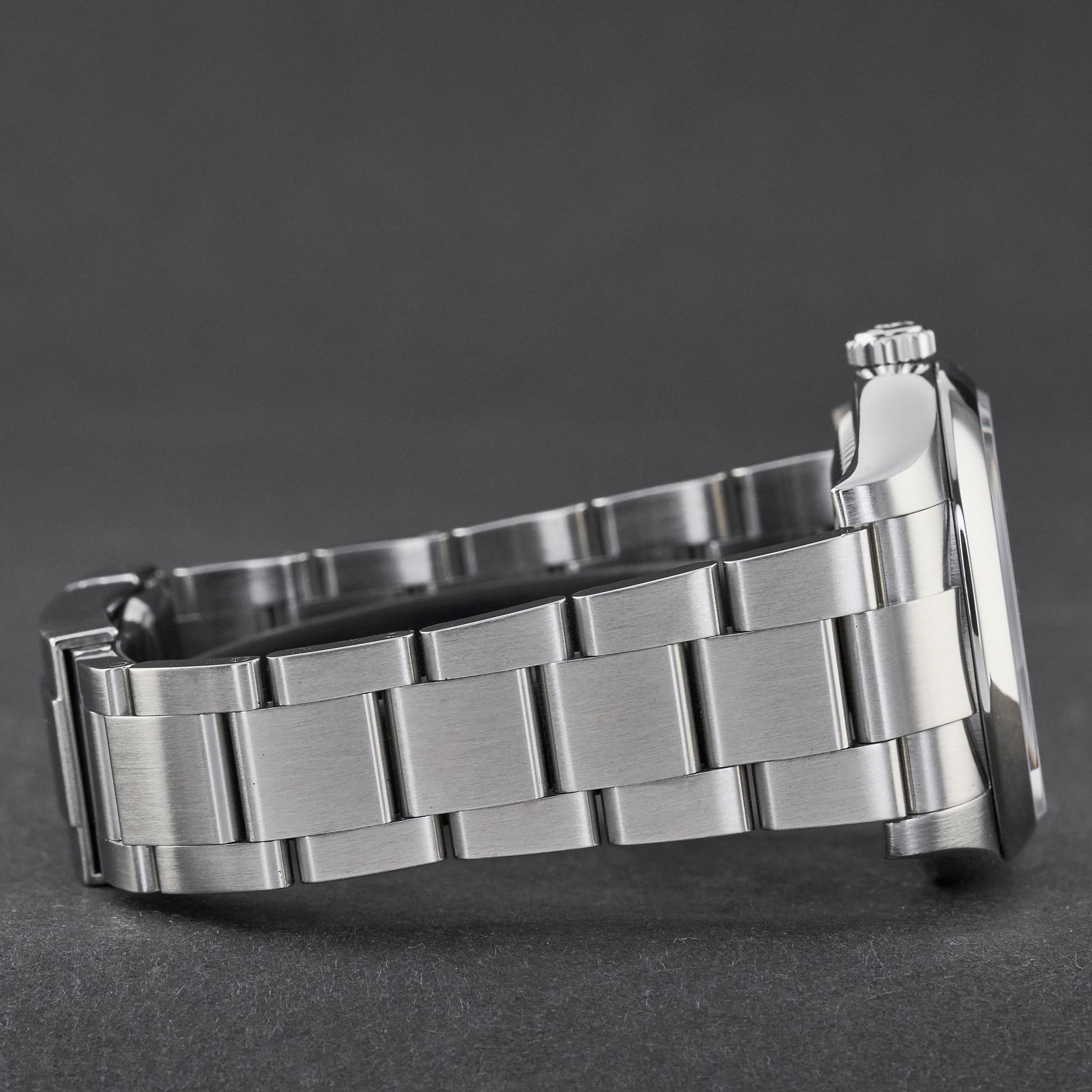 Deze Rolex Oyster Perpetual 116000 heeft een grijze wijzerplaat en is gemaakt van roestvrij staal, met een productiejaar van 2017.