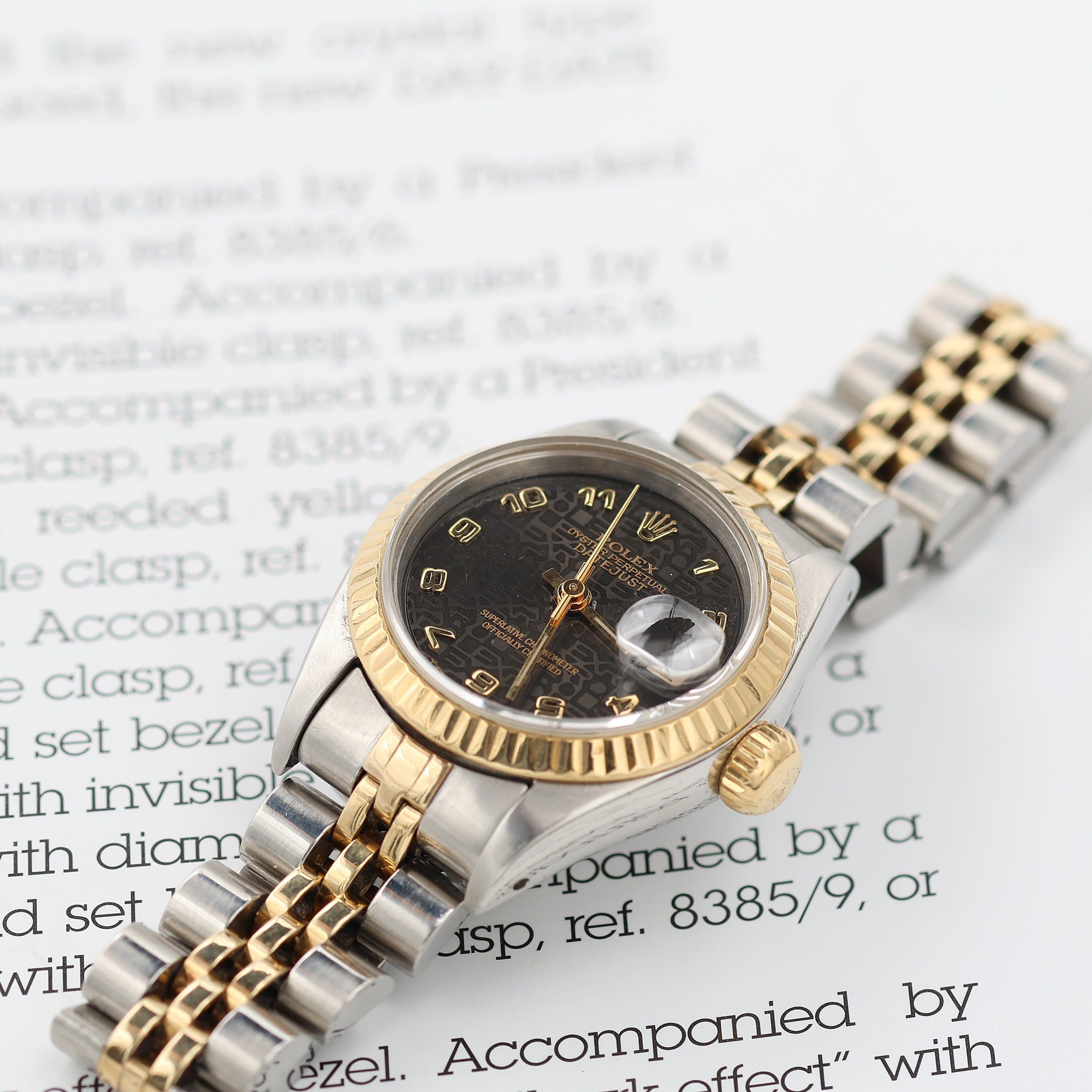 For sale at Debonar Watches: pre-owned Rolex Datejust Lady ref. 69173 on an Jubilee bracelet.It presents a beautiful brown dial with millennary pattern (often called "Jubilee").Feminine elegance at superlative, chronometer certified with a flawless and iconic accurate date display window: a perfect Rolex watch for women.It is one of the finest women’s watches, since 1957. The small 26mm dimensions make this model a manufacturing jeweler Rolex Jubilee Bracelet in agreement with 18k yellow gold and steel. The model is a compliment of sophisticated elegance, signed Rolex.Contact us in case of any doubts/inquiry. BRAND ROLEX MODEL DATEJUST LADY REFERENCE 69173 CASE MATERIAL STEEL/GOLD MOVEMENT AUTOMATIC DIMENSION 26 MM DIAL BROWN MILLENNARY BEZEL GOLD CRYSTAL SAPPHIRE BRACELET TYPE JUBILEE BRACELET MATERIAL STEEL/GOLD BRACELET LENGHT 16 CM ORIGINAL BOX NO ORIGINAL PAPERS NO YEAR APPROX. THE '90s CONDITION VERY GOOD