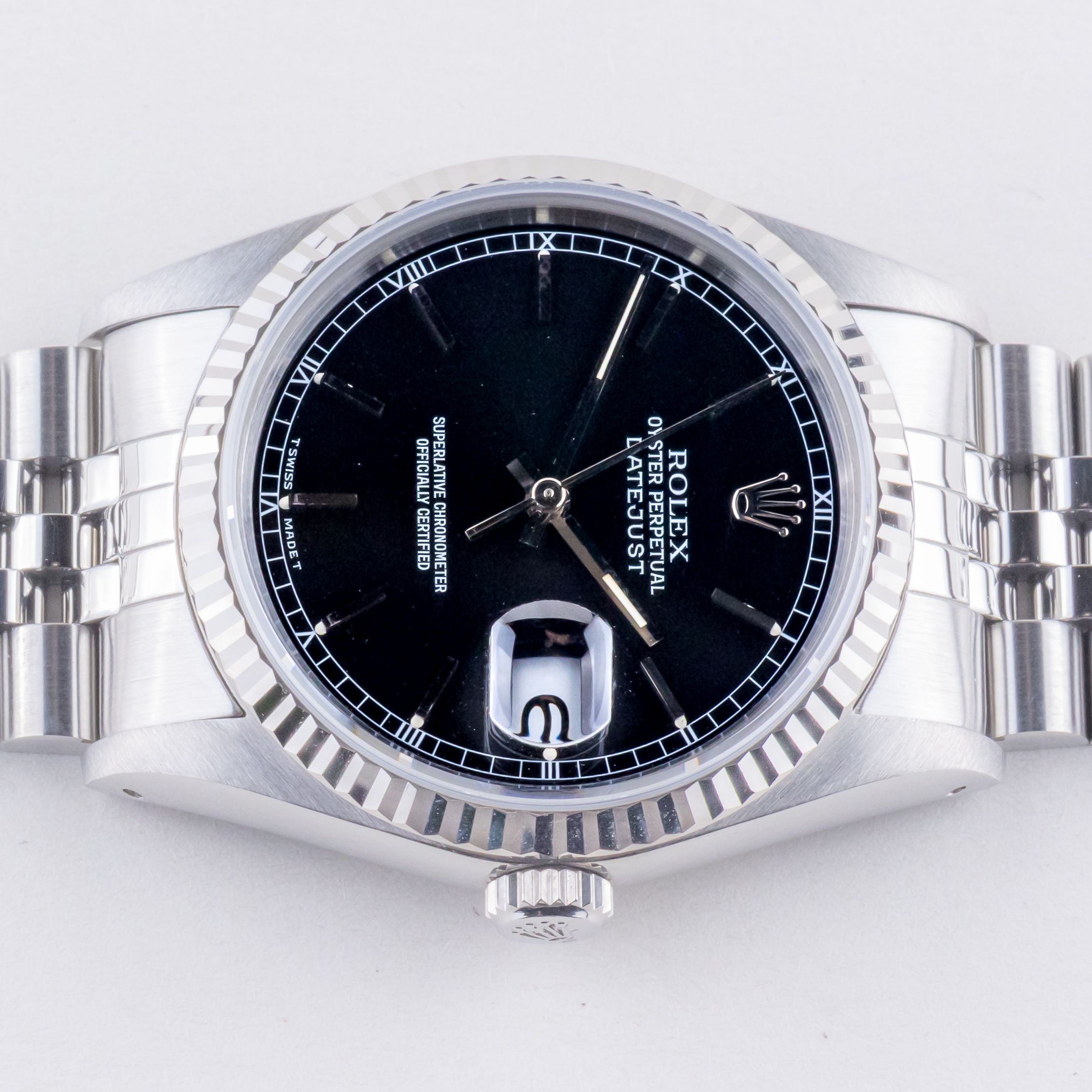 Rolex Oyster Perpetual Datejust reference 16234 from 1993 including full set. The Datejust 16234 Datejust measures a 36mm stainless steel case, a stainless steel Jubilee bracelet and a fluted 18k white gold bezel. This Datejust 16234 features an automatic movement caliber 3135 with quickset date function, a scratch resistance sapphire crystal and a black dial with tritium hands.Every pre-owned watch we sell, comes with a 12-month warranty from the date of purchase. Every watch sold by Langedyk Vintage Watches is included with a LVW watch box, Authenticity report and free worldwide (insured) shipment.