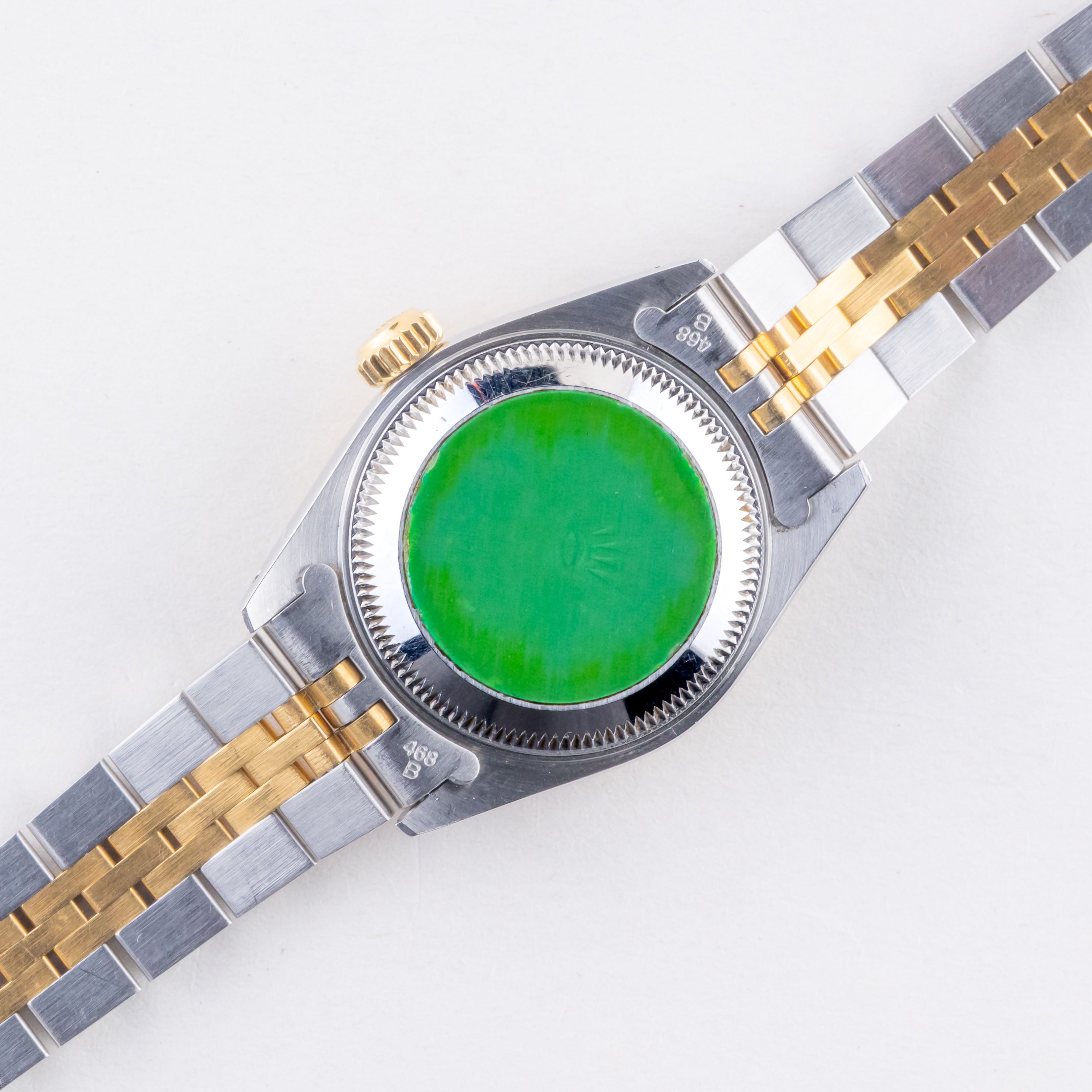 Rolex Oyster Perpetual Lady-Datejust referentie 69173 uit 1989. De Lady-Datejust 69173 heeft een 26mm gouden en roestvrijstalen kast, een twee-tone jubilee armband en een gefluteerde 14k gouden lunette. Deze Lady-Datejust 69173 beschikt over een automatisch uurwerk caliber 2135 met een snelle datumfunctie, een krasbestendig saffierglas en een witte Buckley wijzerplaat met tritium wijzers en Romeinse indexen.