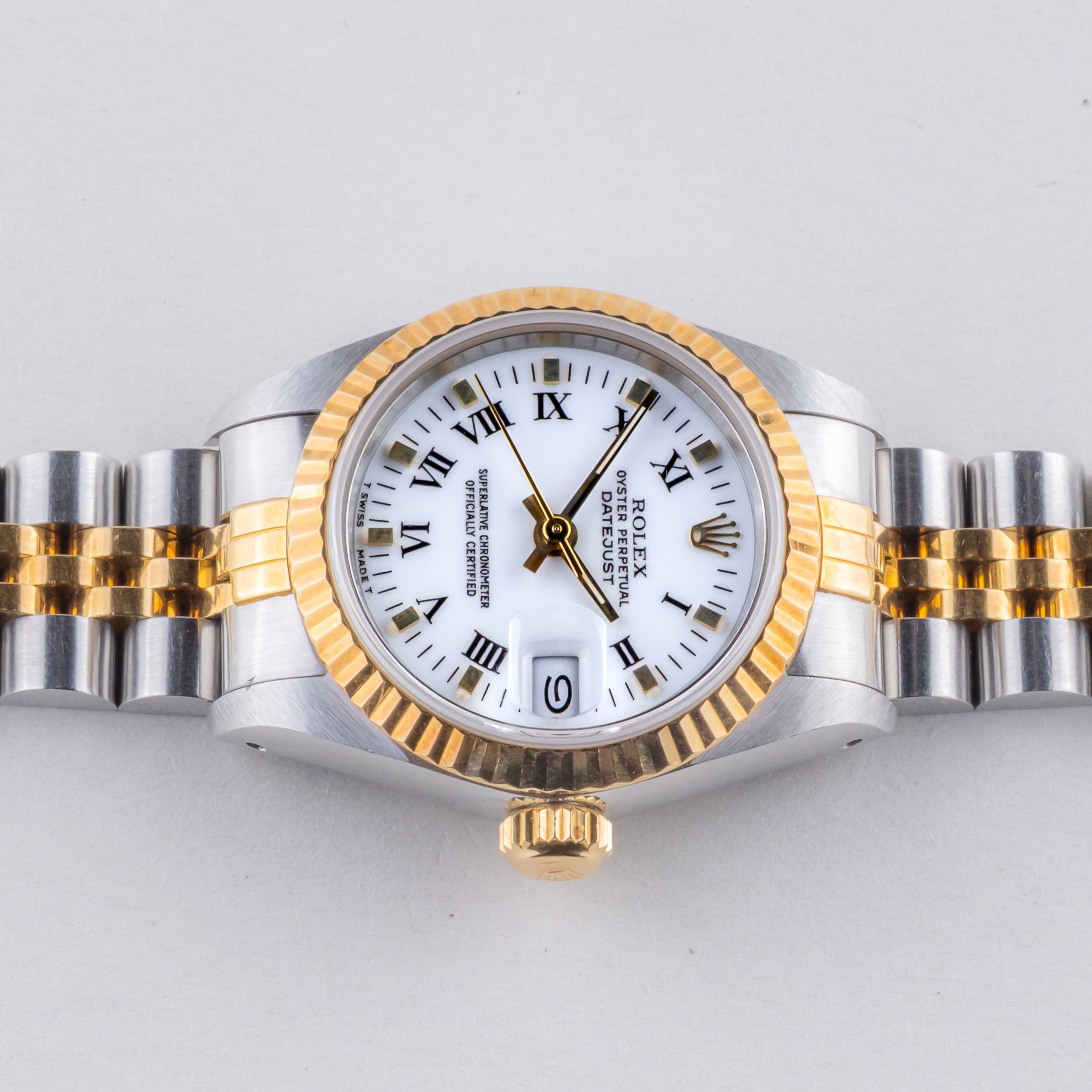 Rolex Oyster Perpetual Lady-Datejust reference 69173 from 1989. The Lady-Datejust 69173 measures a 26mm gold and stainless steel case, two-tone jubilee bracelet and fluted 14k gold bezel. This Lady-Datejust 69173 features an automatic movement caliber 2135 with quickset date function, a scratch resistance sapphire crystal and a white Buckley dial w/ tritium hands and Roman markers.Every watch sold by Langedyk Vintage Watches is included with a LVW watch box, Authenticity report and free worldwide (insured) shipment. In addition, every pre-owned watch is offered with our 12-month warranty from the date of purchase.