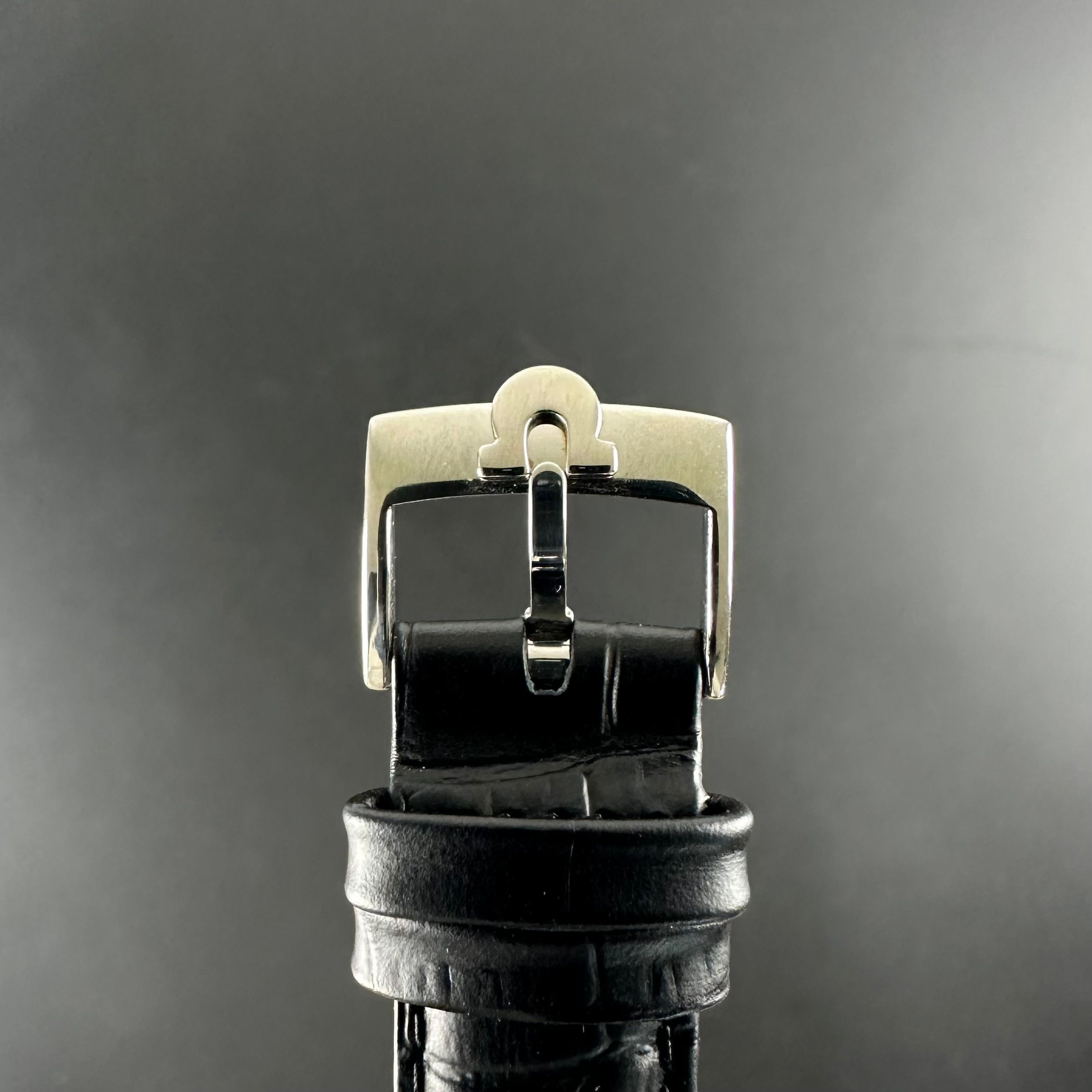 Strap: A black calf leather strap with a crocodile grain. (Fits a 11 to 19cm wrist)