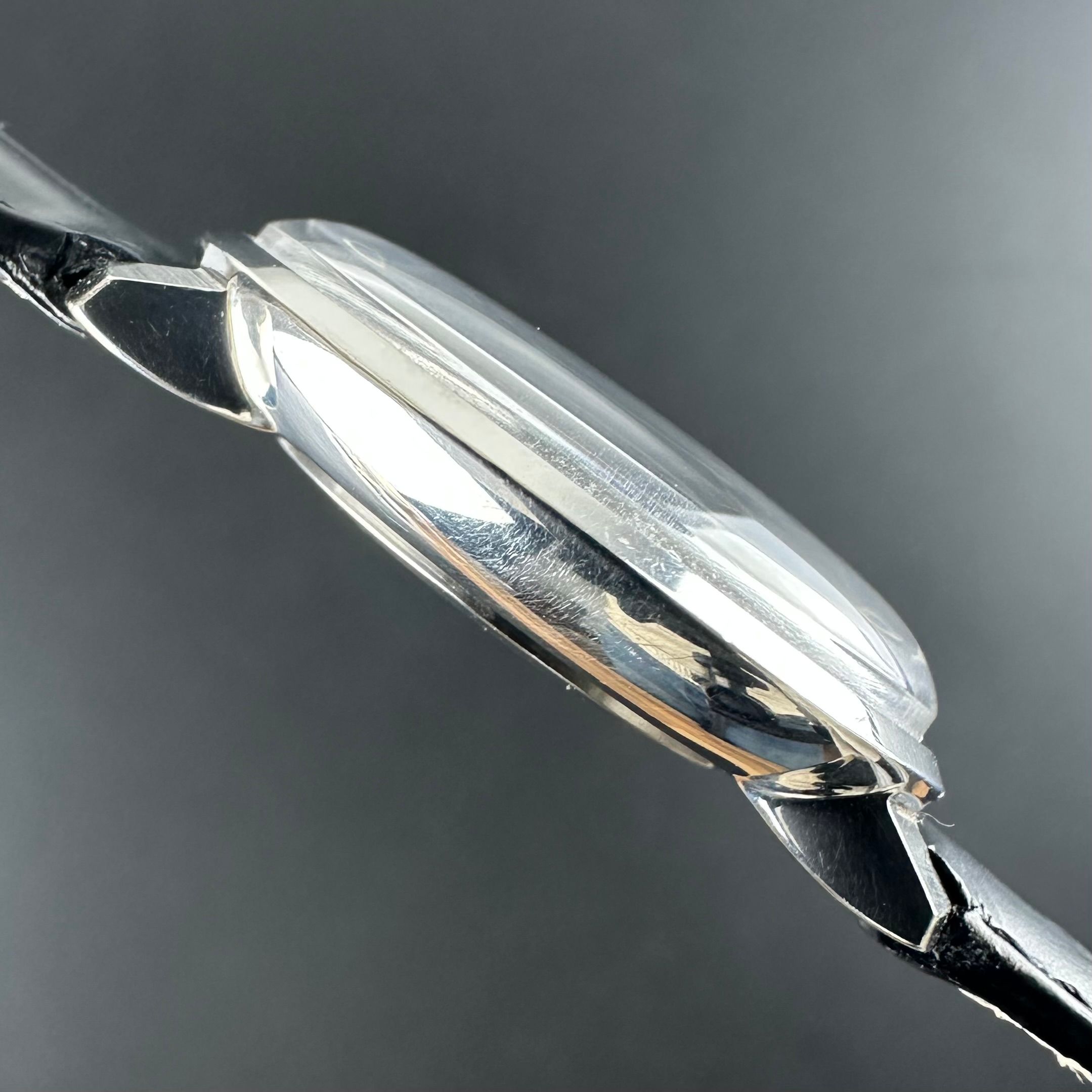 Deze vintage Omega De Ville, geproduceerd in 1973, heeft een onberispelijke zilveren verticaal geborstelde wijzerplaat met zwarte stick wijzers en zilveren uurmarkeringen die zijn geaccentueerd met zwarte lak. Hij komt in een 33mm roestvrijstalen kast met een kaliber 625 handopwindmechanisme, dat in oktober 2025 is onderhouden en momenteel uitstekend loopt. Het horloge is voorzien van een zwarte matte kalfslederen band met krokodillenstructuur. De algehele staat is uitstekend.