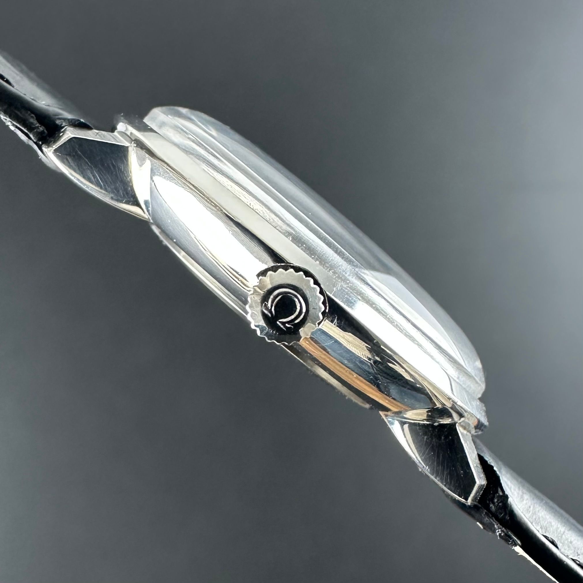 This vintage Omega De Ville, produced in 1973, features an impeccable silver vertically brushed dial with black stick hands and silver hour markers accented in black lacquer. It comes in a 33mm stainless steel case housing a caliber 625 manual wind movement, serviced in October 2025 and currently running excellently. The watch is paired with a black matte calf leather strap featuring a crocodile grain. Overall condition is excellent.Year of production: 1973