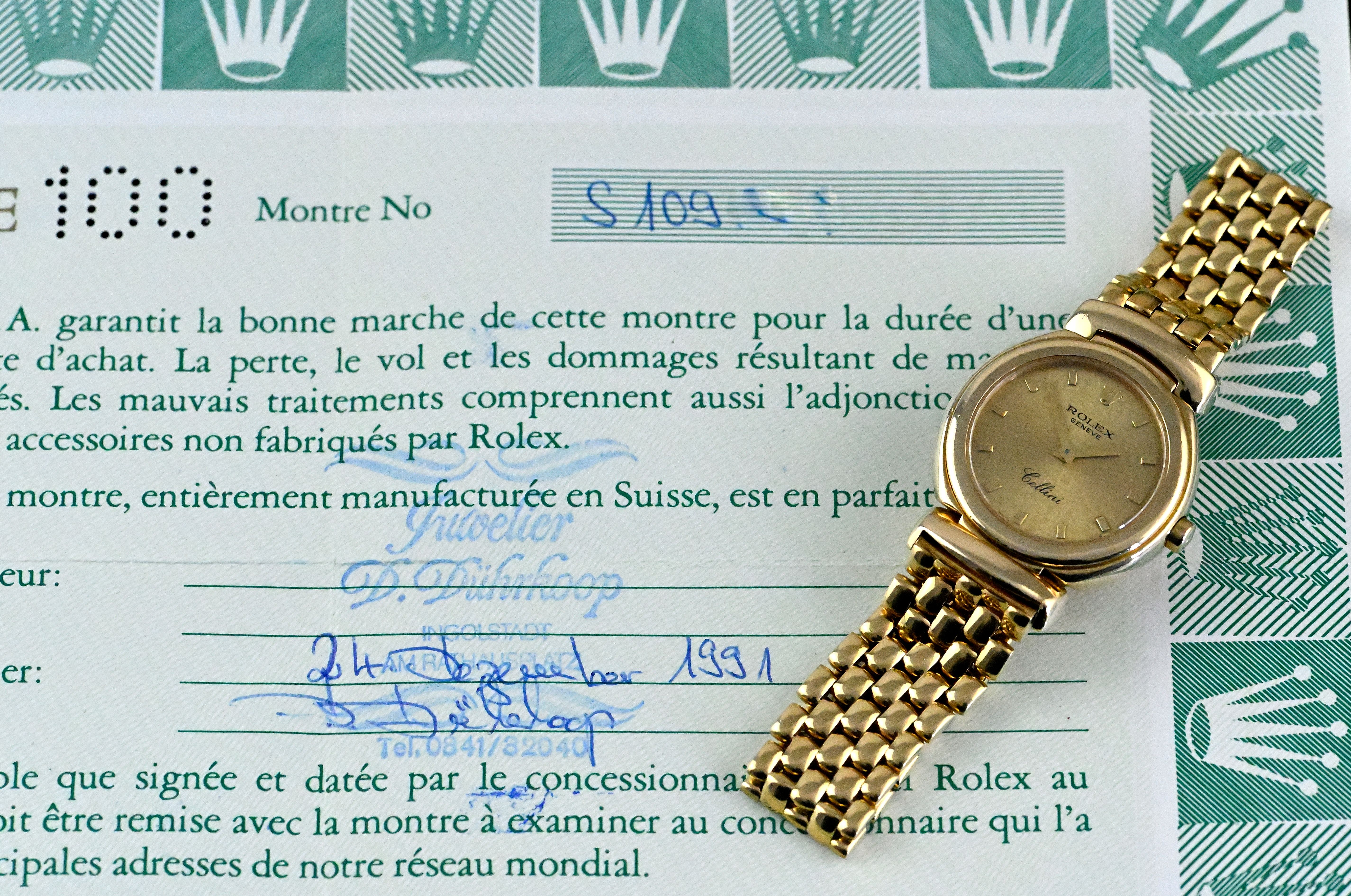 Classic Rolex Cellini | reference 6621/8 | in 18k yellow gold | with original Rolex gold bracelet with folding clasp both also in 18k yellow gold | Rolex Quartz calibre 6620 | diameter of 26 mm | champagne dial | inner circumference of the bracelet with watch is 17 cm | total weight of 69.7 grams | good and worn condition | comes with the original warranty certificate LC100 (sold on 24 December 1991 by the jeweller Dührkoop – Germany) – brown Rolex leather case – Cellini booklet.
