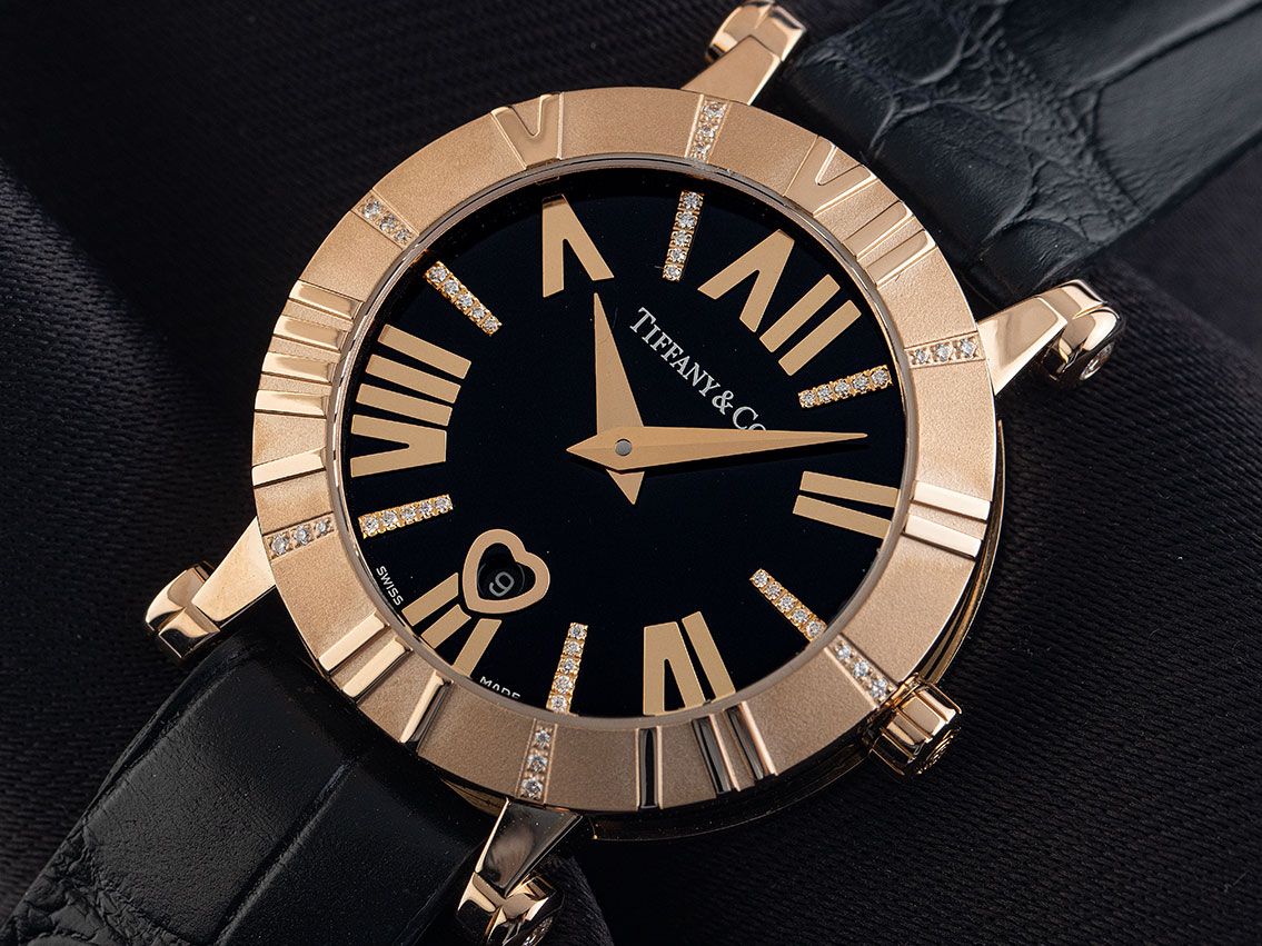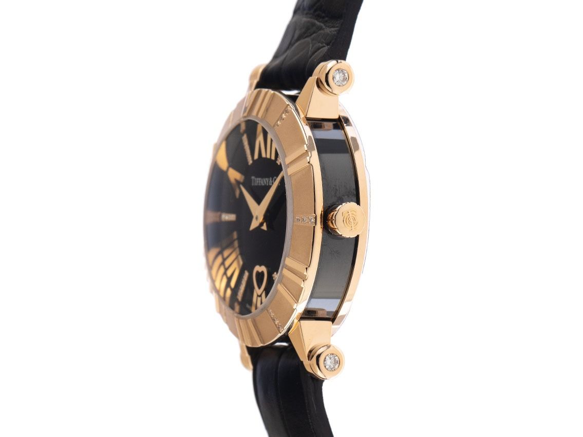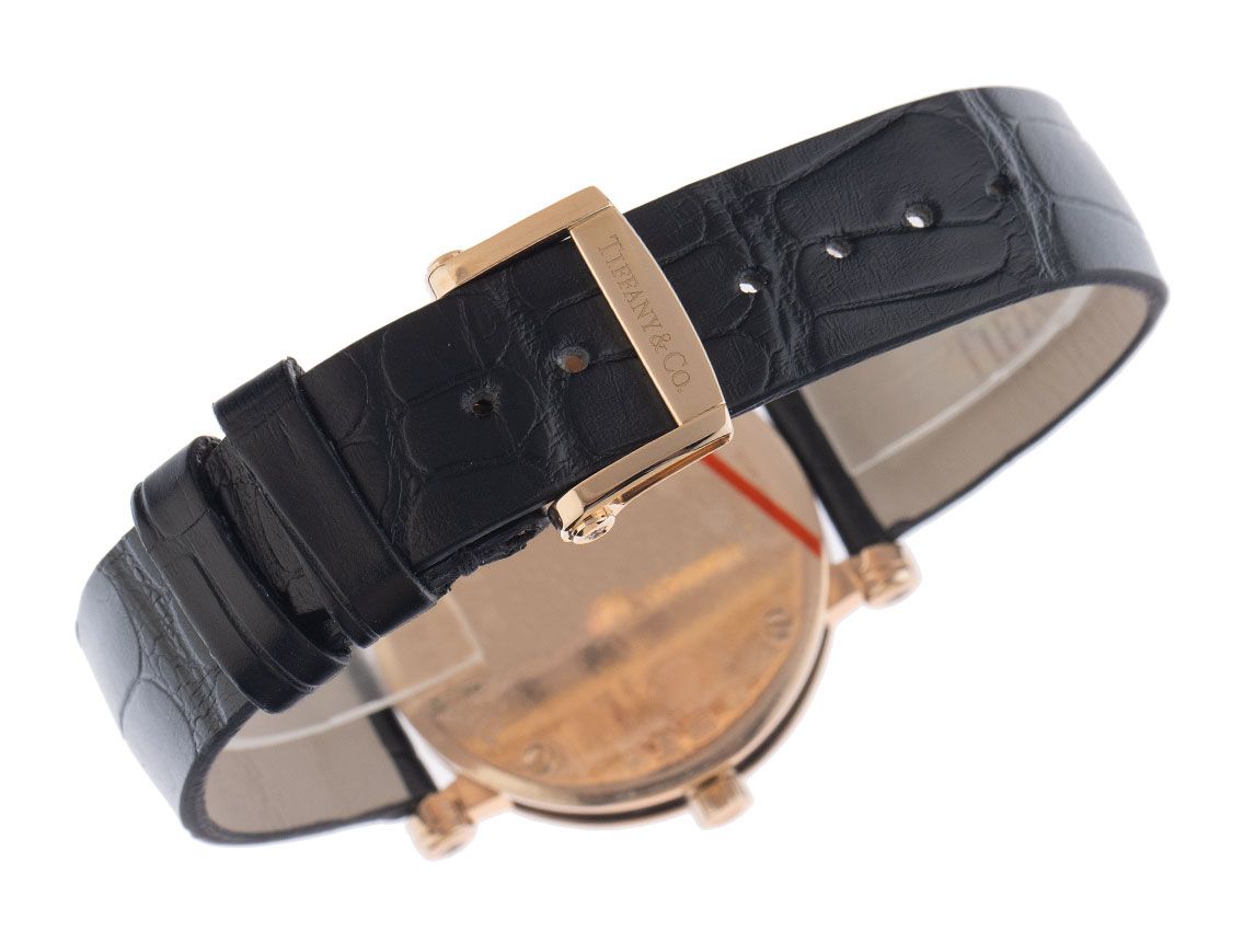 Behuizing 18kt Roségoud gepolijst en satijn met keramische inzetstukken aan de zijkanten, behuizingsdiameter zonder kroon 30mm, behuizingshoogte 9,7mm. Lunette 18kt Roségoud satijn met gepolijste Romeinse cijfers en bezet met diamanten. Armband van zwart leer, aanzetbreedte 13mm, bandaanzetten bezet met diamanten, Tiffany & Co. dubbele vouwsluiting van 18kt Roségoud met fabrikantlogo. Wijzerplaat zwart met opgezette roségouden Romeinse cijfers, diamantindexen en roségouden wijzers. Uurwerk quartzgestuurd, kaliber Q256.041 met 6 edelstenen. Weergave van uur en minuut via centrale wijzers, datumaanduiding in hartopening bij 6 uur. Saffierglas krasbestendig en gewelfd. Kroon van 18kt Roségoud met fabrikantlogo. Achterkant 18kt Roségoud 4-voudig geschroefd en gegraveerd. Gewicht van het horloge inclusief armband 56g. Referentienummer: 13011, behuizingsnummer: T10013XXX, bouwjaar: 2015, ID: P173037641025H-7950, artikelnummer: 10000082666. Met gangcontrole, nieuwe batterij en volledige uiterlijke opfrissing van oktober 2025. Originele Tiffany doos met omdoos en beschrijving, evenals een uittreksel van het Watchregister van oktober 2025, The Watch Register certificaat / zonder vermelding (Internationale database voor verloren of gestolen horloges). Superscherpe aanbieding, investering met waardevermeerderingspotentieel, extreem zeldzaam verzamelobject, bijna niet gedragen. Als nieuw. Leveringstijd direct.