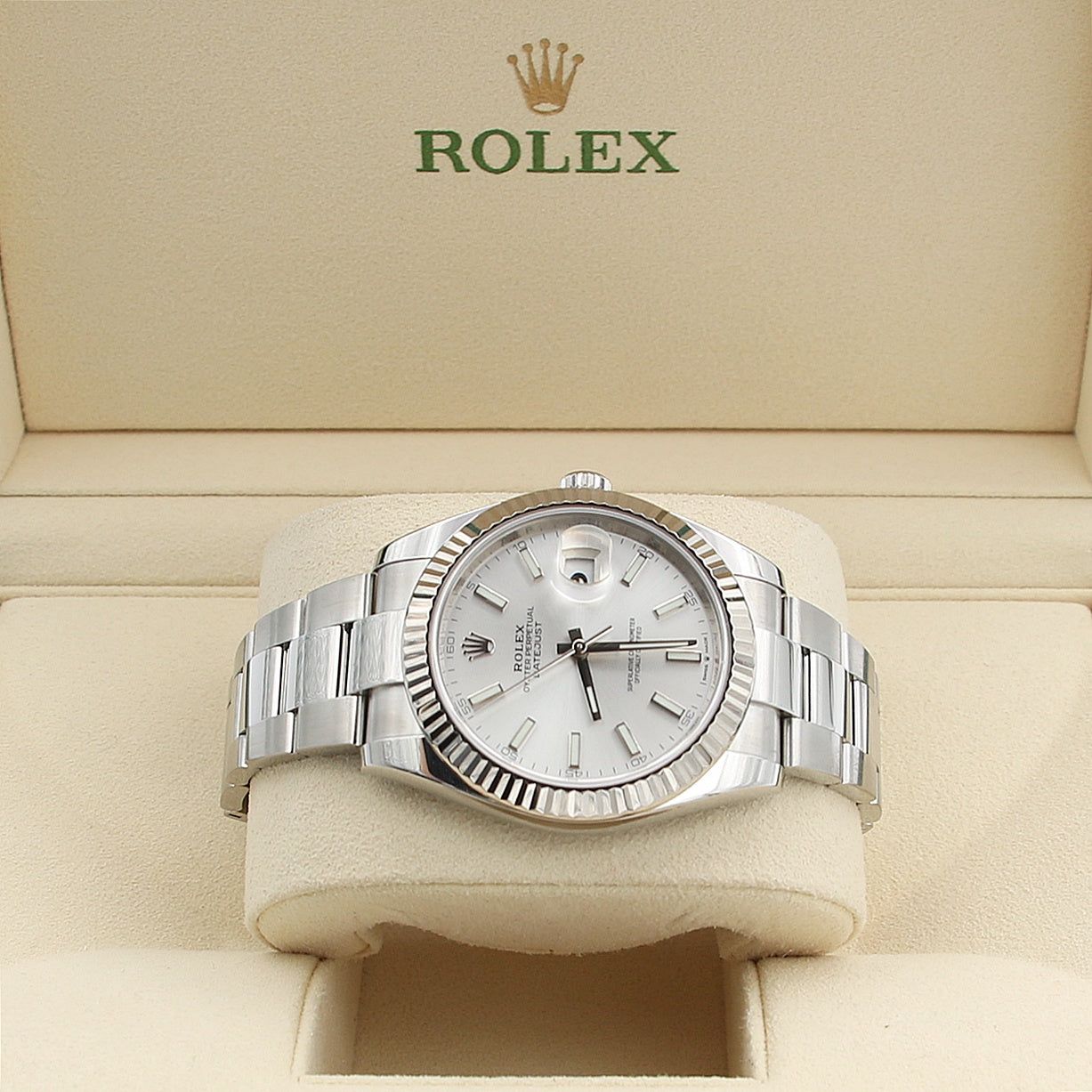 Te koop bij Debonar Watches: tweedehands Rolex Datejust ref. 126334, compleet set, met een prachtige zilveren wijzerplaat op een Oyster-armband. Een elegante sporthorloge? Een robuust dresswatch? Een casual horloge? Noem het zoals je wilt, de Rolex Datejust is simpelweg de definitie van de allrounder. Zoals de naam al aangeeft, komt hij in een 41mm Oyster kast. Die is waterdicht tot een diepte van 100 meter (330 voet). Dat is te danken aan het gepatenteerde Twinlock dubbele waterdichtheidssysteem van het merk. De opwindkroon draait tegen de kast om een veilige afsluiting te garanderen. Het glas, met de iconische Cyclops-lens op 3 uur voor een gemakkelijke aflezing van de datum, is van saffier. De middenkast is uit een massief blok 904L staal vervaardigd met een bezel van witgoud.