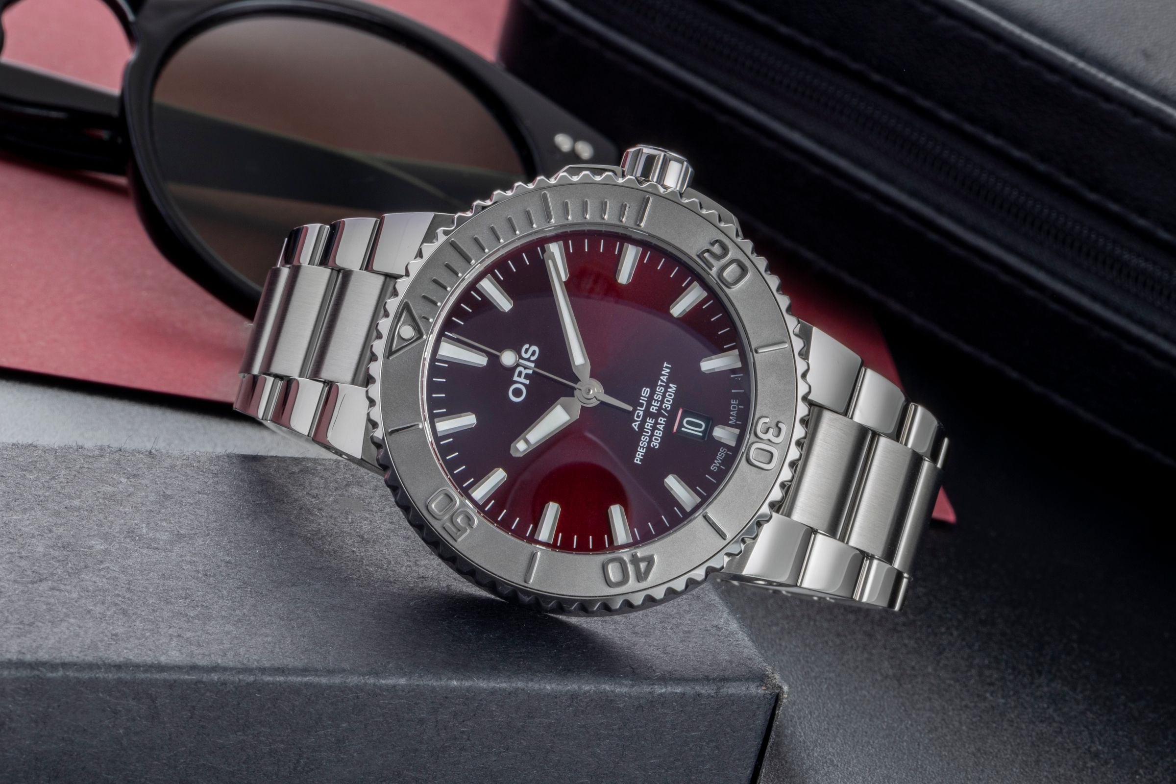 Alternative title: Oris 01 733 7766 4158-07 8 22 05PEB Aquis Date Relief; Oris Aquis Date Stahl Red Dial Automatik Herrenuhr Ref 01 733 7766 4158 B&P 2021 [2504921]