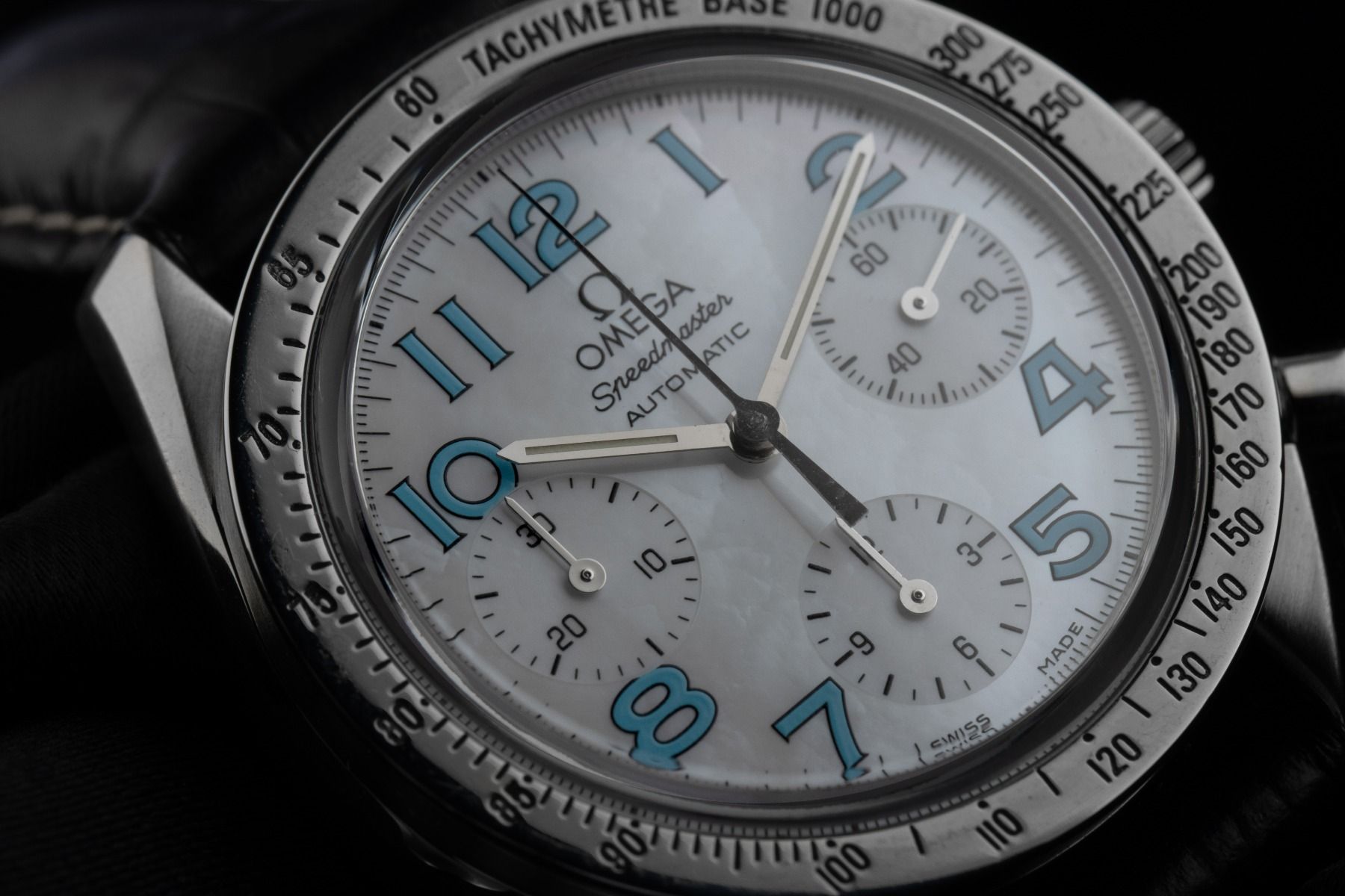 Omega Speedmaster Reduced Staal Parelmoer Automatisch Chronograaf Armband Krokoleder