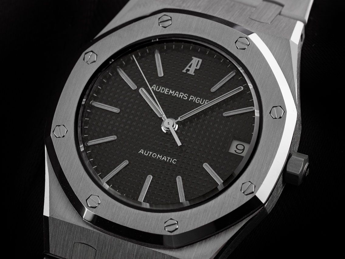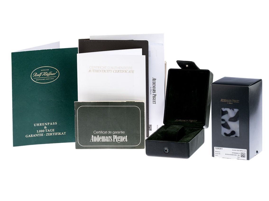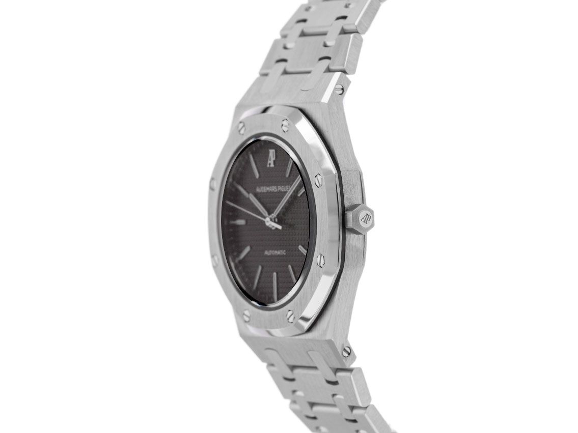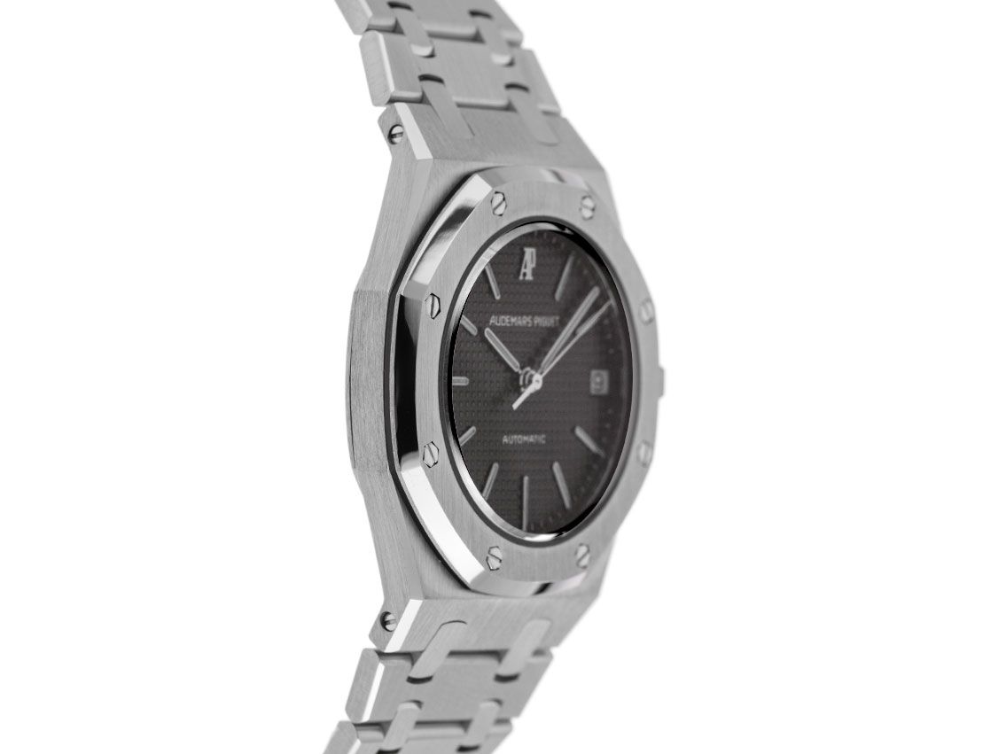 Gehuis van gepolijst en satijn afgewerkt roestvrij staal, behuizingsdiameter zonder kroon 36mm, behuizingshoogte 8,1mm. Lunette van gepolijst en satijn afgewerkt roestvrij staal, 8-hoekig met 8 schroeven vastgezet. Armband van gepolijst en satijn afgewerkt roestvrij staal, verborgen dubbele vouwsluiting van roestvrij staal met fabrikantlogo. Wijzerplaat zwart met wafelpatroon, met opgezette witgouden luminescerende indexen en witgouden luminescerende wijzers. Uurwerk automaat, Audemars Piguet Kaliber 2123 met 33 edelstenen. Weergave van uur, minuut en seconde via centrale wijzers met seconde-stop voor nauwkeurige tijdinstelling, datumaanduiding met snelle aanpassing op 3 uur. Saffierglas krasbestendig. Kroon met fabrikantlogo. Achterkant van roestvrij staal 8-voudig geschroefd en gegraveerd. Gewicht van het horloge inclusief armband 99g, lengte van de armband inclusief behuizing 195mm. Referentienummer: 14100ST.OO.0477ST.01, behuizingsnummer: B19534-K85080-0XXX, ID: P949718000ST148001124H-42000, artikelnummer: 10000075481. Originele Audemars Piguet doos en garantiepapieren van december 1980 evenals beschrijving. Inclusief Audemars Piguet revisie met bewijs van 7400€ van oktober 2024 en reparatierapport, Full Set. Superscherpe aanbieding, investering met waardevermeerderingspotentieel, extreem zeldzaam verzamelobject, kluis horloge. Als nieuw. Leveringstijd direct.