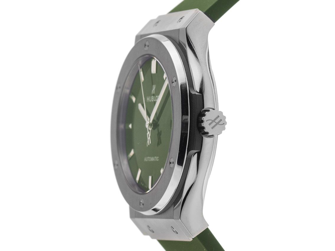 Hublot Classic Fusion Titan Automatik Armband Kautschuk FaltschließeGehäuse Titan poliert und satiniert, Gehäusedurchmesser ohne Krone 45mm, Gehäusehöhe 10,7mm. Lünette Titan poliert und satiniert, 6-fach verschraubt. Armband Kautschuk grün, Anstoßbreite 25mm, Sicherheitsfaltschließe Titan mit Hersteller-Logo. Zifferblatt grün mit aufgesetzten Edelstahl Indexen und Edelstahl Zeigern. Uhrwerk Automatik, Kaliber HUB1112 mit 25 Edelsteinen, Gangreserve ca. 42 Stunden. Anzeige von Stunde, Minute und Sekunde über Zeiger aus der Mitte mit Sekundenstopp zur sekundengenauen Einstellung der Uhrzeit, Datumsanzeige mit Schnellverstellung bei 3 Uhr. Saphirglas kratzfest. Krone mit Hersteller-Logo. Boden Titan 6-fach verschraubt und graviert mit Saphirglas Sichtfenster. Gewicht der Uhr inklusive Armband 99g. Wasserdicht bis 5 ATM. Referenznummer: 511.NX.8970.RX, ID: ST1160114560625H-8200, Artikelnummer: 10000080629. Original Hublot Box und Garantie Aktivierung mit Link von 2025, Full Set. Ungetragen. Lieferzeit sofort.