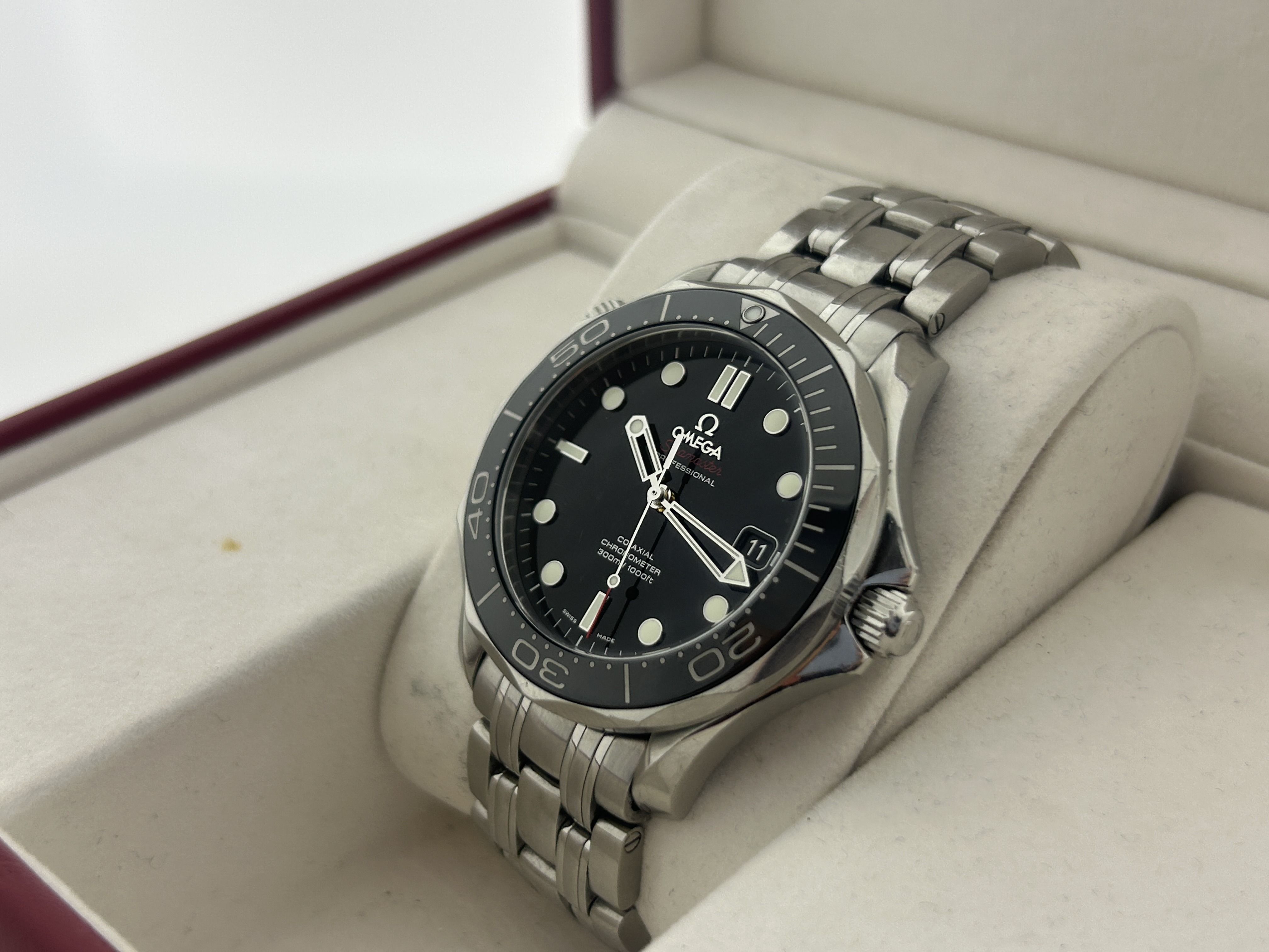 Een Omega Seamaster Diver horloge, ref. 212.30.41.20.01.003, fullset, uit 2014. Het horloge heeft een stalen kast van 41 mm, met een stalen armband. Het horloge heeft een zwarte wijzerplaat met een datvenster op 3 uur. De Omega Seamaster Diver wordt geleverd met de originele doos en het certificaat. Het horloge heeft zichtbare krassen.