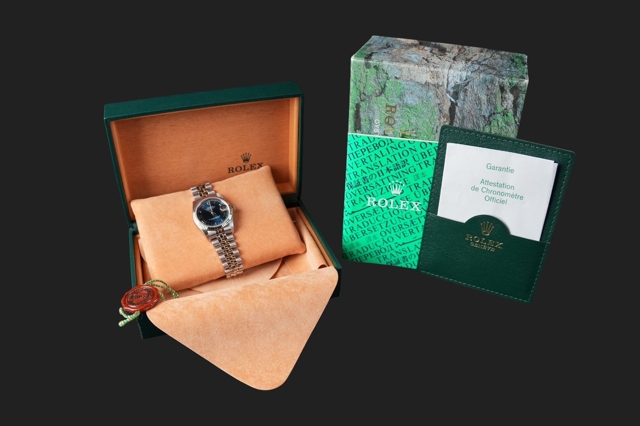 Dial colour is blue.Originally sold by Rolex 08/2005, LC410 (Japan).