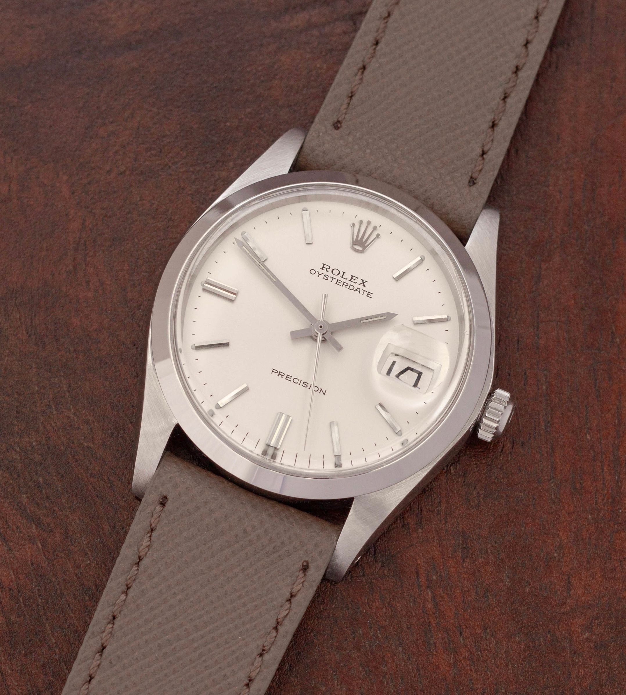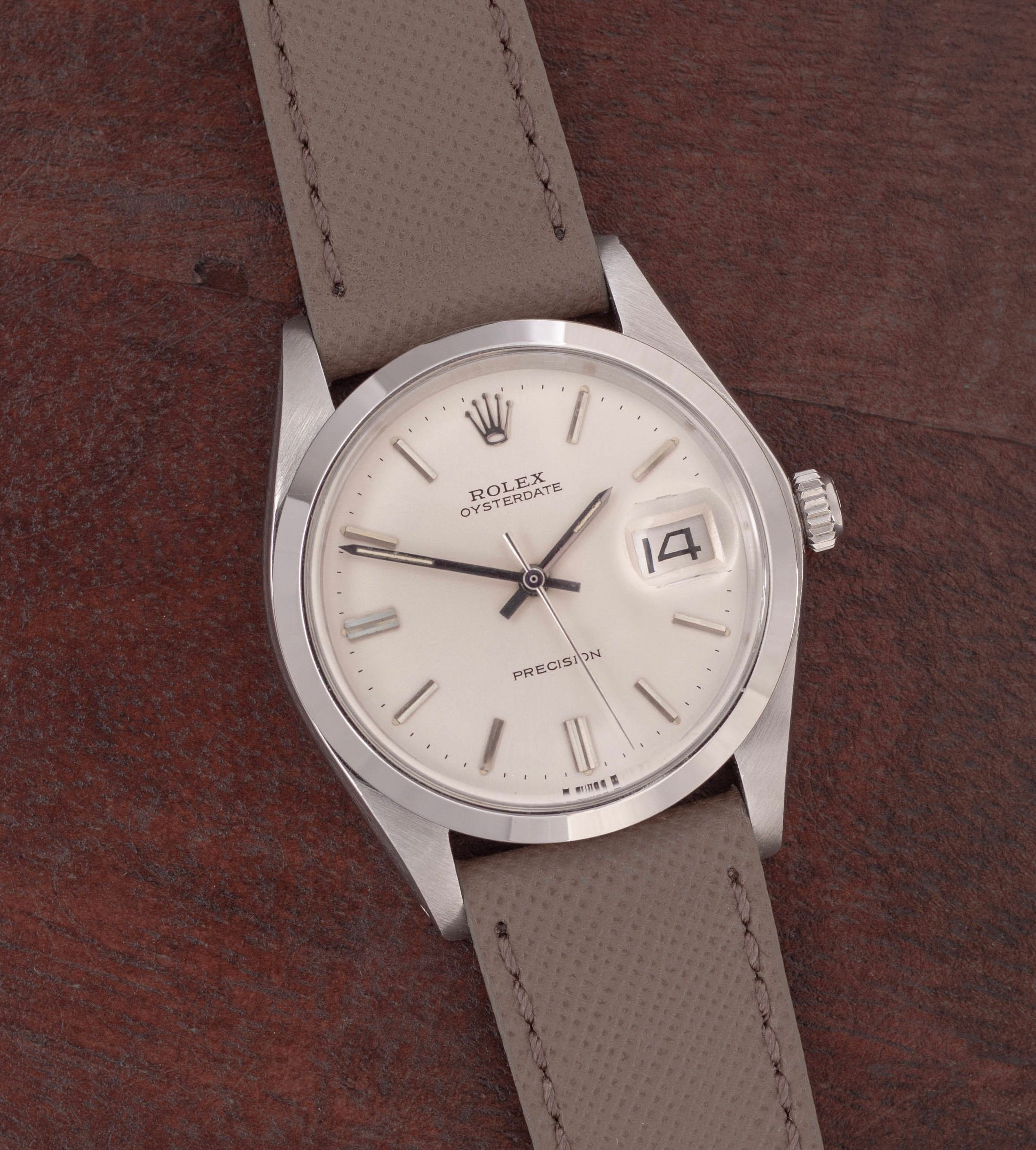 The reliable, manual-winding Rolex caliber 1225 movement of this Oysterdate 6694 has been checked and keeps time perfectly, so there was no need for a service this time. Furthermore, this beautiful vintage Rolex watch is equipped with a taupe-colored leather strap and, of course, a steel Rolex buckle. In our opinion, the Oyster Precision is the perfect, reliable watch as a first Rolex, or just to expand a collection, a perfect mix of classic and sporty!